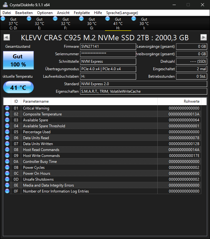Zur Anzeige der technischen Daten nutzen wir das Tool CrystalDiskInfo: