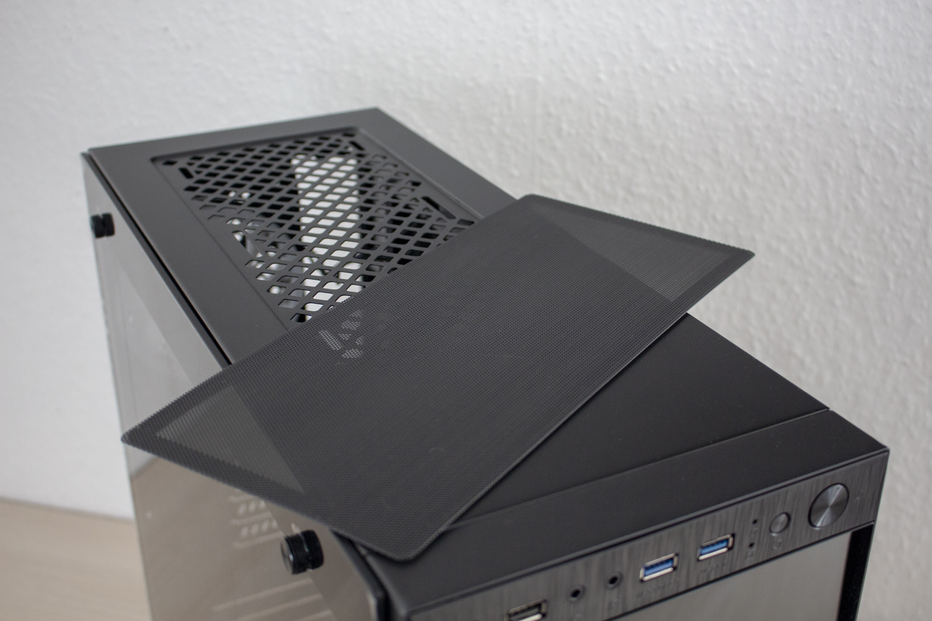 Die Deckelpartie ist beim Horizon recht unspektakulär gestaltet. Der größte Teil des Deckels zeichnet sich durch eine Lüfteröffnung für zwei Lüfter mit einer Rahmenbreite von 120 mm aus. Zum Schutz vor Staub und zur Verbesserung der Optik gehört zum Lieferumfang zudem noch ein magnetischer Staubfilter aus Mesh, der die Lüfteröffnungen verdeckt.