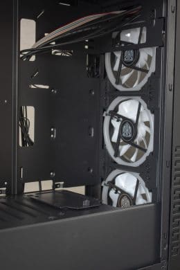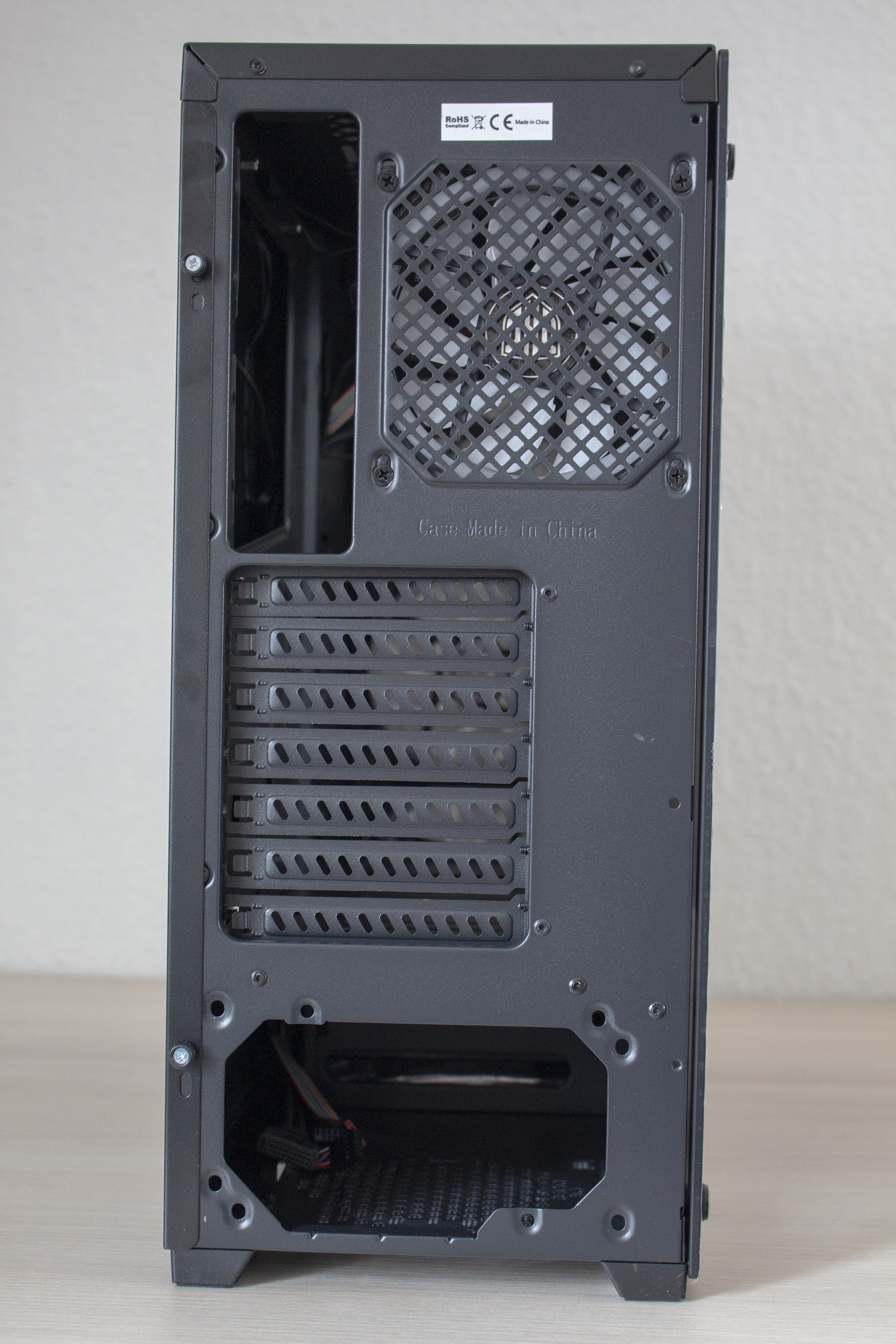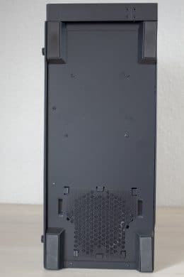 Boden und Heck bieten hingegen keine außergewöhnlichen Features. Das Horizon steht auf soliden Kunststofffüßen und verfügt über einen Mesh-Staubfilter für das Netzteil, dessen Ausbau sich aber recht kompliziert gestaltet. Das Netzteil wird dementsprechend unten montiert und darüber finden sich die sieben PCI-Slotblenden die innerhalb des Gehäuse verschraubt werden und wiederverwendbar sind. Um die RGB-Effekte abzurunden verfügt das Horizon im Heck darüber hinaus noch über einen vierten RGB-Lüfter.