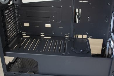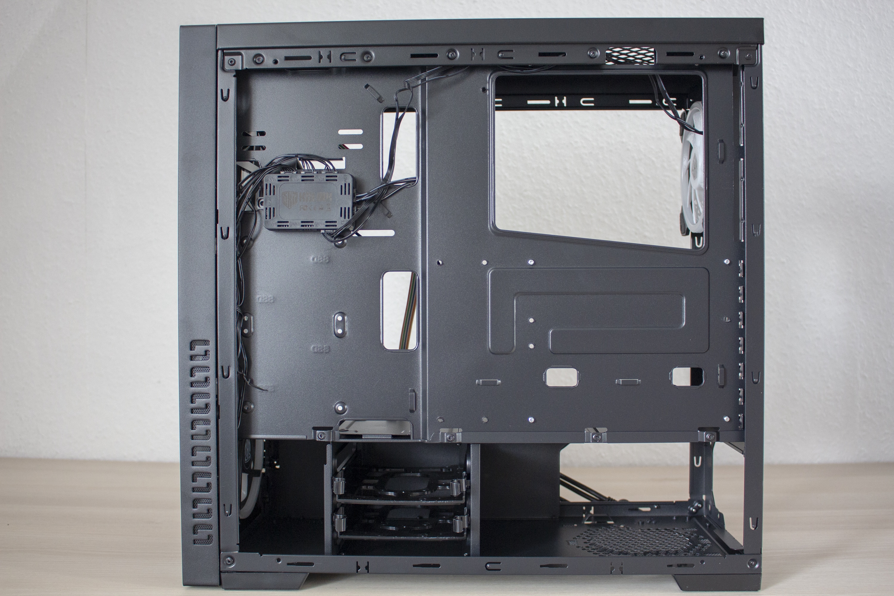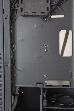 Der Innenraum des Kolink Horizon zeichnet sich vor allem durch sehr viel Platz und eine offene Raumgestaltung aus. Im unteren Bereich wurde eine Abdeckung angebracht, durch die der Midi-Tower in zwei Bereiche unterteilt wird und somit das Netzteil, der HDD-Käfig und die Verkabelung verdeckt werden. Zusätzlich bietet die Abdeckung eine Montagemöglichkeit für eine SSD und einen Ausschnitt, um auch dickere Radiatoren in der Front befestigen zu können. Oberhalb der Blende werden das Mainboard und die Erweiterungskarten montiert. Um die Verkabelung zu erleichtern hat Kolink zudem rund um die Montagefläche ausreichend dimensionierte Öffnungen für das Kabelmanagement angebracht.