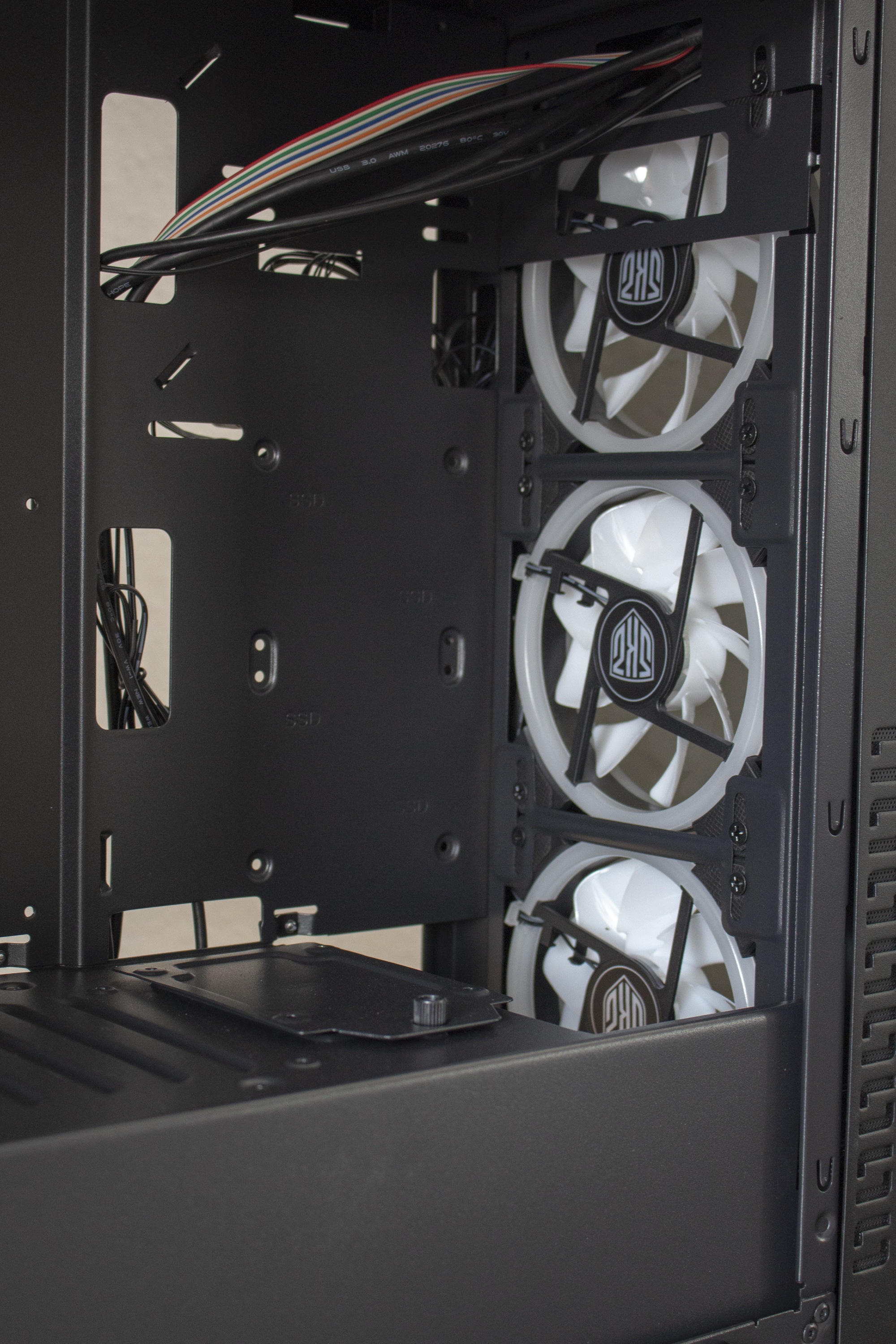 Ein Blick auf die Rückseite des Mainboard-Schlittens offenbart weitere Teile des Kabelmanagement-Systems und die vorinstallierte Steuerplatine für die RGB-Lüfter. Wie vorher schon erwähnt wurde, werden das Netzteil und der Festplattenkäfig von einer Blende verdeckt, um das System ordentlicher wirken zu lassen. Der Festplattenkäfig bietet die Möglichkeit dort zwei 2,5″- oder 3,5″-HDDs unterzubringen. Als Befestigung dienen dafür zwei einfache Rahmen aus Kunststoff ohne Entkopplung. Zusätzlich bietet die Rückseite des Mainboard-Trays die Möglichkeit dort zwei weitere SSD zu montieren.