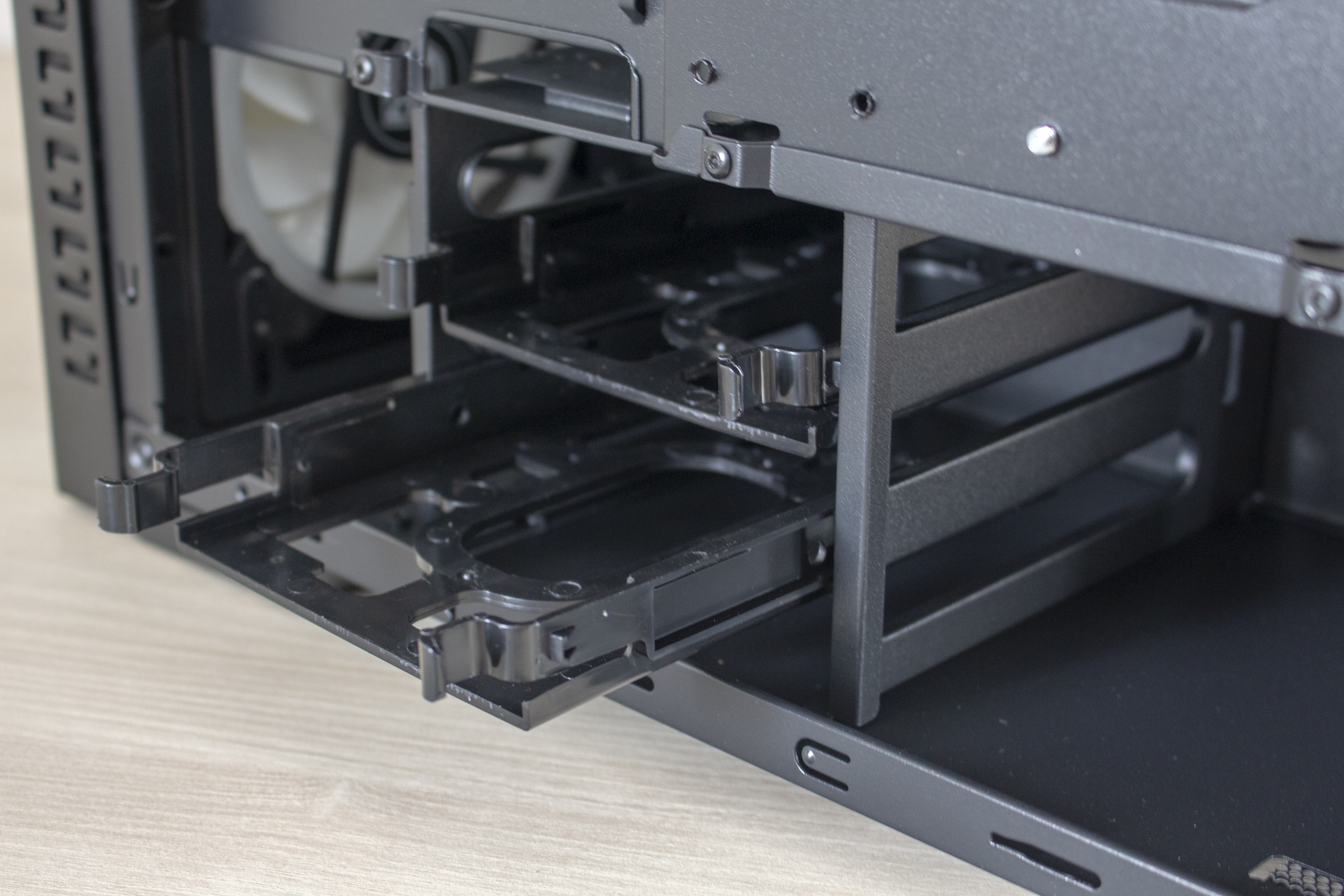 Zur werkzeuglosen Montage von 3,5″-HDDs im Festplattenkäfig dienen die zwei mitgelieferten Festplattenrahmen aus einfachem Kunststoff. Bedenkt man den Preis des Horizon ist die Materialqualität allerdings grenzwertig und auch auf eine Entkopplung muss der Käufer komplett verzichten. Das spiegelt sich natürlich auch während des Betriebs in gewissen Vibrationen wieder, die sich auf das gesamte Gehäuse übertragen. Für SSDs gibt es insgesamt drei Montagemöglichkeiten. Eine SSD kann mit dem mitgelieferten Rahmen oberhalb der Netzteilabdeckung befestigt bzw. präsentiert werden. Zwei weitere 2,5″-Geräte finden auf der Rückseite des Mainboard-Trays einen Platz und werden direkt mit dem Korpus verschraubt.