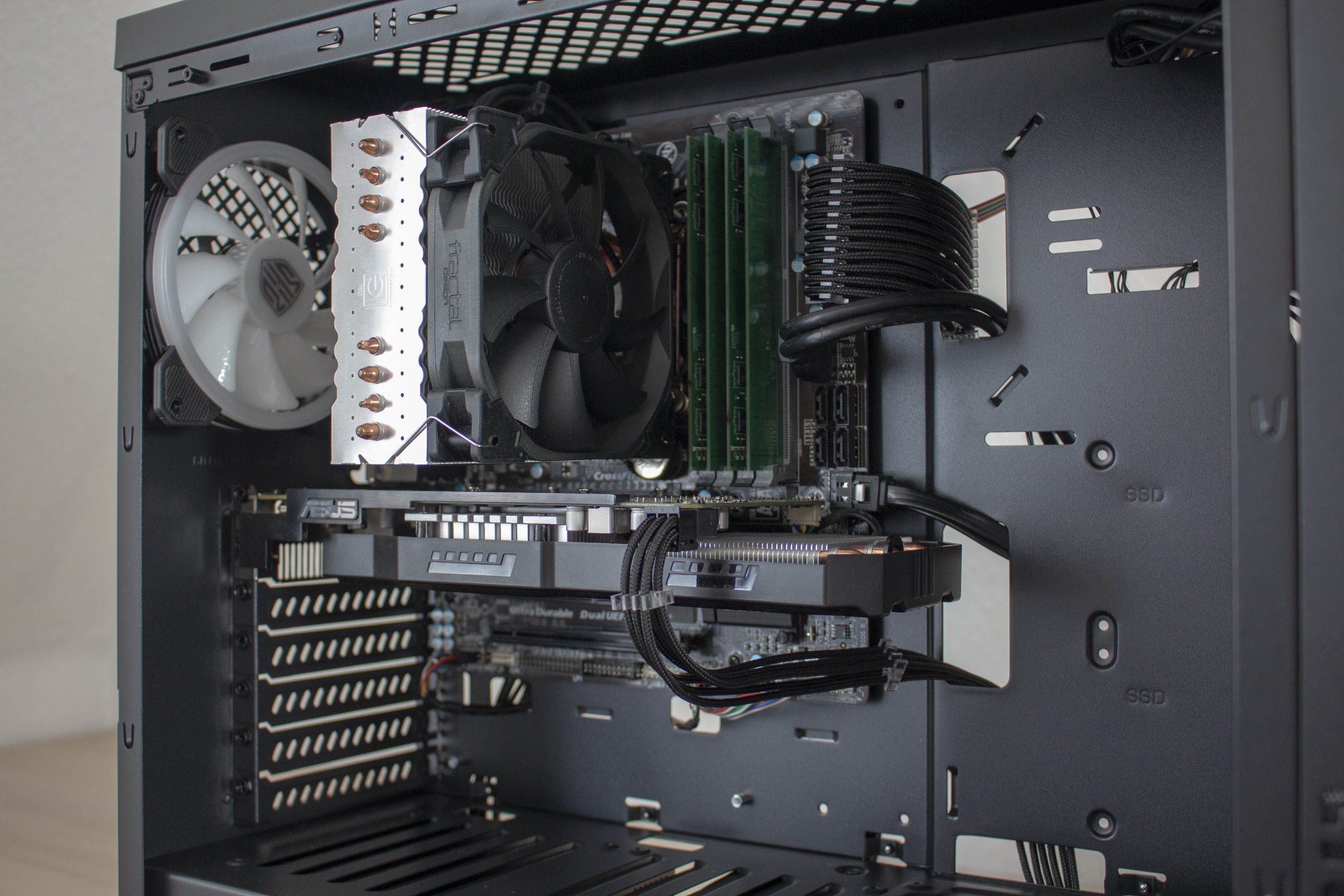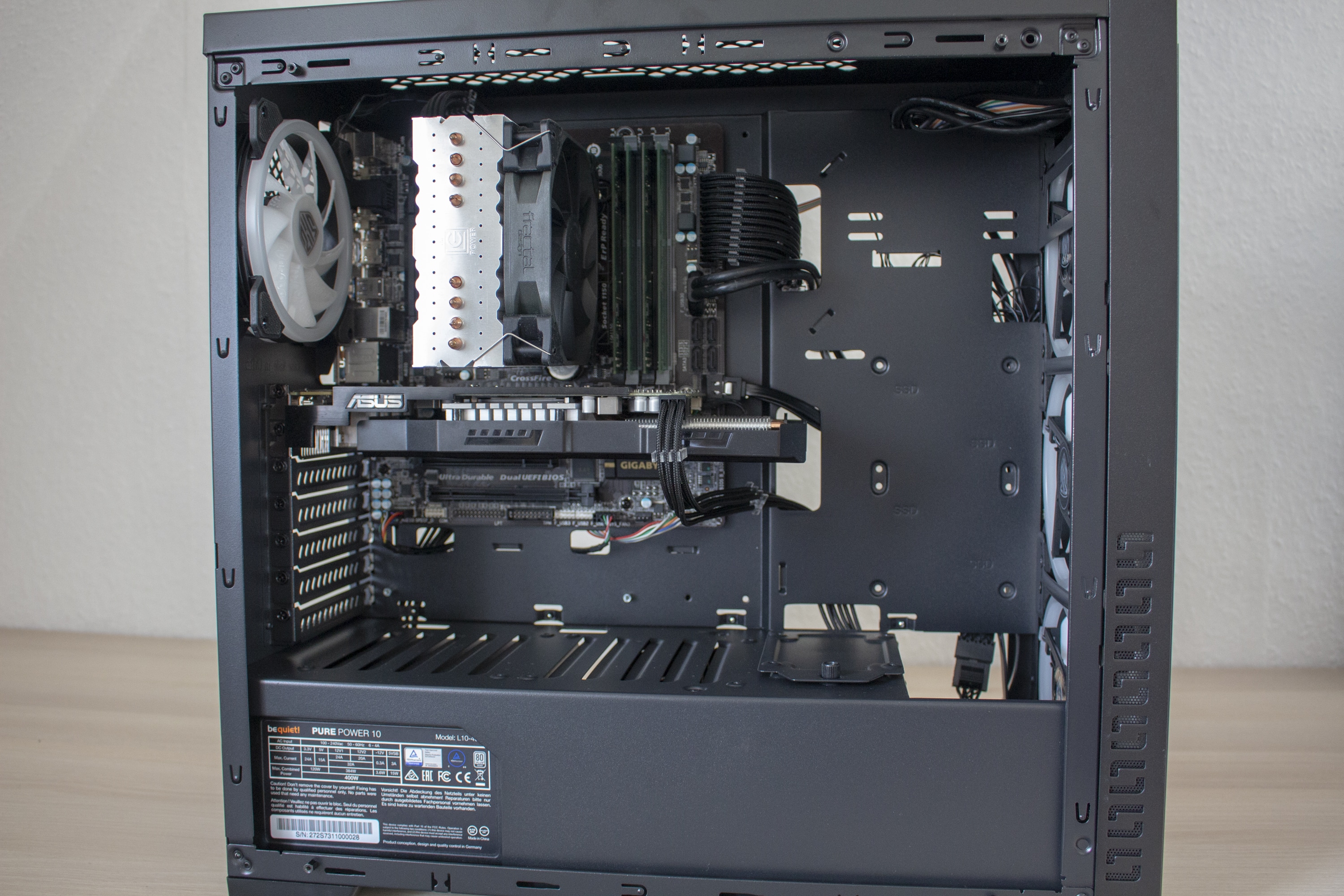 Der Einbau aller Komponenten war durch den großzügig gestalteten Innenraum schnell erledigt und ist auch mit großen Händen problemlos durchzuführen. Beim Einbau von Hardware muss sich der Käufer nahezu fast keine Gedanken machen, ob ein entsprechendes Teil passt oder nicht. Das gilt allerdings nicht für CPU-Kühler. Mit einer maximal möglichen Höhe von 155 mm wird die Auswahl ein ganzes Stück eingeschränkt. High-End-Kühler wie z. B. der Dark Rock Pro 4 passen daher nicht in das Horizon.
