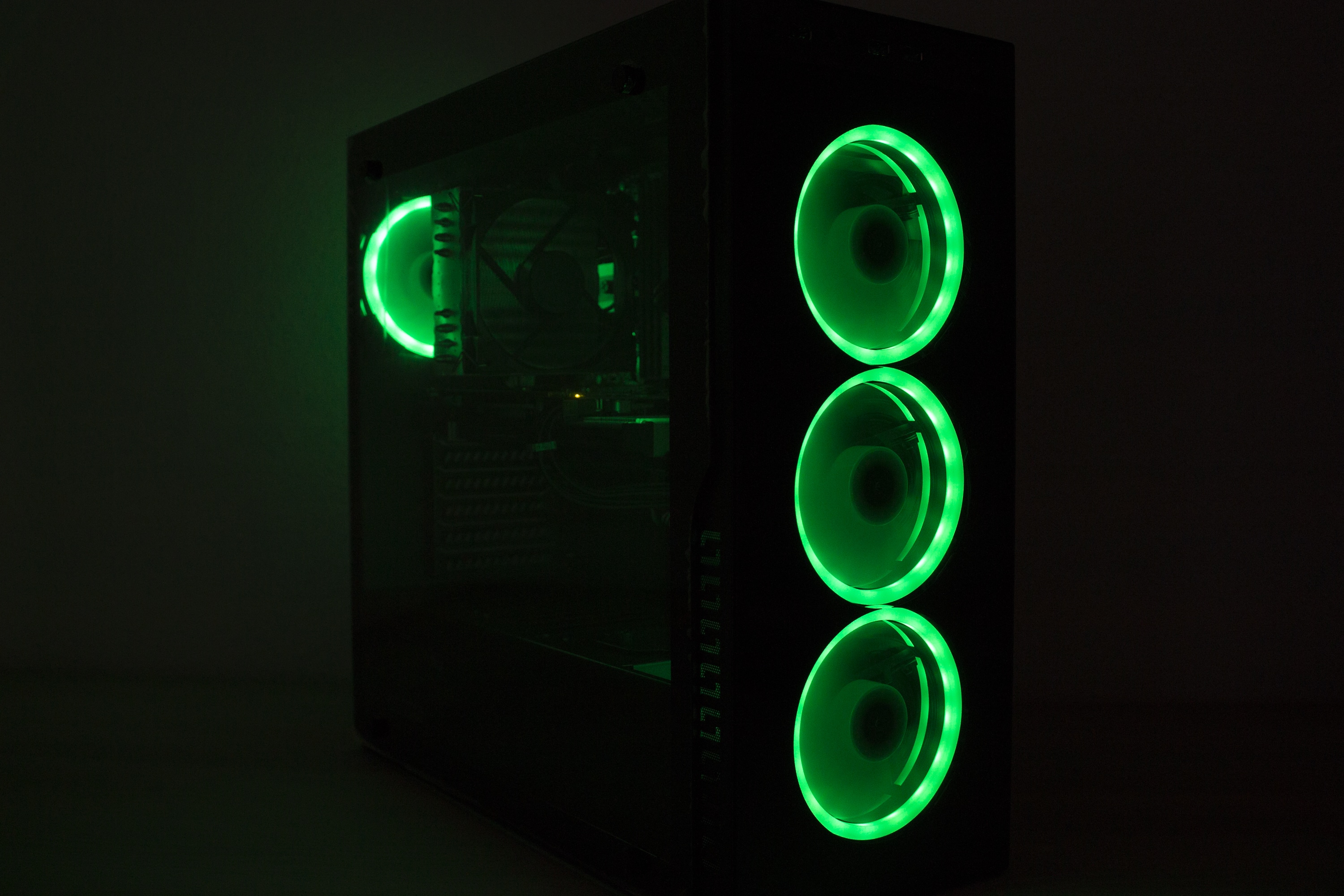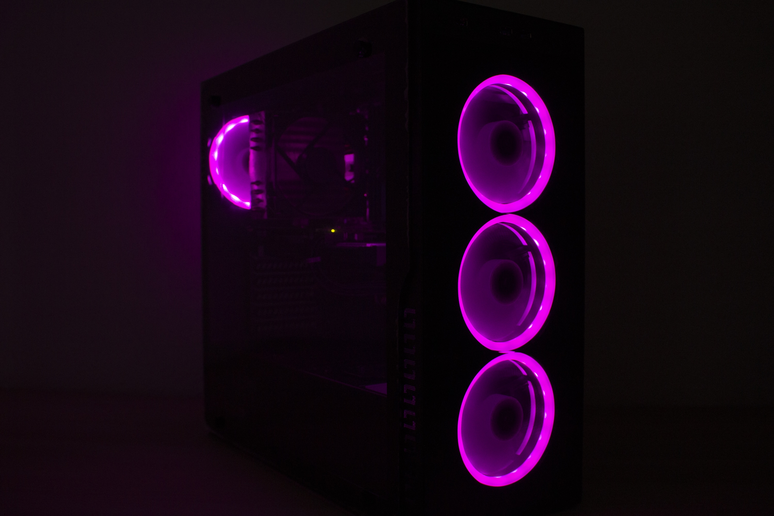 Das Kolink Horizon kommt ab Werk mit vier vorinstallierten RGB-Lüftern und einer entsprechenden Steuerplatine, die sich per Knopf am I/O-Panel oder mit der mitgelieferten Fernbedienung bedienen lässt. Eine Verbindung mit einem RGB-fähigen Mainboard kann allerdings nicht hergestellt werden und somit sind die LEDs auch nicht über eine installierte Software steuerbar. Trotzdem lassen sich sehr viele verschiedene Modi wie z. B. einfarbig, pulsierend, Propeller oder Regenbogen einstellen. Ein weiterer Negativpunkt ist die Abwesenheit von standardisierten Anschlüssen. So verfügen die Platine und dementsprechend auch die Lüfter über keine gebräuchlichen Anschlüsse, sondern über einen 6-poligen Stecker, den man in der Form bei keinem anderen Hersteller findet. Leider gibt es derzeit auch von Seiten des Herstellers kein weiteres Zubehör bzw. zusätzliche Lüfter.