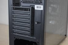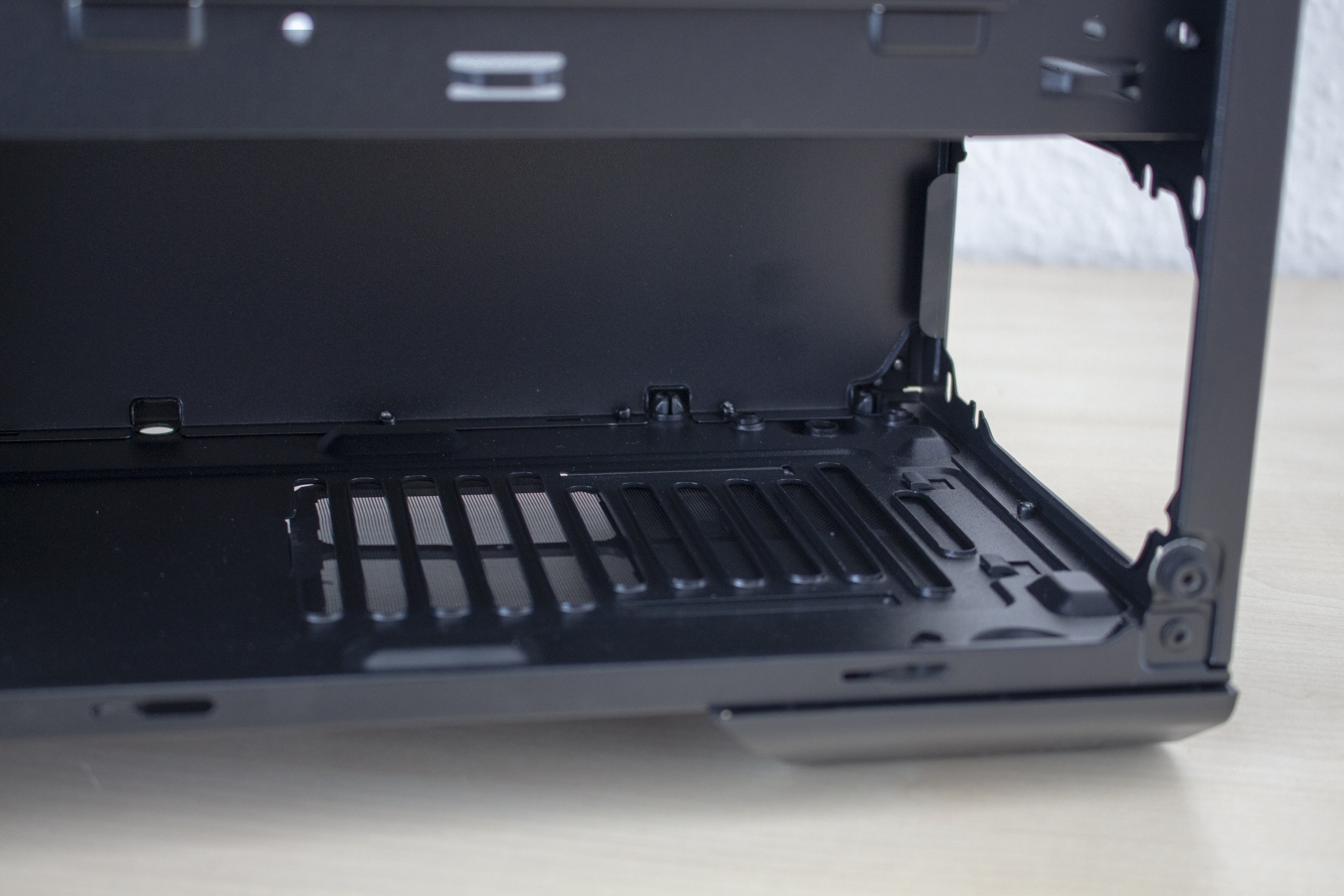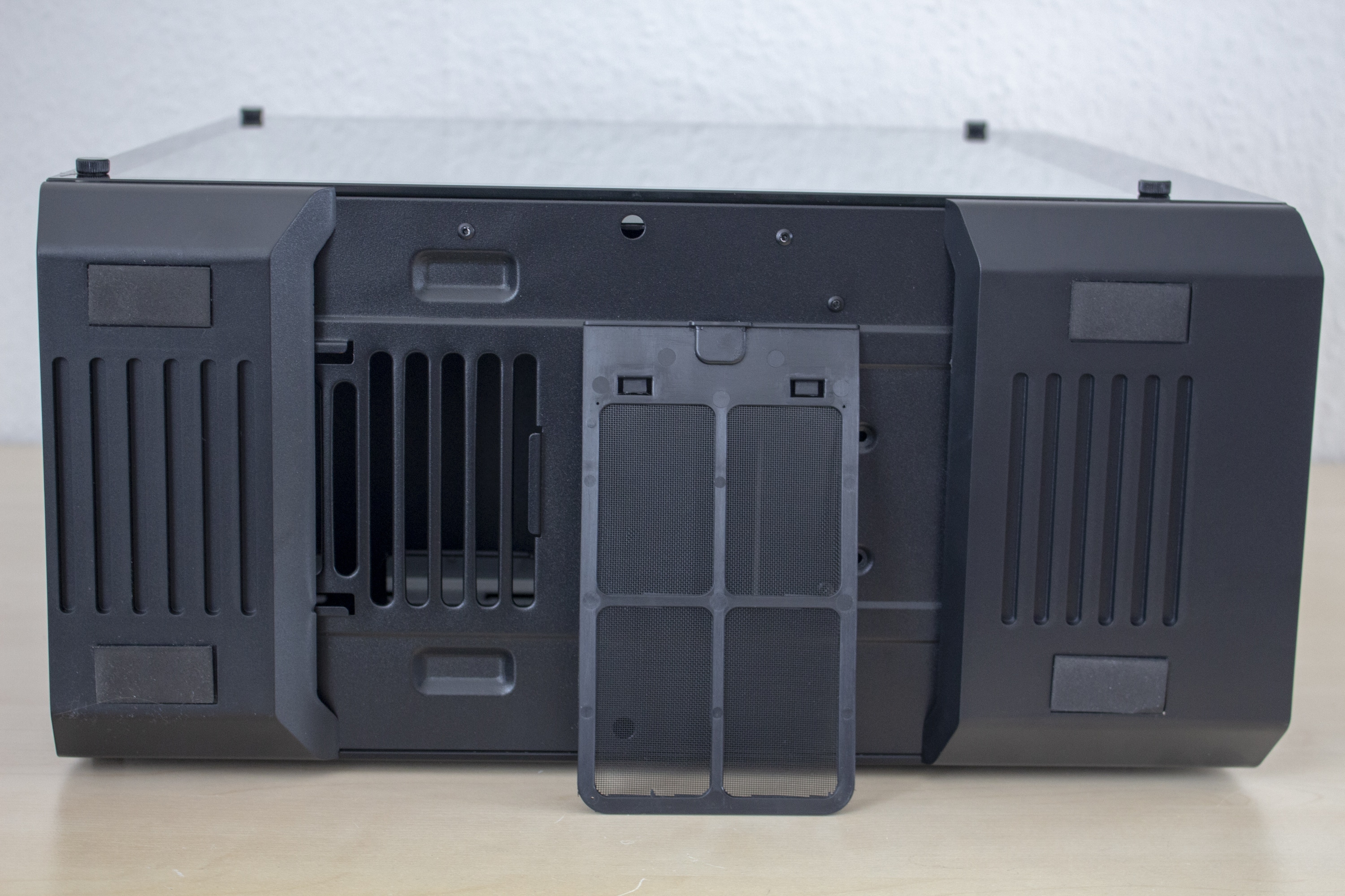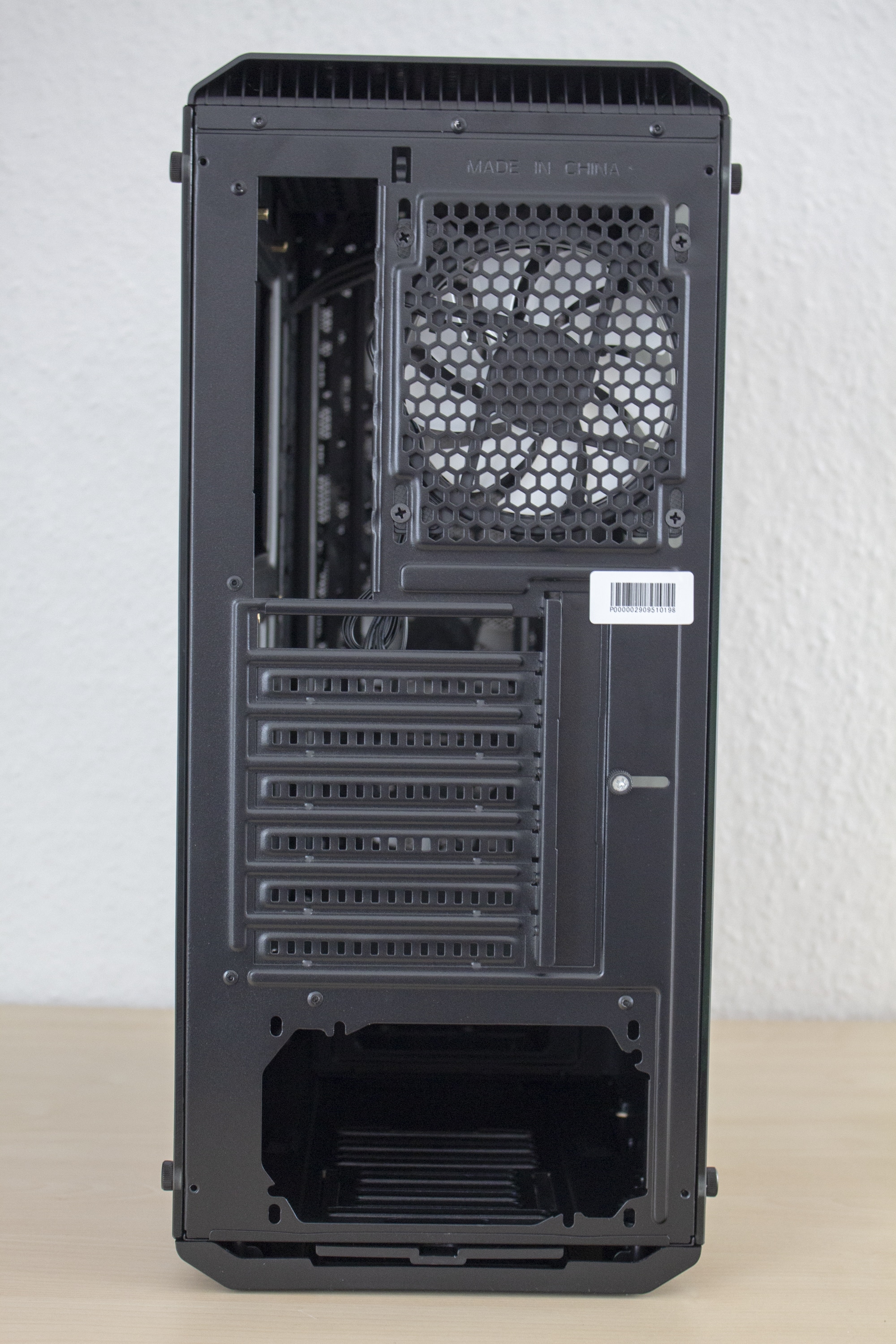 Heck- und Bodenpartie bieten keine außergewöhnlichen Eigenschaften. Der Midi-Tower steht auf soliden Füßen aus Kunststoff, die mit Gummistreifen ausgestattet wurden. Der Staubfilter für das Netzteil ist feinmaschig und lässt sich einfach nach hinten entfernen. Erweiterungskarten werden von außen mit dem Korpus verschraubt und durch eine Abdeckung verdeckt. Leider ist keine der vorinstallierten Blenden wiederverwendbar, da sie herausgebrochen werden. Oberhalb der Slotblenden findet man den vierten vorinstallierten RGB-Lüfter und die Öffnung für das I/O-Shield.