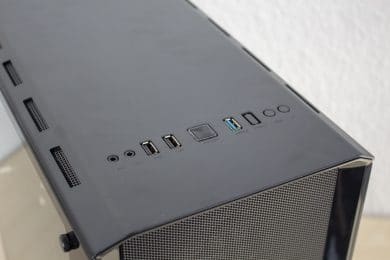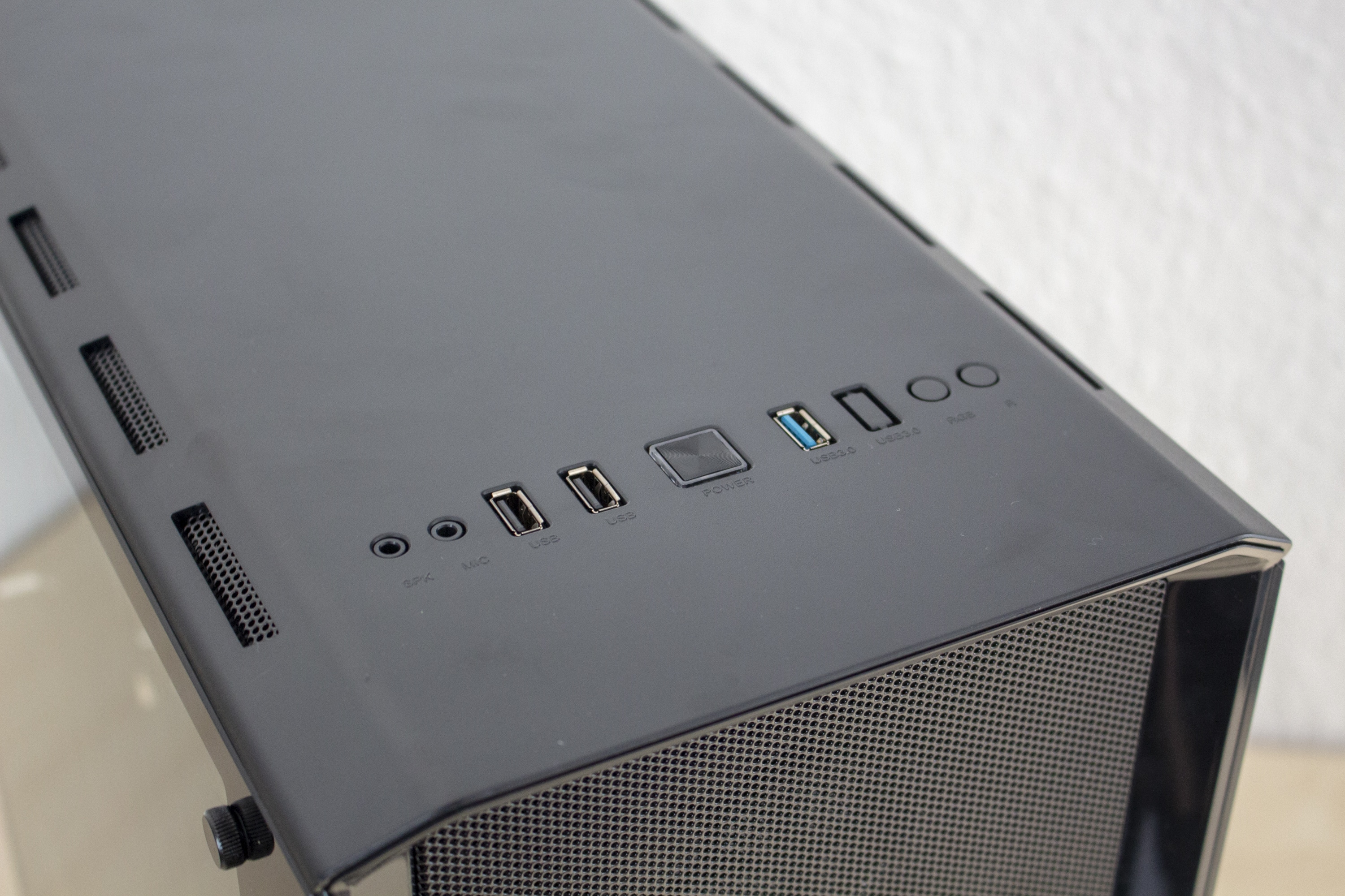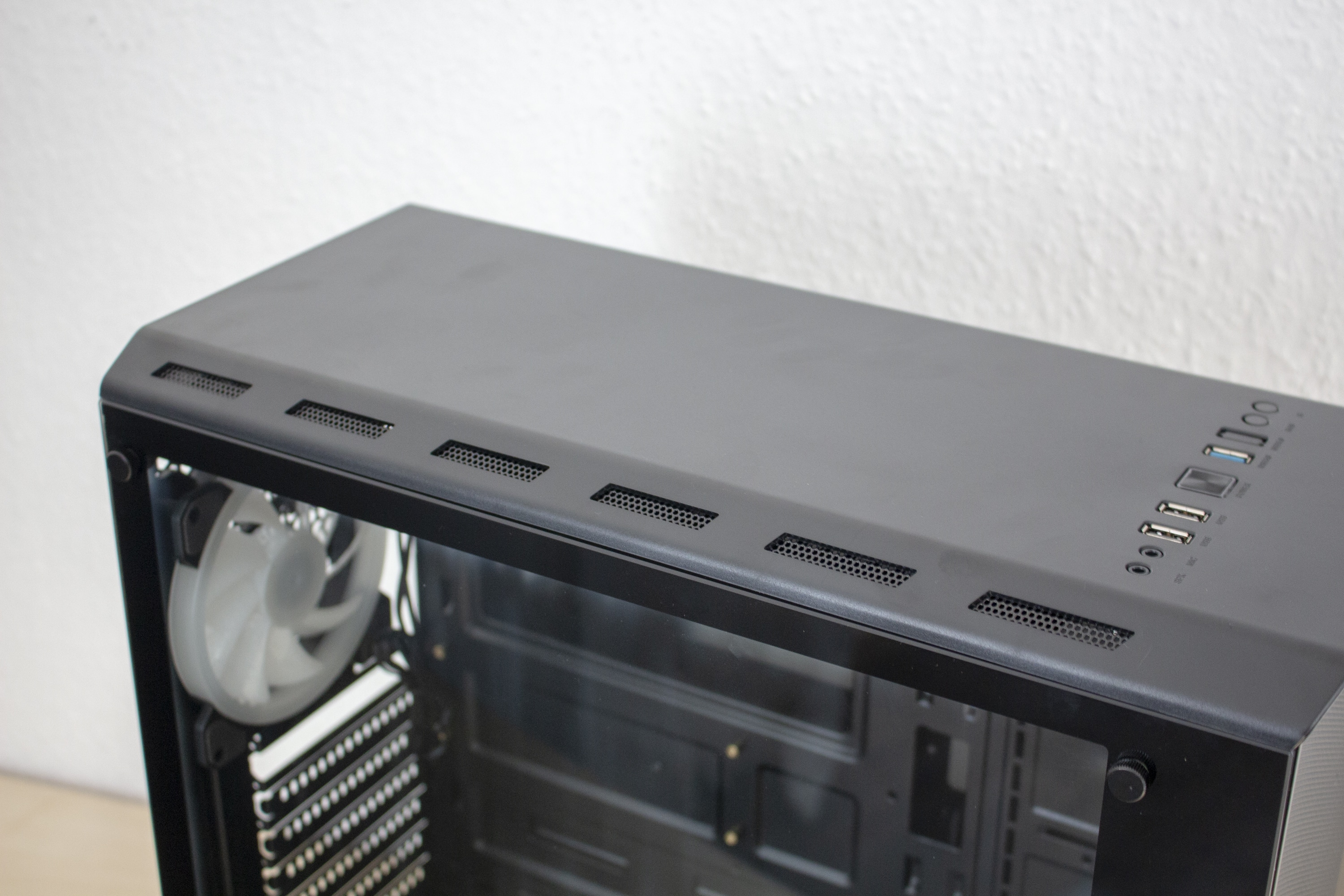 Betrachtet man die Deckelpartie, so fühlt man sich ein wenig an das Phanteks Enthoo Evolv erinnert. Im Vergleich zum Enthoo Evolv ist der Deckel hier aber aus Kunststoff gefertigt. Seitlich finden sich auf beiden Seiten kleine Öffnungen, die über Staubfilter aus Meshgitter verfügen. Auch das I/O-Panel wurde im Deckel implementiert und ist im vorderen Bereich des Deckels zu finden. Vorhanden sind hier zwei USB 2.0-Ports, ein USB 3.0-Port, Anschlüsse für Kopfhörer und Mikrofon und drei Taster für Power, Reset bzw. RGB-Steuerung. Angesichts des Preises hätten es hier auch durchaus zwei USB 3.0-Ports sein können.