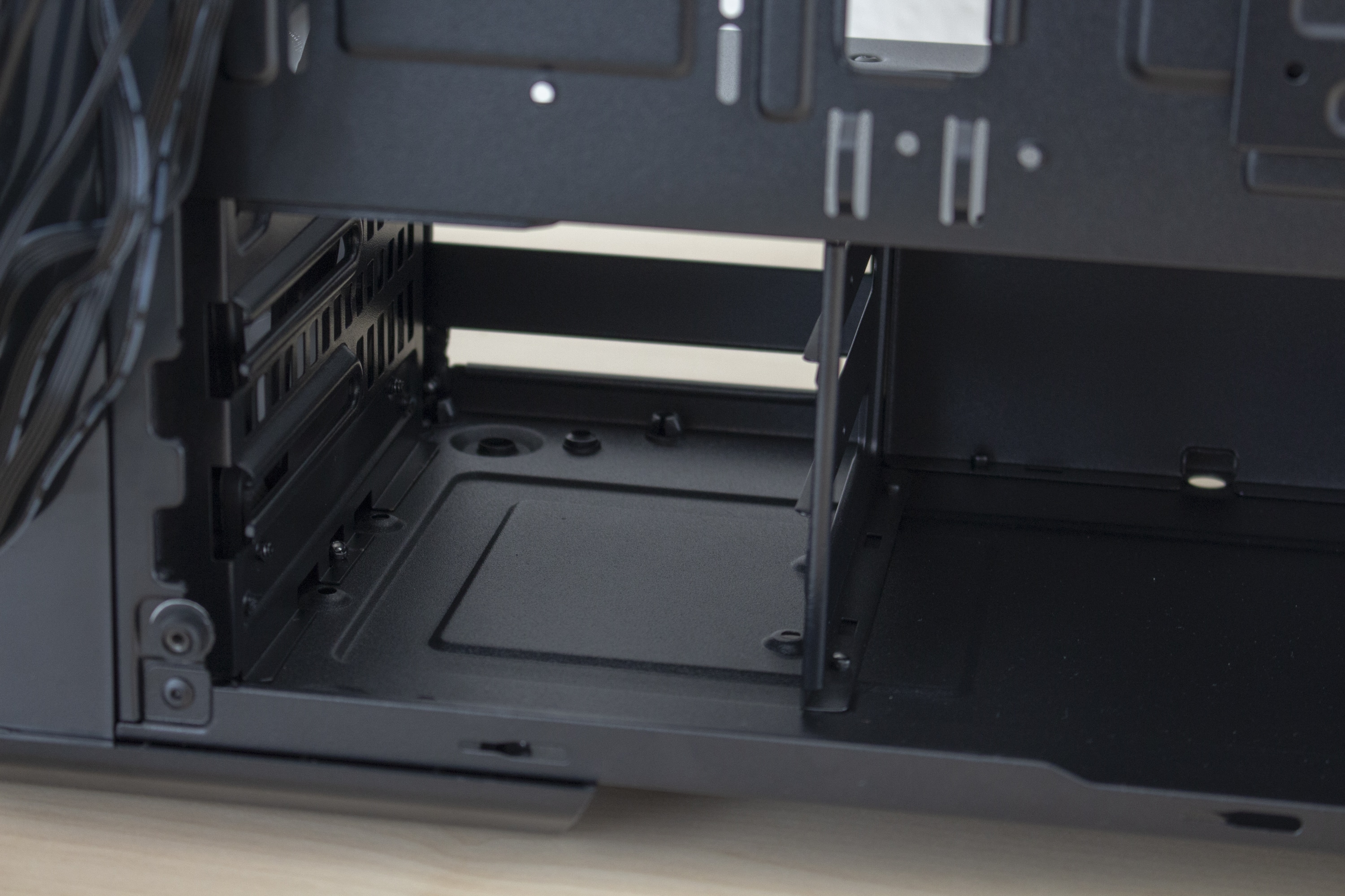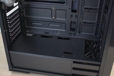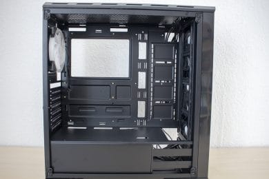 Entfernt man die Seitenteile und wirft ein Blick ins Innenleben, so dürfte man viele Ähnlichkeiten zum Kolink Stronghold oder Observatory erkennen. Die Erklärung dafür ist relativ simpel: Kolink verwendet für das Levante den gleichen Korpus. Der Innenraum ist sehr offen gestaltet, wird durch eine Netzteilabdeckung in zwei Bereiche unterteilt und ist komplett schwarz lackiert.