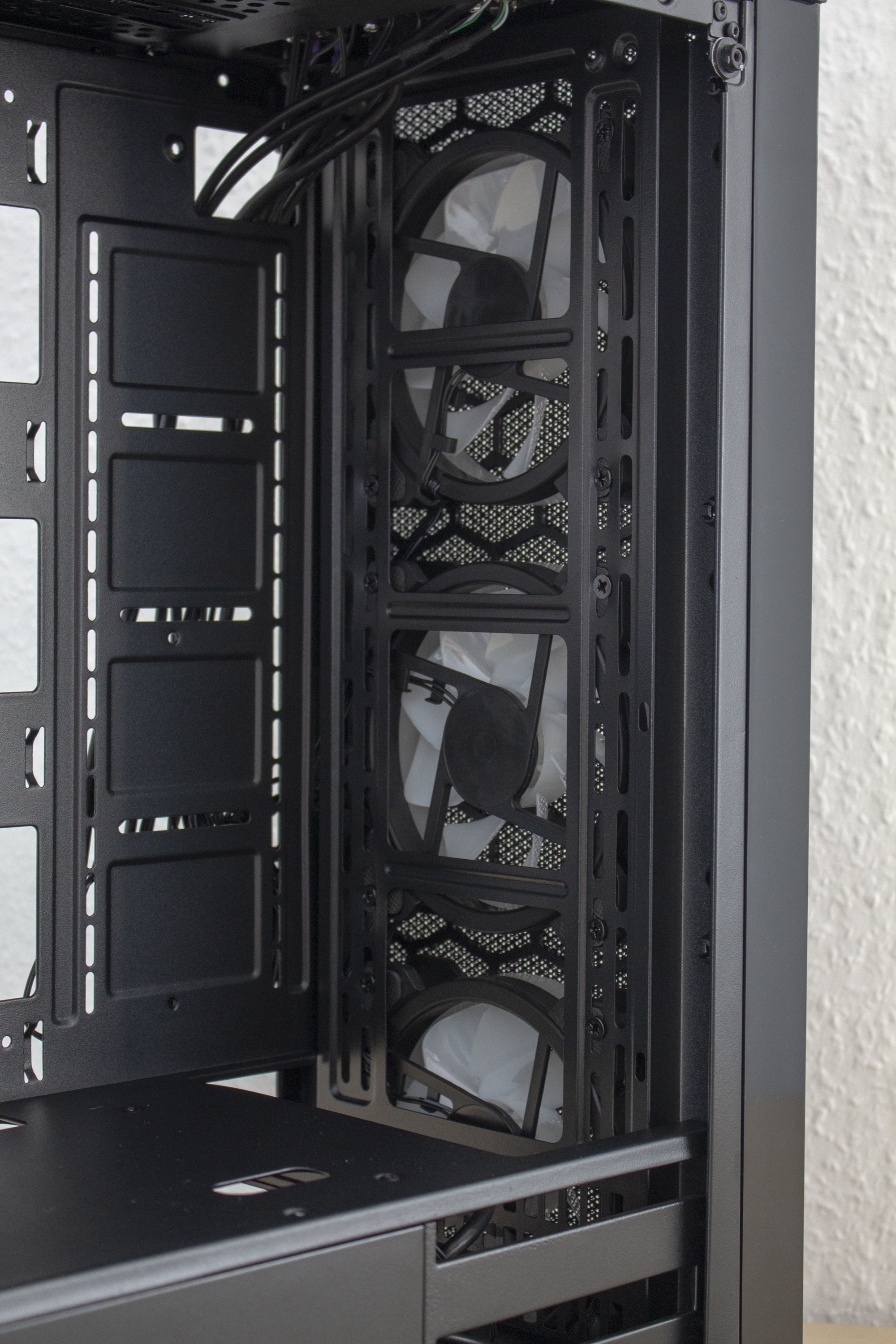 | Belüftung: | Front: 3x 120 oder 2x 140 mm Heck: 1x 120 mm Deckel: 2x 120 mm oder 2x 140 mmDavon vorinstalliert: 3x 120 mm RGB (Front) 1x 120 mm RGB (Rückseite) |