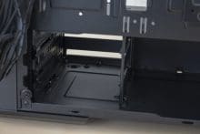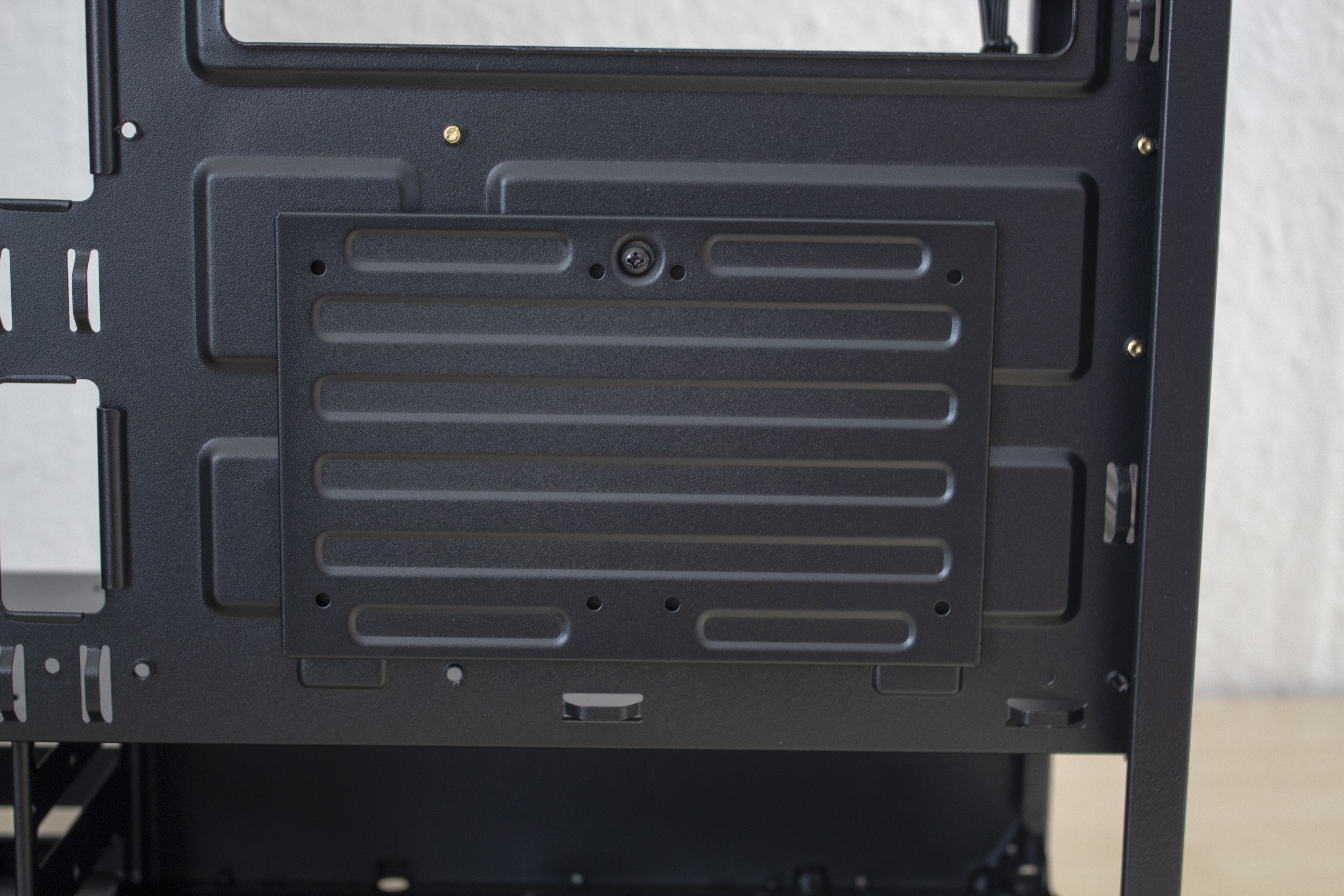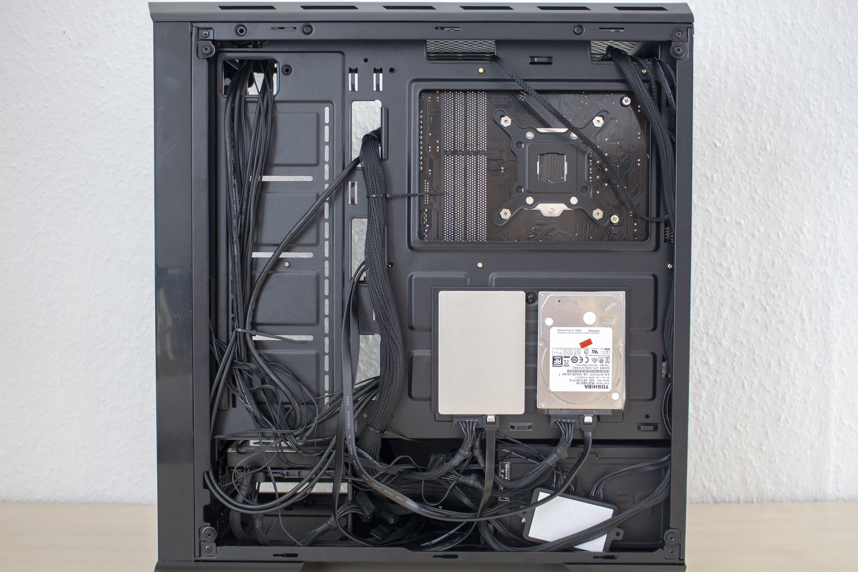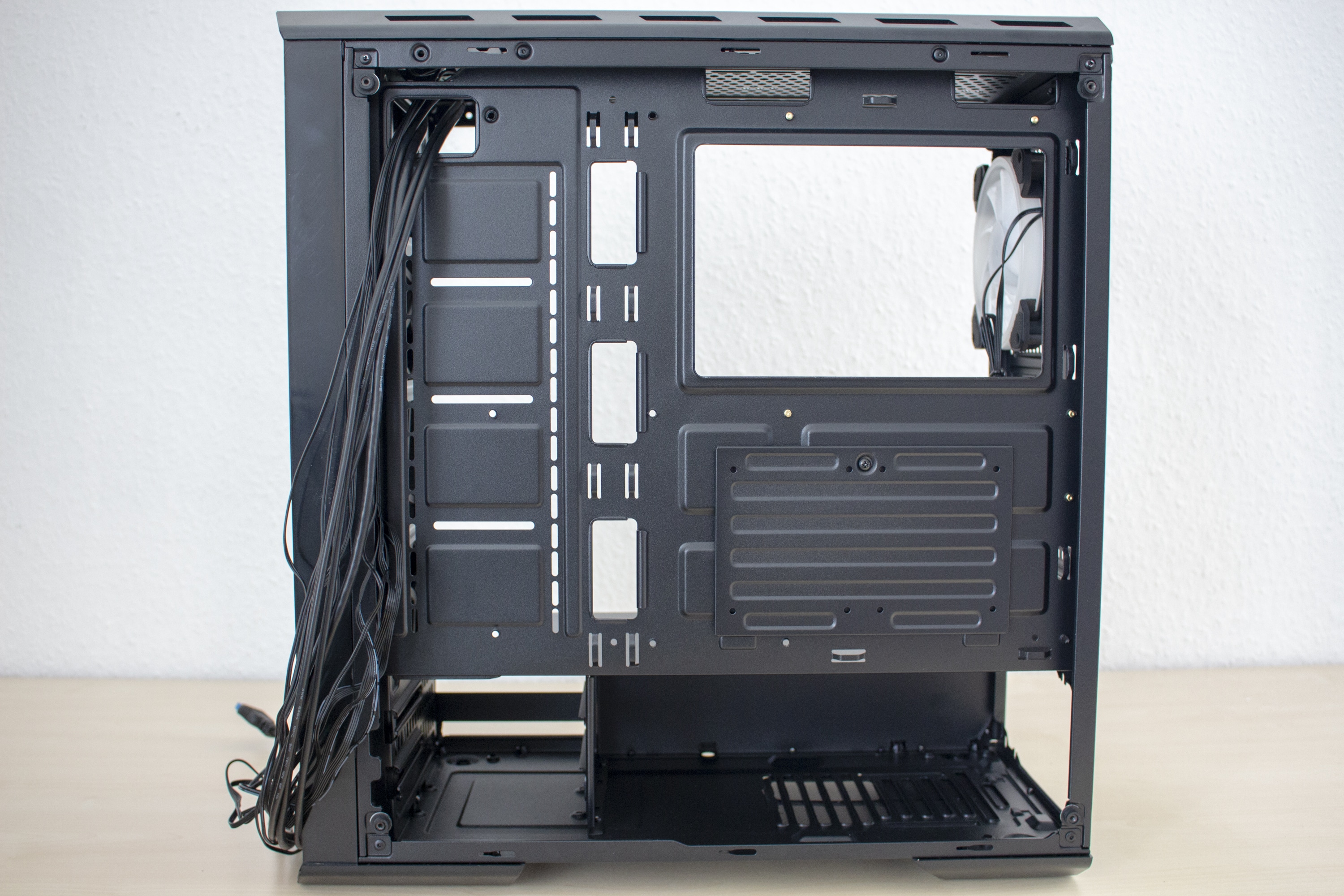 Da die Festplatten hinter dem Mainboard-Tray oder unter der Netzteilabdeckung montiert werden, können die drei Frontlüfter ungehindert Luft in den inneren Bereich befördern. Zur Verbesserung der Optik hat Kolink rund um das Mainboard und in der Netzteilabdeckung diverse Kabelmanagement-Öffnungen eingearbeitet. Des Weiteren finden sich auf der Rückseite diverse Laschen zum Befestigen von Kabelbindern sowie ein großer Ausschnitt, um auch nachträglich große CPU-Kühler mit Backplate montieren zu können.