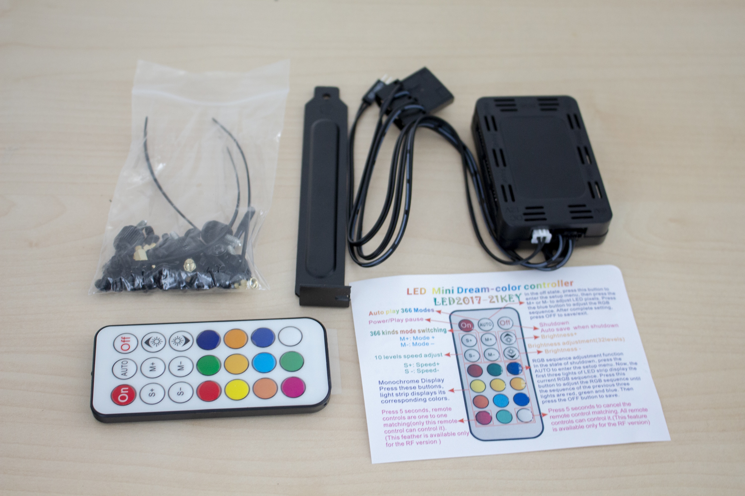 Außerdem finden sich im Gehäuse vier vorinstallierte RGB-Lüfter, einer Steuerplatine inklusive einer Fernbedienung zum Umschalten der Farbe und die ebenfalls vorinstallierten Abstandshalter für das Mainboard.
