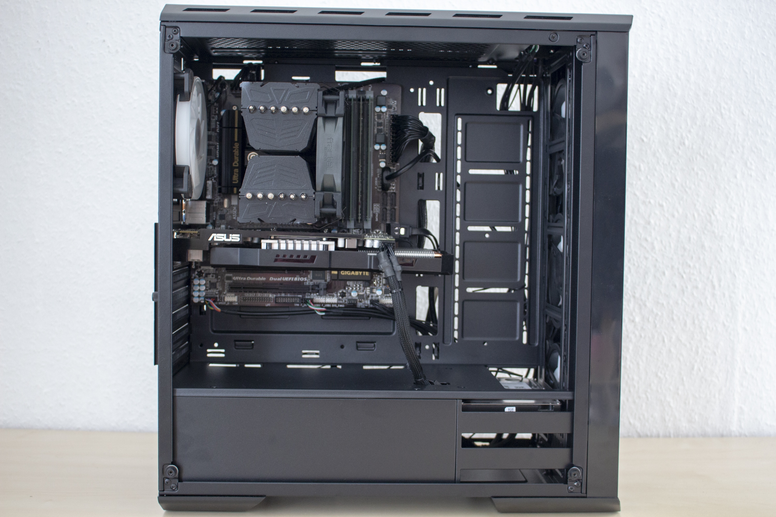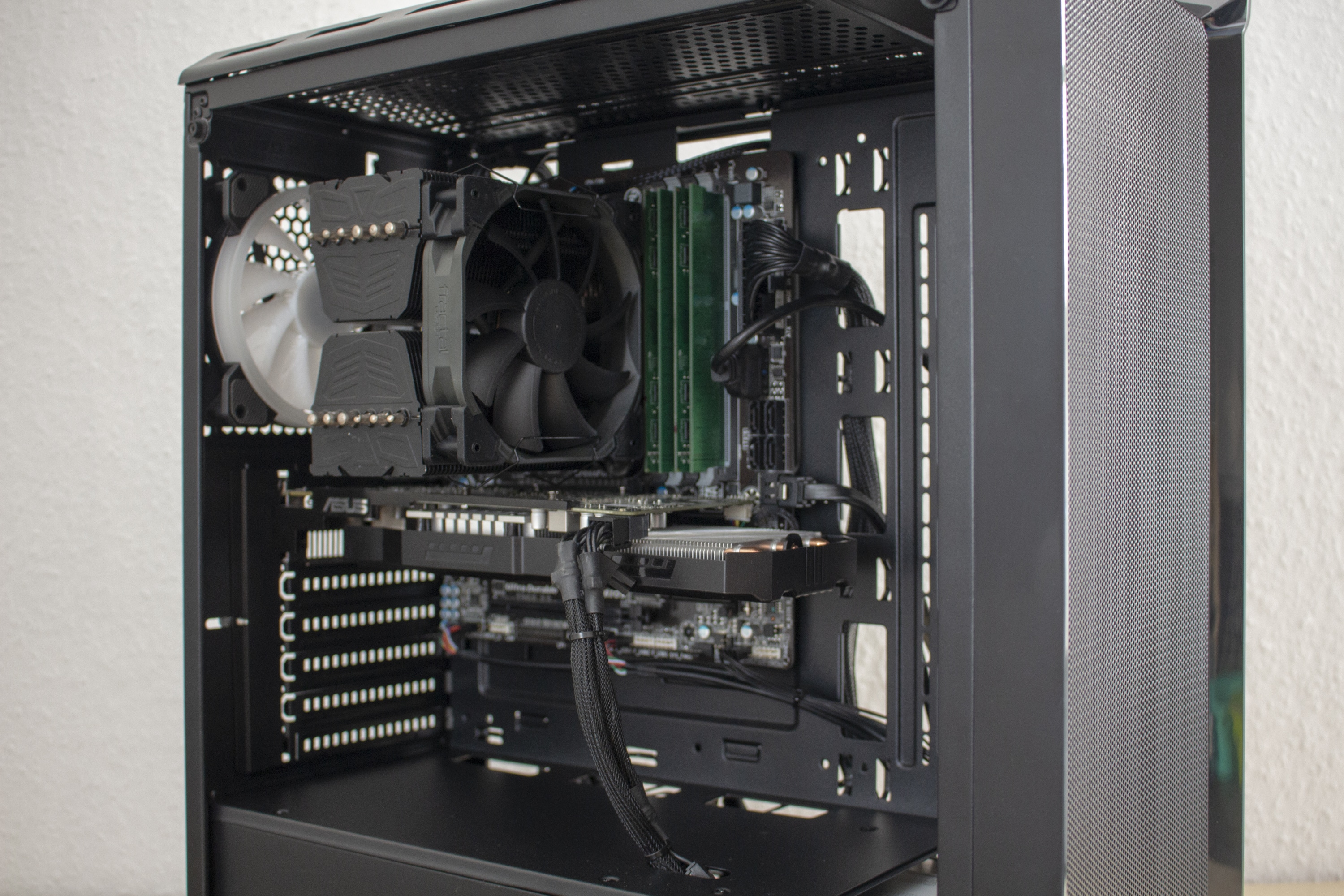 Der Einbau aller Komponenten war schnell erledigt und ist durch den großzügig gestalteten Innenraum auch mit großen Händen problemlos möglich. Beim Einbau von Hardware muss sich der Käufer nahezu fast keine Gedanken machen. Lediglich die maximale Höhe von 160 mm für CPU-Kühler schränkt die Auswahl etwas ein. Zusätzlich zum vorhandenen Platz lässt sich mit dem durchdachten Kabelmanagement-System und den 20 mm hinter dem Mainboard ein sauber verkabeltes System zusammenbauen.