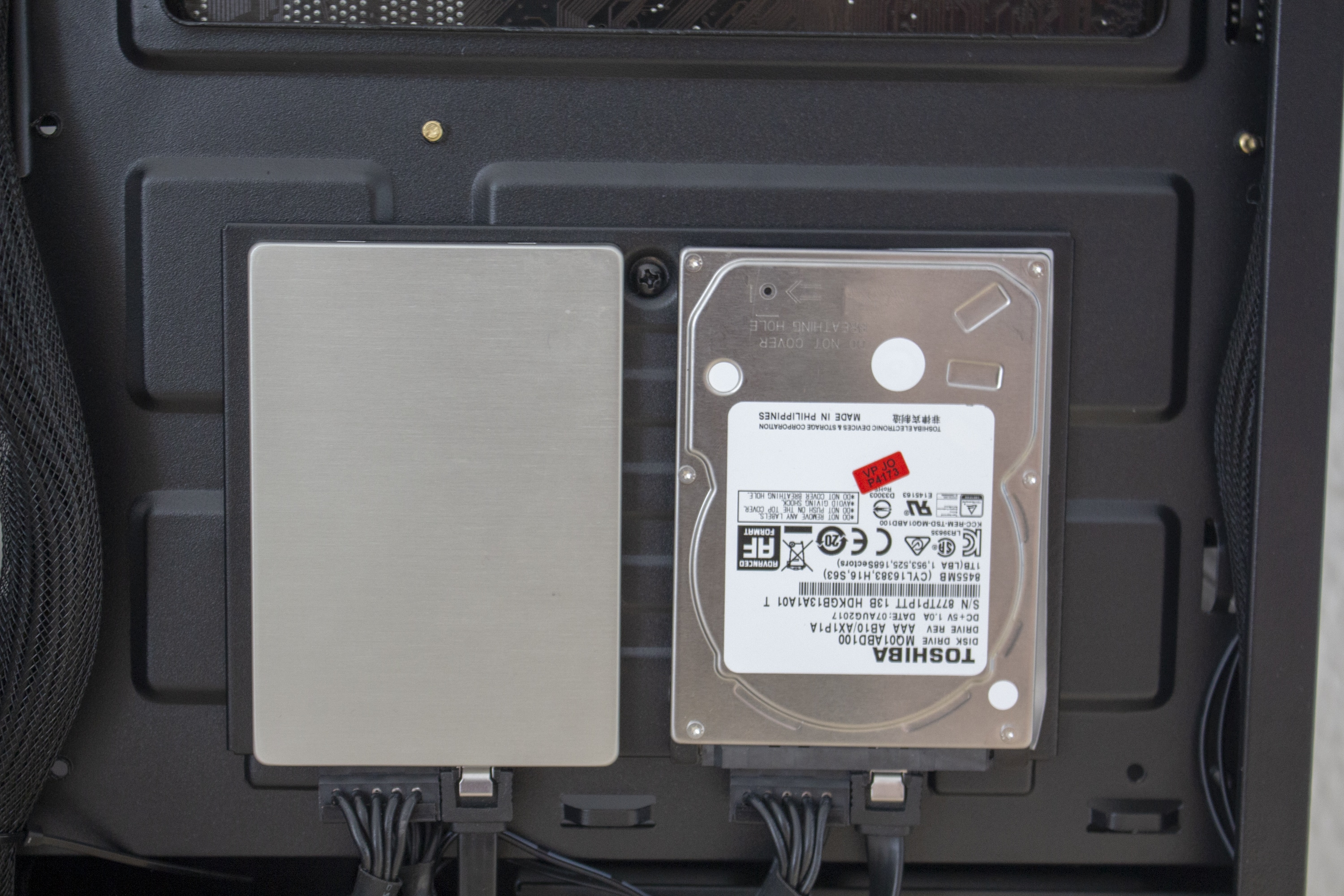 Zur Montage von 3,5″-HDDs muss man auf der linken Seite der Festplatte zwei Spezialschrauben befestigen, mit denen man den Datenträger in den dazu vorgesehenen Käfig schieben kann. Auf der rechten Seite wird die HDD dann mit einer simplen Rändelschraube verschraubt. Eine Entkopplung bietet diese Montagesystem damit aber leider nicht. SSDs werden hinter dem Mainboard-Tray an einer Montageplatte montiert. Diese wird wiederum mit einer Schraube am Mainboard-Tray befestigt.
