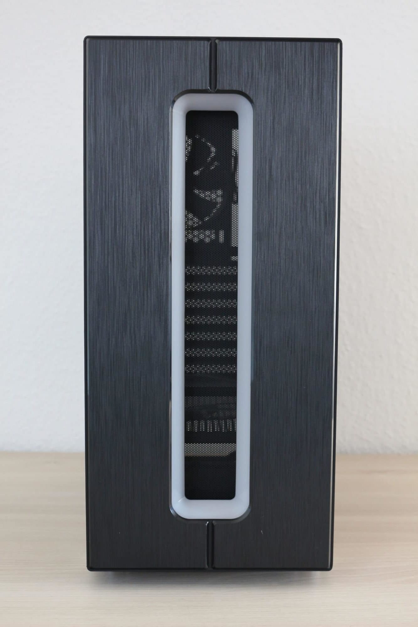 Äußerlich setzt Kolink beim Nimbus auf ein recht bekanntes Design, welches sehr stark dem Lian Li LANCOOL ONE ähnelt. Das Frontelement ist komplett aus Kunststoff gefertigt und kann mit einem kräftigen Ruck nach vorne abgezogen werden. Um den Kunststoff hochwertiger wirken zu lassen, wurde das Frontelement mit einer Optik von gebürstetem Aluminium versehen. Damit optionale Frontlüfter genug Frischluft in den Innenraum befördern können, befinden sich neben der mittigen Öffnung auch gut dimensionierte Öffnungen an den Seiten. Die Frontöffnung zeichnet sich durch einen michlig-weißen Rahmen aus. Hinter diesem Rahmen befinden sich zahlreiche digital-adressierbare RGB-LEDs. Zum Schutz vor Staub hat Kolink einen magnetischen Mesh-Staubfilter hinter der Frontblende versteckt.