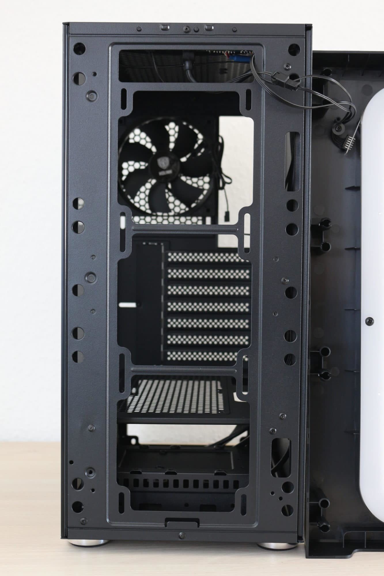 Die äußere Verarbeitung und die Lackierung sind grundsätzlich in Ordnung. Der Korpus ist ohne Seitenteile und Frontteile allerdings sehr leicht und verwindet sich bei Kraftaufwand etwas. Das deutet sehr stark auf die Verwendung von dünnem Stahl hin. Als störend erachten wir ebenfalls die herausbrechbaren Slotblenden bzw. fehlende Ersatzblenden.
