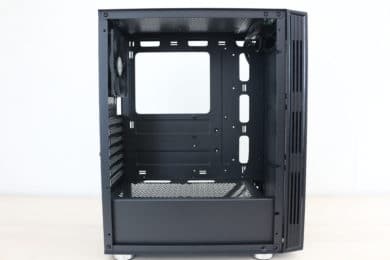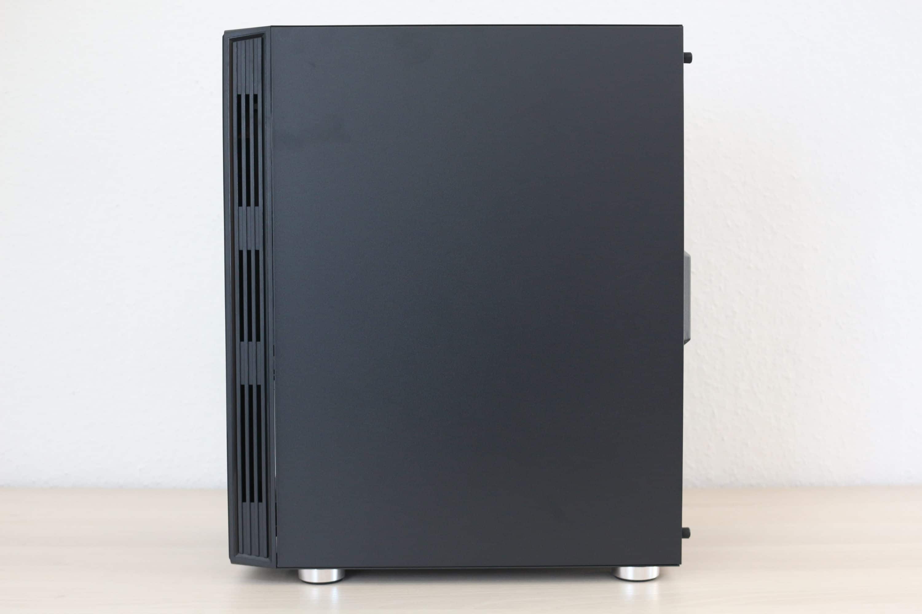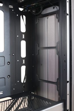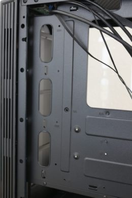 Das linke Seitenteil besteht aus 4 mm starkem Hartglas und ist leicht getönt. Da die Scheibe auf einem dünnen Stahlrahmen befestigt wurde, sind zur Anbringung am Korpus nur zwei Rändelschrauben an der Rückseite notwendig. Außerdem wurde der Rahmen mit Streifen aus Moosgummi zur Entkopplung ausgestattet. Das rechte Seitenteil besteht aus Stahl und wird ebenfalls mit zwei normalen Rändelschrauben am Korpus angebracht. Die Stabilität des Sidepanels ist gerade noch ausreichend.