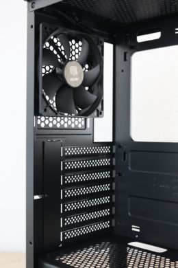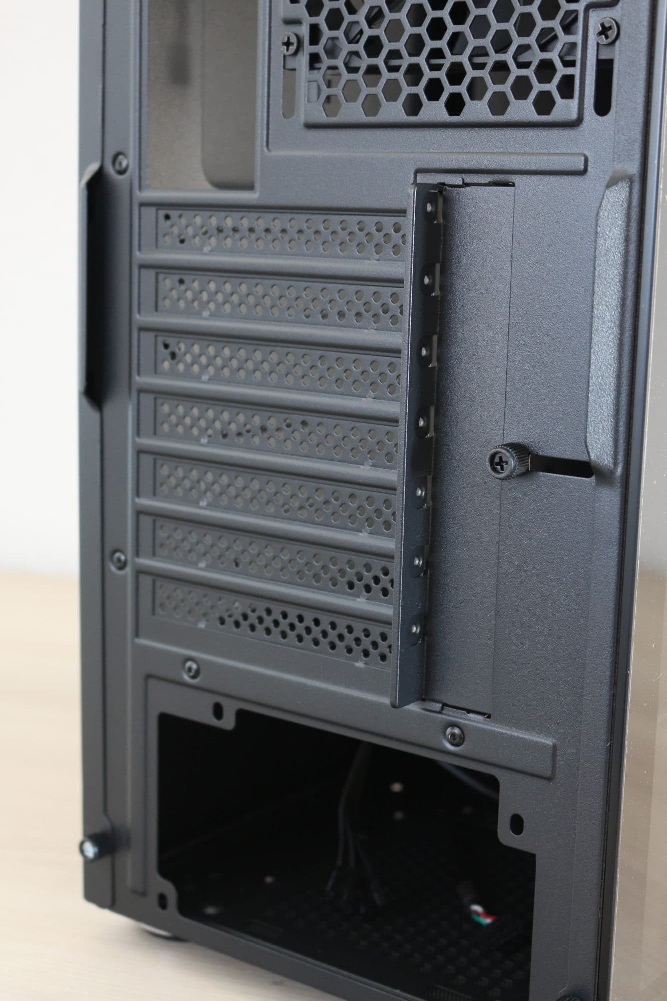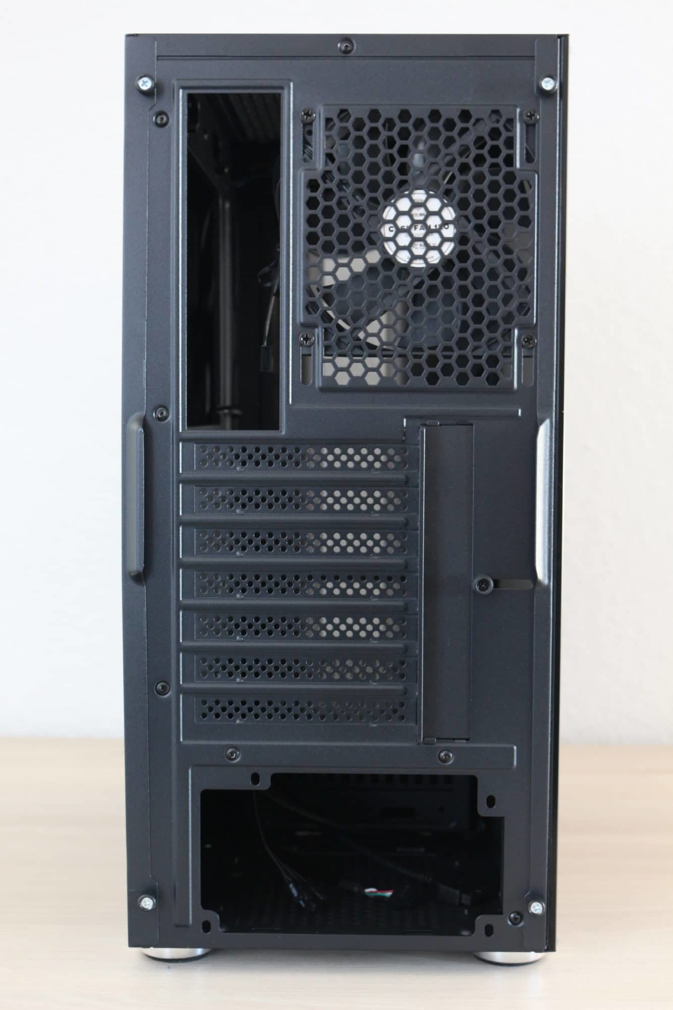 Die Rückseite entspricht dem üblichen Standard von aktuellen Midi-Towern. Das Netzteil wird unten montiert, darüber finden sich sieben Slots für PCI-Erweiterungskarten. Diese sind, wie immer bei Kolink, leider zum herausbrechen und der Hersteller legt keinen Ersatz bei. Zuletzt lässt sich an der Rückseite noch der vorinstallierte Gehäuselüfter mit einer Rahmenbreite von 120 Millimetern entdecken.