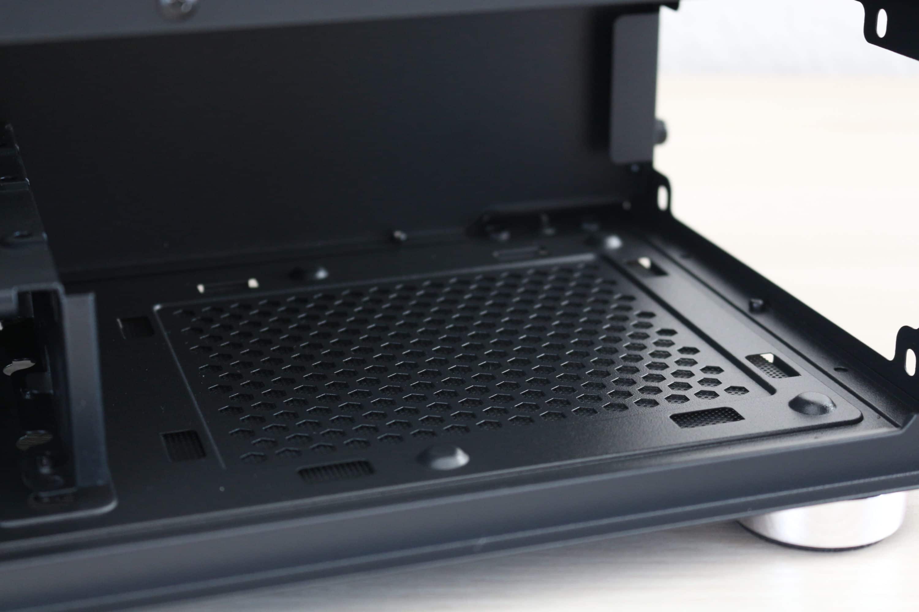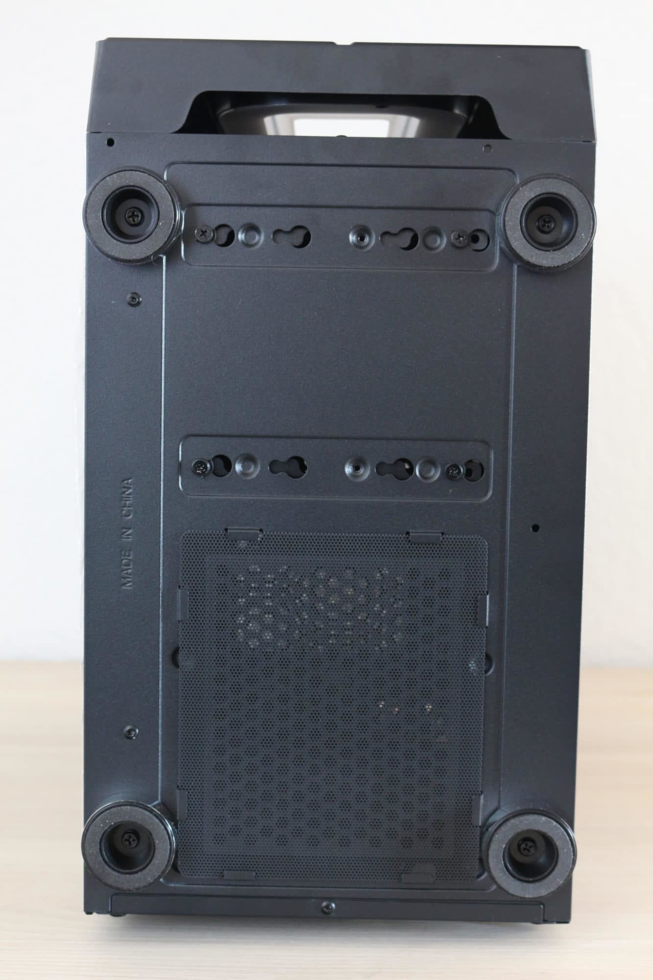 Legt man das Gehäuse auf den „Rücken“, lässt sich gut die Unterseite betrachten. Viel gibt es hier allerdings nicht zu sehen. Wie bei allen anderen Gehäusen, setzt Kolink beim Staubfilter für das Netzteil auf ein einfaches Meshgitter welches über Metalllaschen festgehalten wird. Damit das Netzteil auch genug Luft bekommt, hat der Hersteller die Unterseite mit vier silbernen Standfüßen aus Kunststoff ausgestattet. Diese wirken schick und stabil. Zusätzlich lassen sich noch vier Schrauben und diverse Löcher erkennen. Das deutet darauf hin, dass sich der interne Festplattenkäfig bei Bedarf auch entfernen lässt.