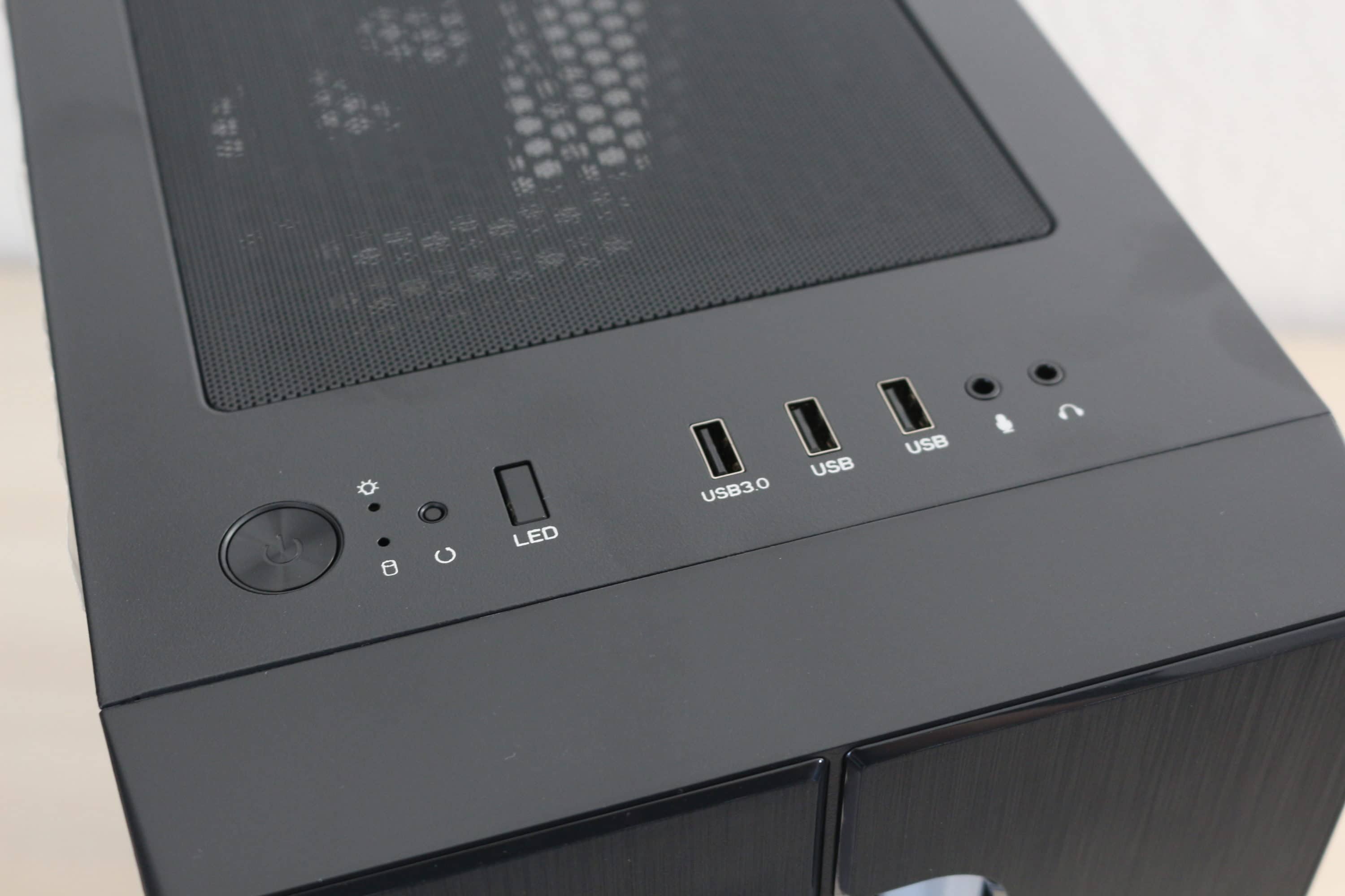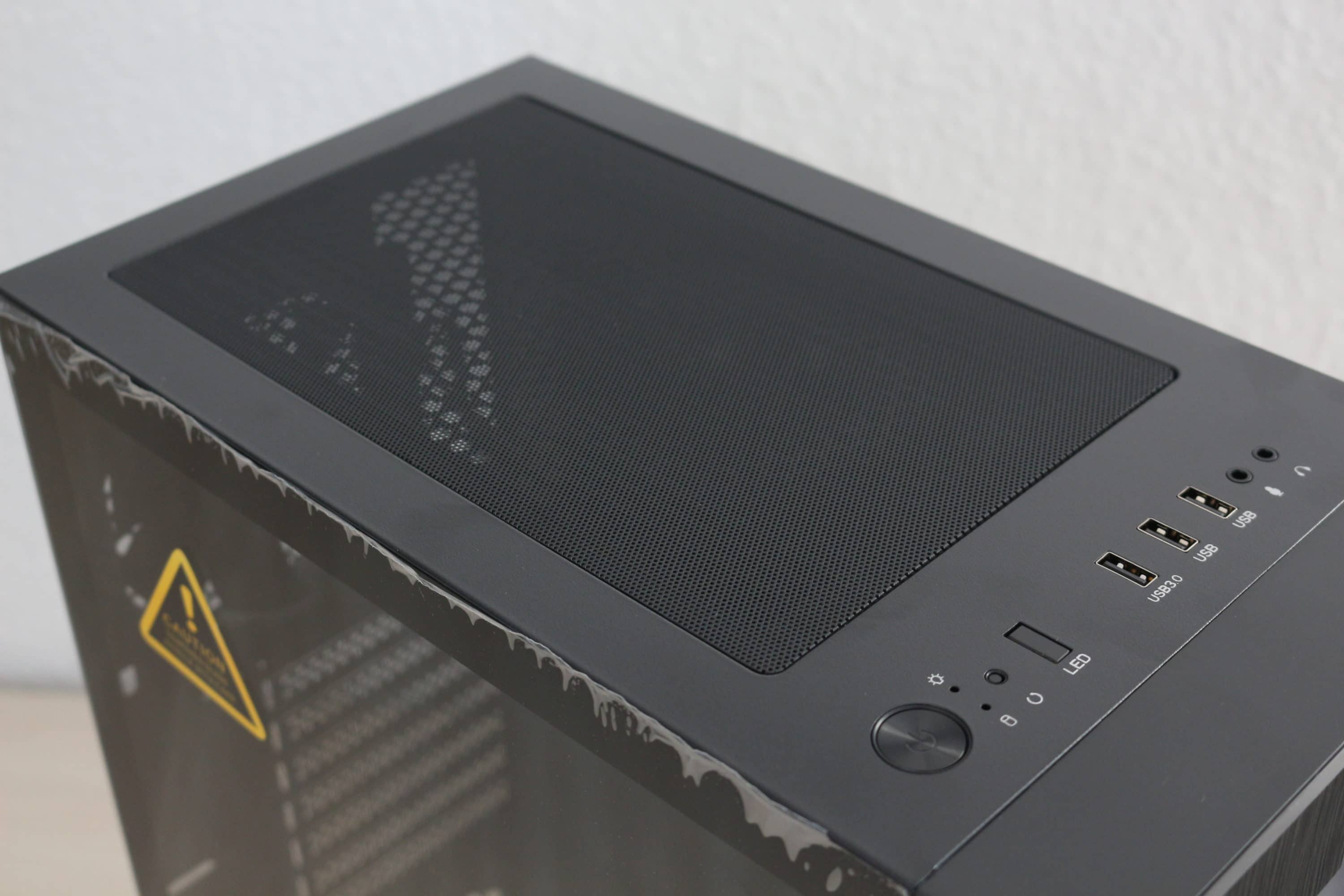 Hebt man den Blick, dann sticht einem direkt die große Lüfteröffnung im Deckel ins Auge. Diese verfügt neben Montagepunkten für Radiatoren und Lüfter auch über einen magnetischen Staubfilter aus Mesh. Außerdem befindet sich im Deckel das I/O-Panel. Vorhanden sind hier drei USB-Ports (1x USB 3.0, 2x USB 2.0), 1x Kopfhörer und 1x Mikrofon, 1x Power, 1x Reset und einmal 1x LED zu Steuerung des RGB-Streifens. Ein schönes Detail ist zudem, dass alle Ports und Schalter schwarz gehalten sind.