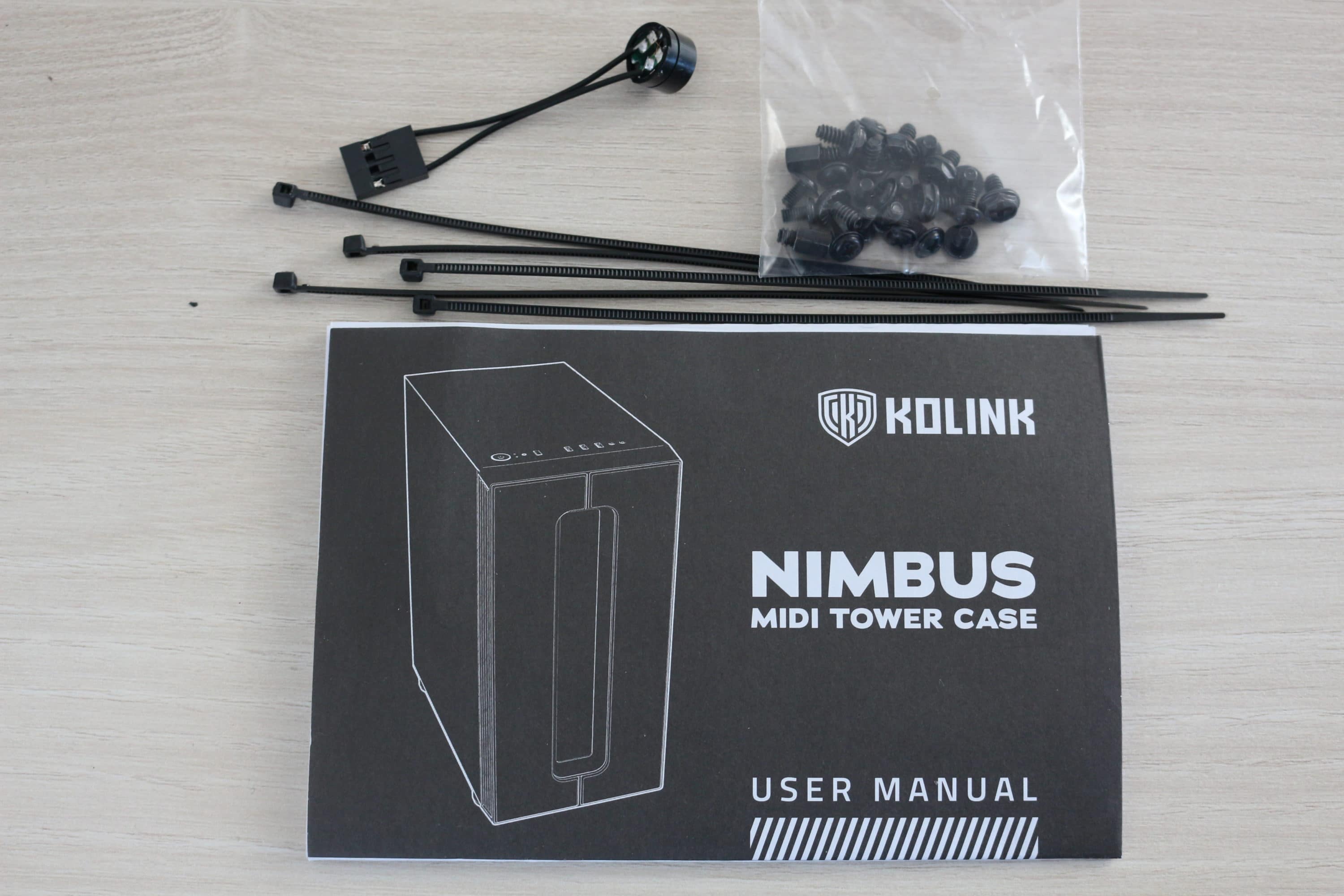 Das Kolink Nimbus kommt gut und sicher verpackt in einem braunen Karton mit schwarzer Schrift und ist von weichem Styropor umhüllt. Des Weiteren hat der Hersteller das Glaselement mit einer zusätzlichen Schutzfolie beklebt, um dieses vor Kratzern zu schützen. Das mitgelieferte Zubehör wurde in einem durchsichtigen Plastikbeutel innerhalb des Gehäuses mit einem Kabelbinder befestigt. Dieser Beutel beinhaltet alle wichtigen Schrauben, Kabelbinder, einen Mainboard-Speaker und eine Anleitung. Außerdem gehören zum Lieferumfang der bereits vorinstallierte Gehäuselüfter, das RGB-Element in der Front und die vorinstallierten Abstandshalter.