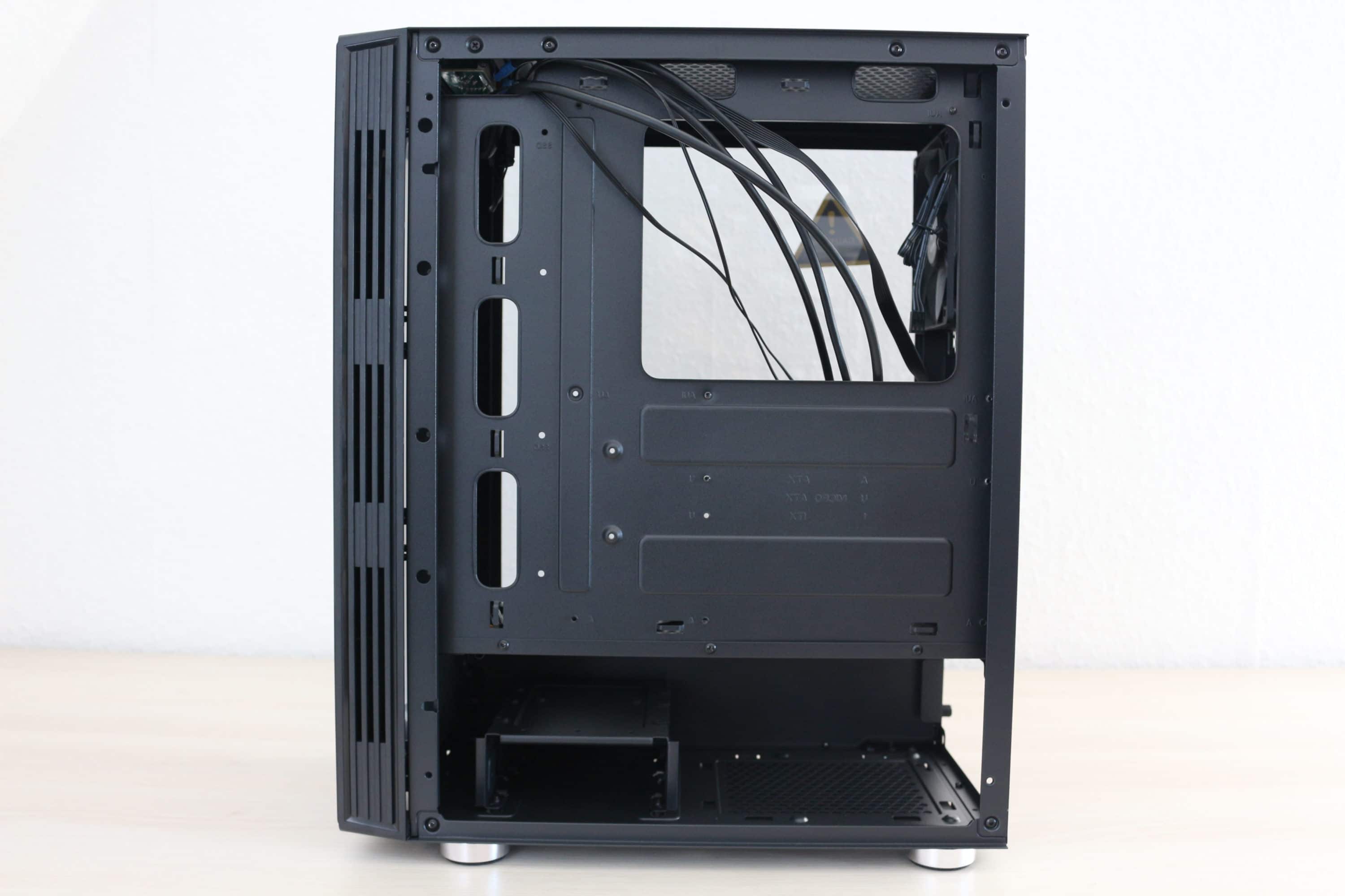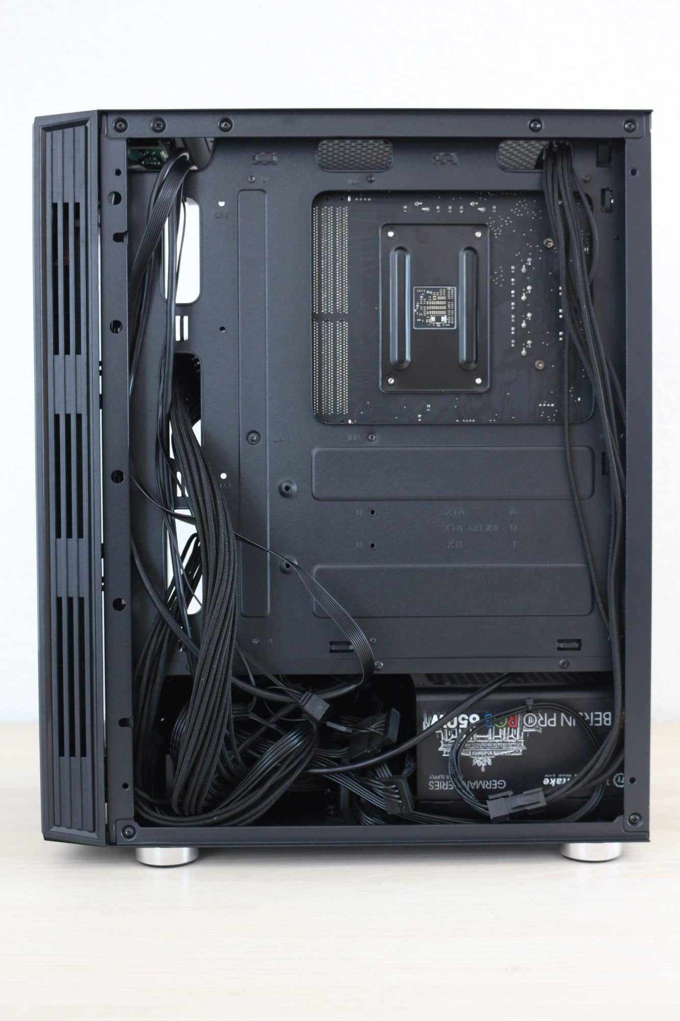 Auf der Rückseite stehen ca. 20 mm Platz zur Verfügung, um zahlreiche Kabel zu verstauen. Im Zusammenspiel mit der Netzteilabdeckung und den sinnvoll platzierten Kabelmanagement-Öffnungen führt das zu einem ordentlichen Gesamtergebnis. Selbst die zusätzlichen Kabelverlängerungen lassen sich gut unter der Abdeckung verstauen.