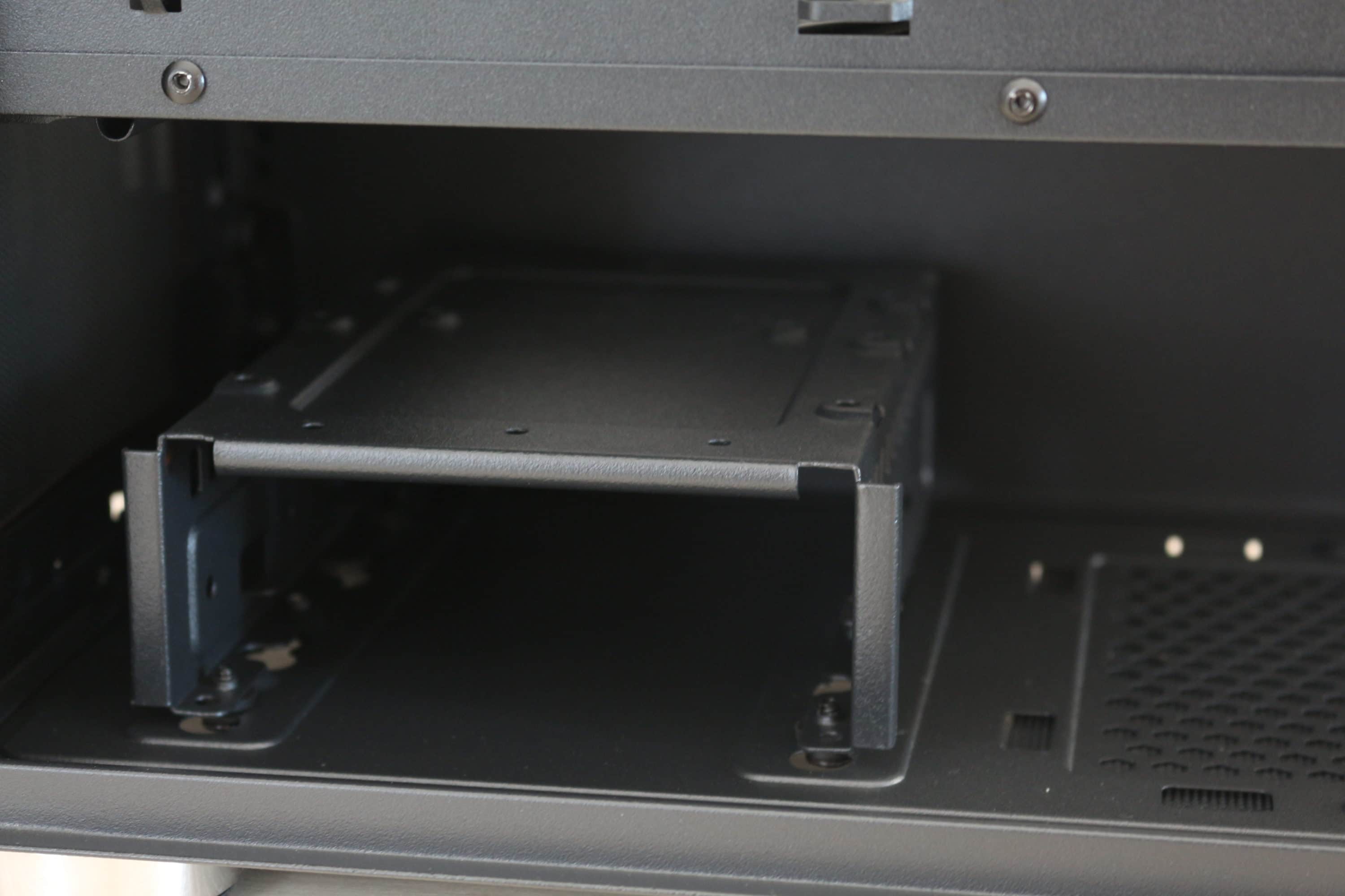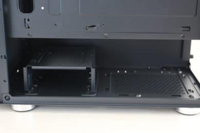 Die Montage von Datenträger erfordert zwar einen Schraubendreher, ist aber denkbar einfach. Zwei große 3,5″-Festplatten können im Käfig unterhalb der Abdeckung untergebracht werden. Durch die Gummiringe kann der Käfig einfach herausgezogen, mit 3,5″-Festplatten bestückt und wieder zurückgeschoben werden. Die Befestigung der HDDs erfolgt über vier herkömmliche Schrauben. Die Entkopplungswirkung ist OK. SSDs finden rechts neben dem Mainboard direkt am Tray Platz. Dadurch werden dann aber auch zwei der drei Kabelmanagement-Öffnungen verdeckt und können nicht mehr benutzt werden. Das könnte die Verkabelung aller Komponenten deutlich erschweren.