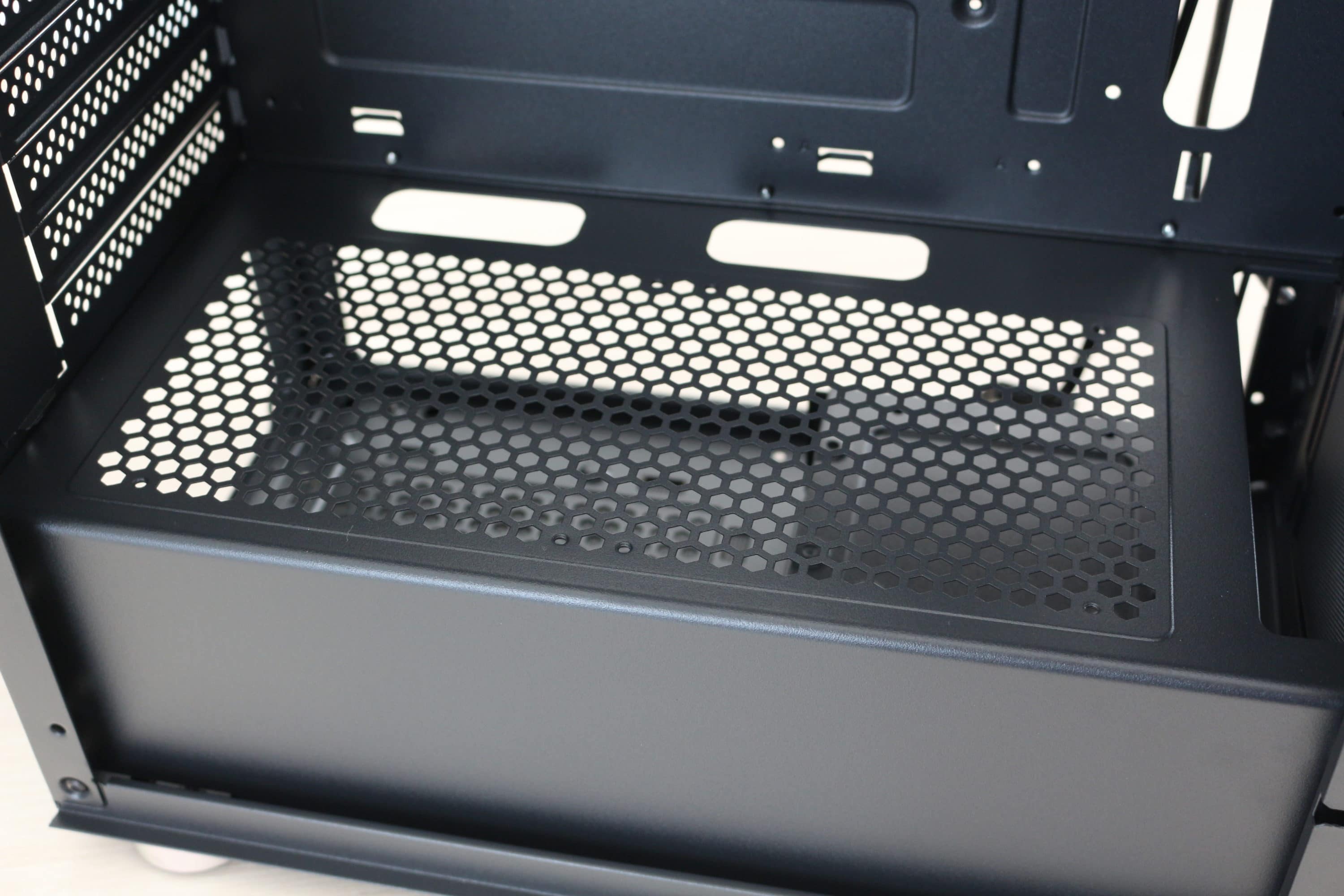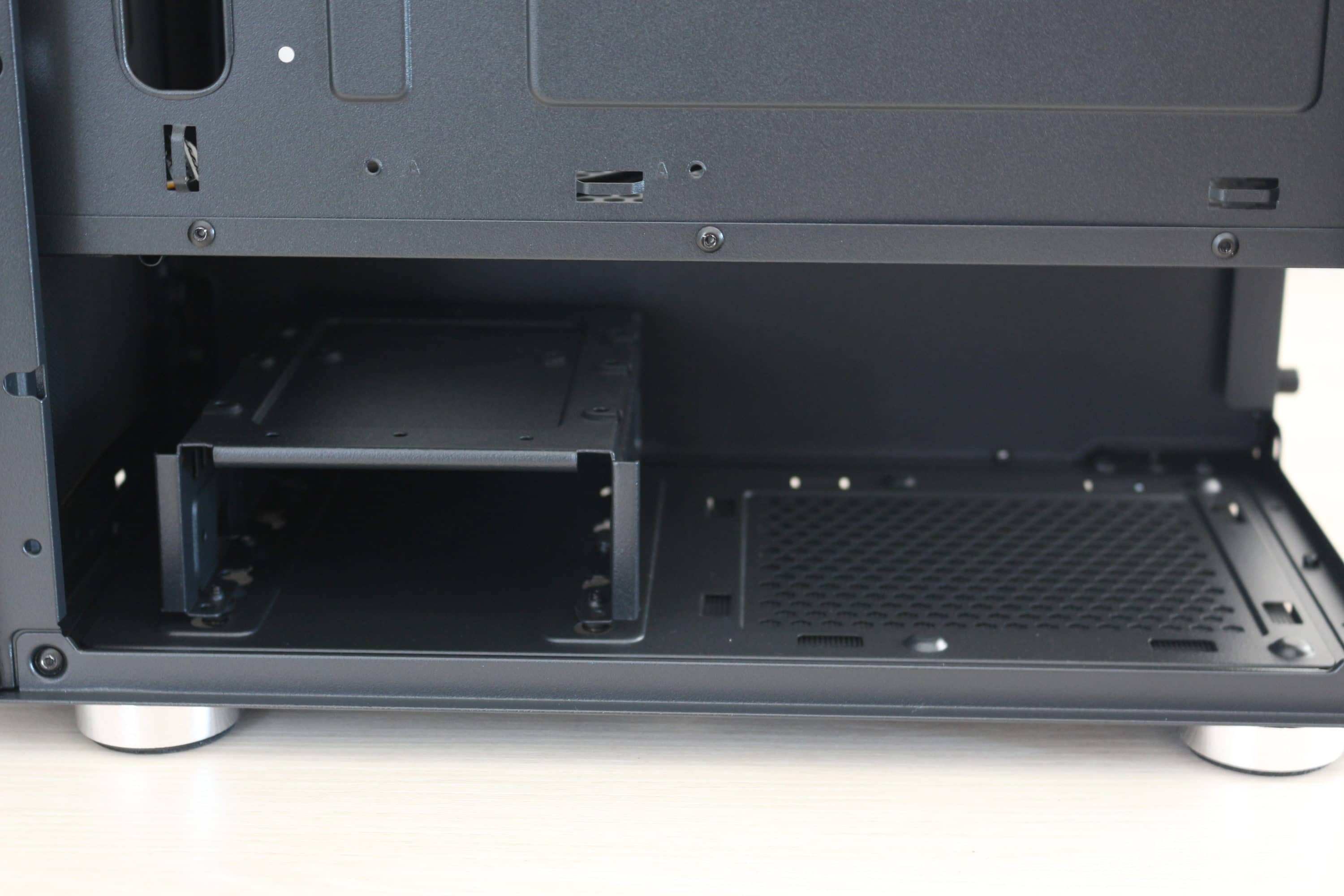 Wenden wir uns nun der Rückseite und der unteren Kammer zu. In dieser werden das Netzteil und zwei weitere Festplatten untergebracht. Dazu hat Kolink links neben dem Netzteilbereich einen Festplattenkäfig angebracht, in dem zwei 3,5″-HDDs Platz finden. Der Käfig ist über vier Schrauben und Gummiringe befestigt und entkoppelt. Wird der Platz unterhalb der Abdeckung für ein größeres Netzteil benötigt, kann der Käfig auch komplett ausgebaut werden. Das Netzteil sitzt rechts neben dem HDD-Käfig und ruht auf normalen Standoffs aus Stahl.