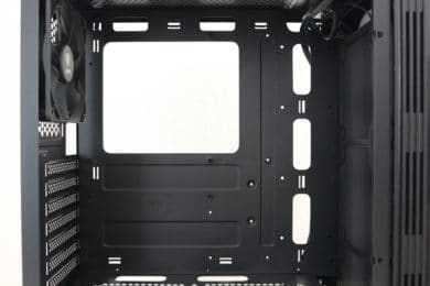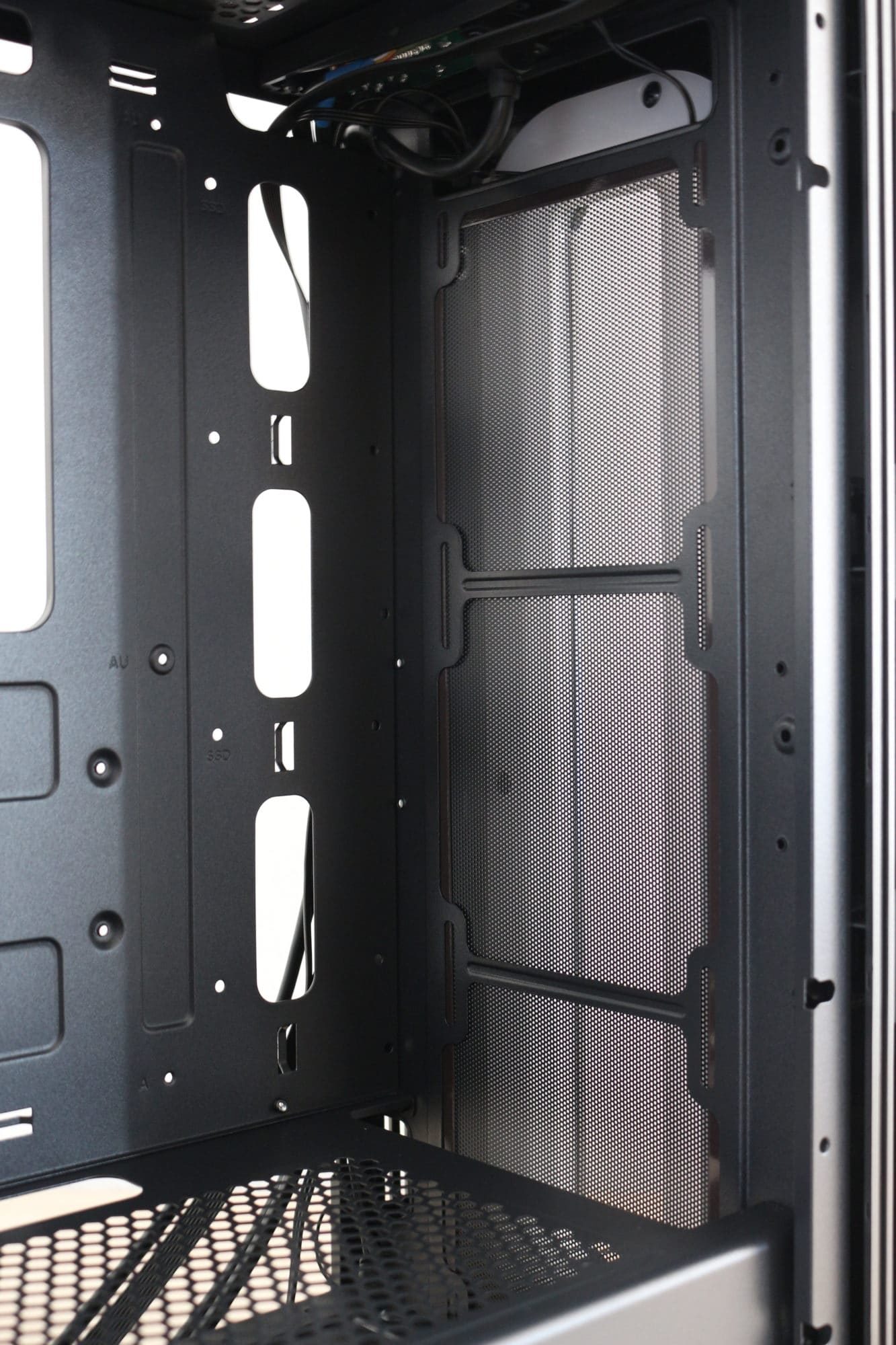 Die Trennung der Kammern erfolgt über eine Abdeckung, die den kompletten unteren Bereich des Towers durchzieht. Auf der Oberseite ist die Abdeckung komplett perforiert und ermöglicht dadurch auch eine umgedrehte Montage das Netzteils (mit dem Lüfter nach oben). Oberhalb der Abdeckung finden das Mainboard und die Erweiterungskarten Platz. Zusätzlich wurden das Tray und die Netzteilabdeckung mit Öffnungen für die CPU-Kühlermontage und das Kabelmanagement ausgestattet. Rechts neben dem Mainboard können zudem zwei 2,5″-SSDs zur Schau gestellt werden. Damit ausreichend kühle Luft in den Innenraum befördert werden kann, lässt das Nimbus in der Front die Montage von insgesamt drei 120 mm-Lüftern oder zwei 140 mm-Lüfter zu. Weitere Lüfter können im Deckel montiert werden.