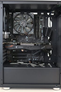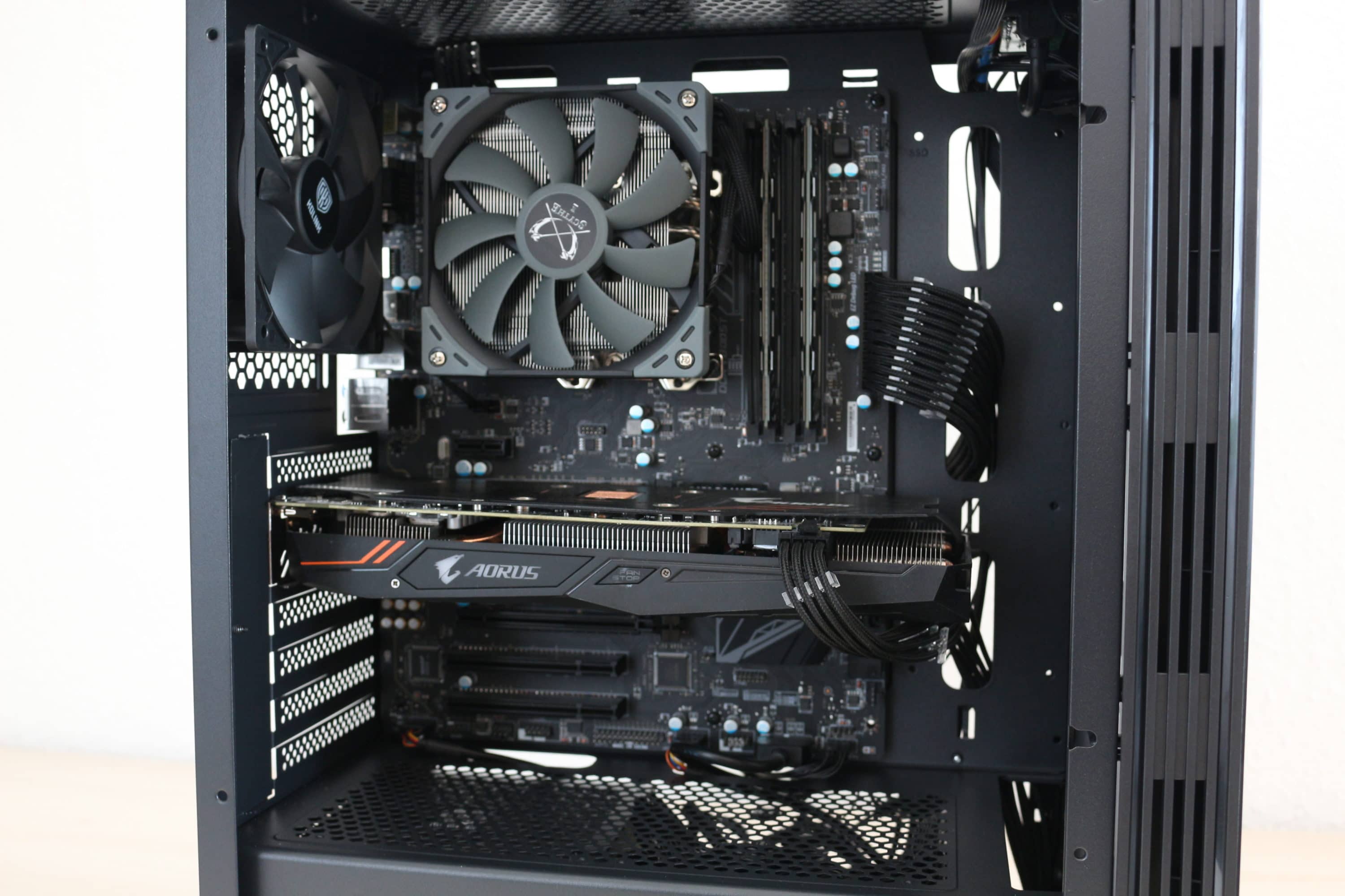 Nun kommen wir zum Systemeinbau. Als Hardware verwenden wir einen AMD Ryzen 5 1400 auf einem MSI B350 PC Mate mit 16GB Crucial Ballistix Sport LT grau DDR4-2666. Die Kühlung des Prozessor übernimmt der Scythe Shuriken 3*. Für die Bildausgabe ist eine GTX 1060 6GB von Gigabte AORUS zuständig. Die Stromversorgung erledigt das nichtmodulare Berlin Pro RGB 650W mit RGB-Lüfter. Um die Verkabelung optisch noch etwas aufzuwerten, wurden zudem einzeln gesleevte Kabelverlängerungen von Phanteks verwendet.