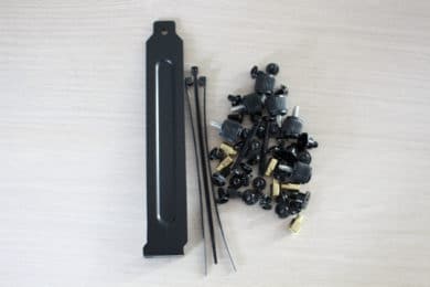 Wie alle Kolink-Gehäuse kommt auch das Refine gut und sicher verpackt in einem braunen Karton mit schwarzer Schrift und ist von normalem Styropor umhüllt. Des Weiteren hat der Hersteller das Glaselement mit zwei zusätzlichen Schutzfolien beklebt, um dieses vor Kratzern zu schützen. Das mitgelieferte Zubehör wurde in einem durchsichtigen Plastikbeutel innerhalb des Gehäuses mit einem Kabelbinder befestigt. Dieser Beutel beinhaltet alle wichtigen Schrauben, ein paar Kabelbinder, und eine PCI-Ersatzblende aus Kunststoff. Außerdem gehören zum Lieferumfang der bereits vorinstallierte Gehäuselüfter, das RGB-Element in der Front, zwei magnetische Staubfilter und die teilweise vorinstallierten Abstandshalter.