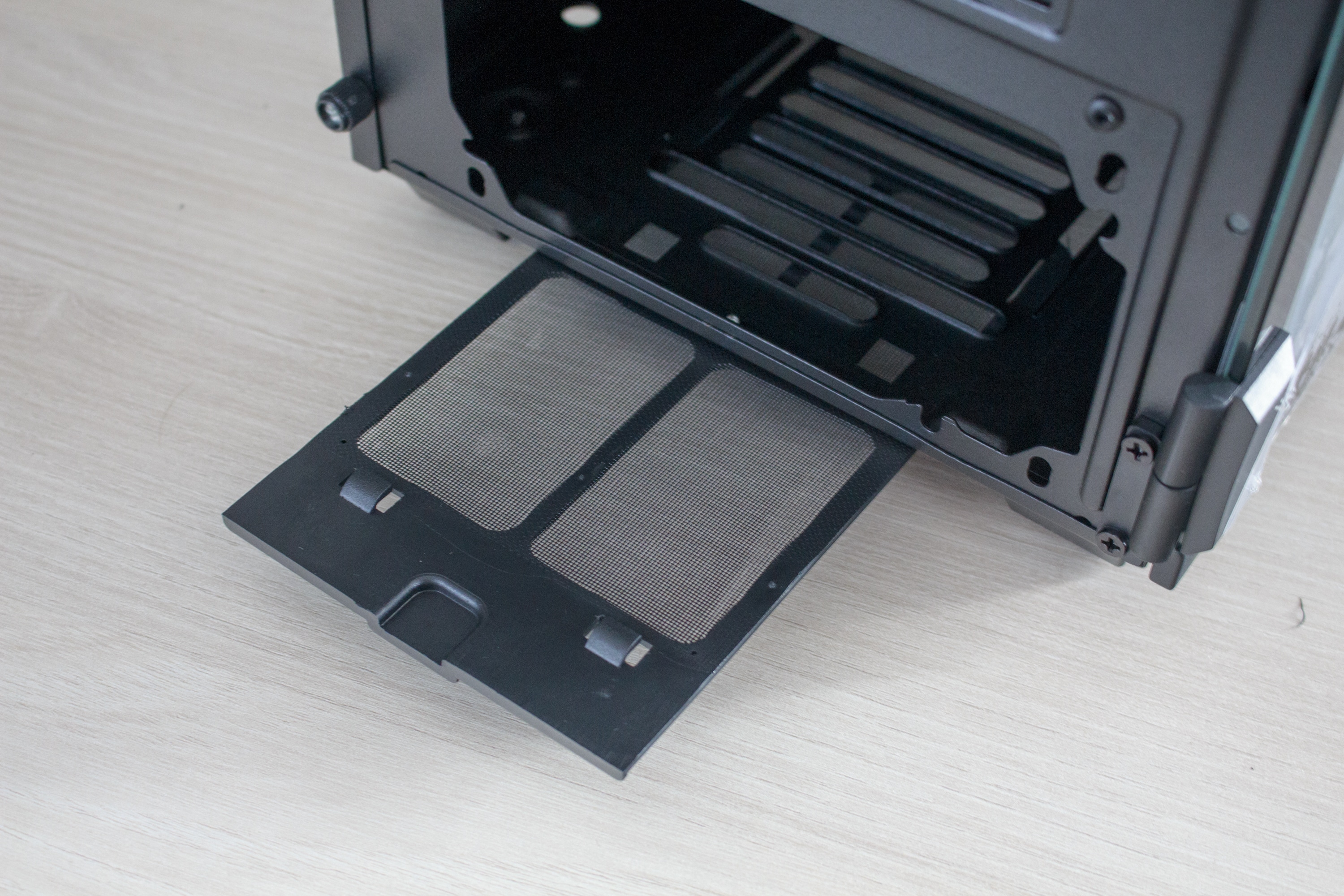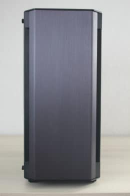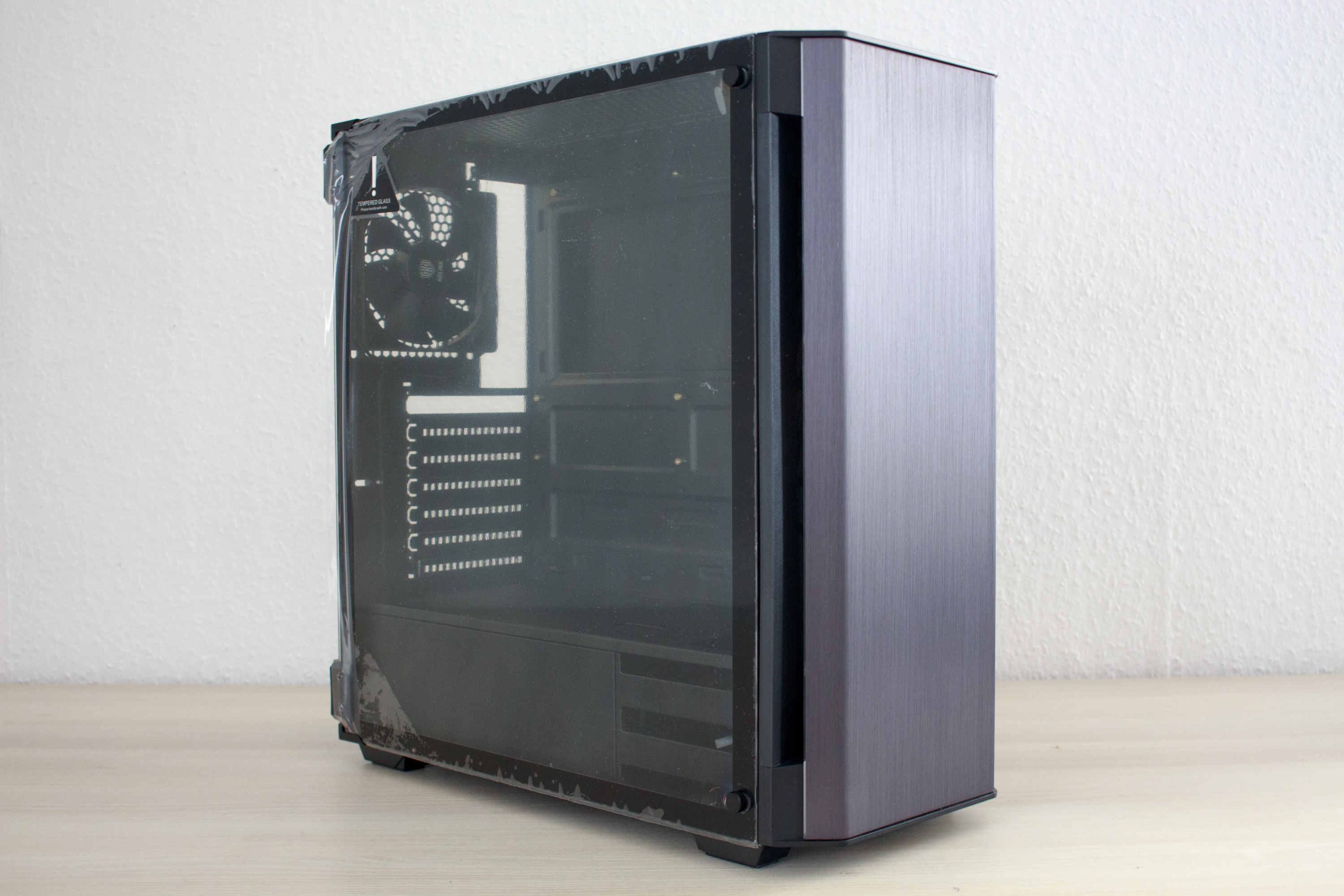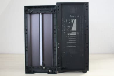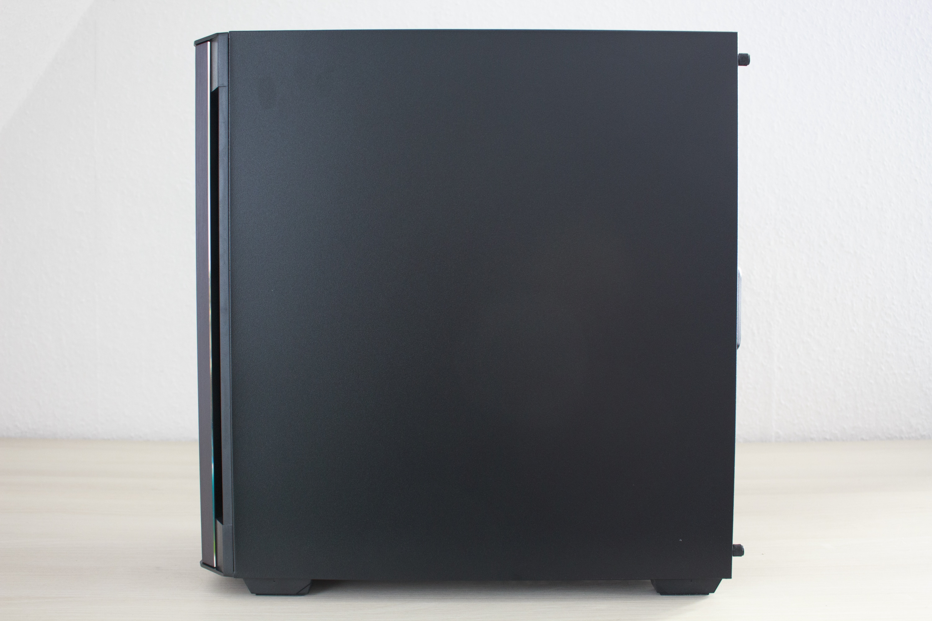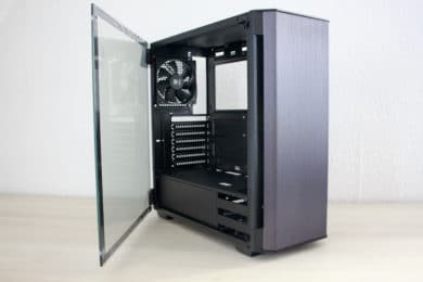 Das rechte Seitenteil ist beim Refine komplett aus Stahl und wirkt ausreichend stabil. Durch den Einsatz von Rändelschrauben und einer Ausziehhilfe soll die Demontage des Sidepanel erleichtert werden. Das linke Seitenteil besteht aus einem vier Millimeter starken Glas (Tempered Glass) und verfügt über praktische Scharniere mit denen es einfach geöffnet werden kann. Damit das nicht unabsichtlich passieren kann, gibt es im vorderen Bereich noch zwei flache Rändelschrauben die das Panel an Ort und Stelle halten. Zum Einbau aller Komponenten lässt sich das Seitenteil bei Bedarf auch komplett abnehmen.