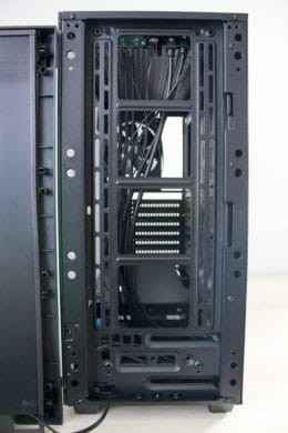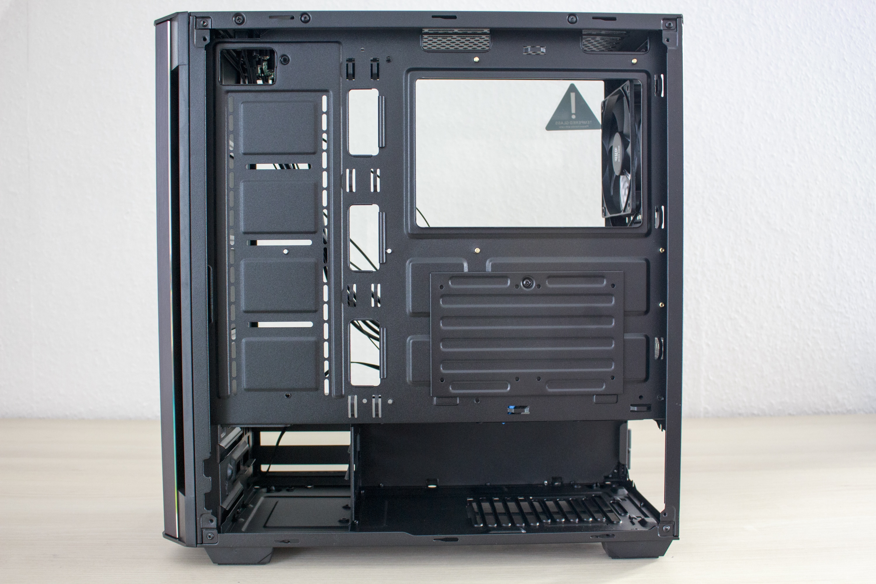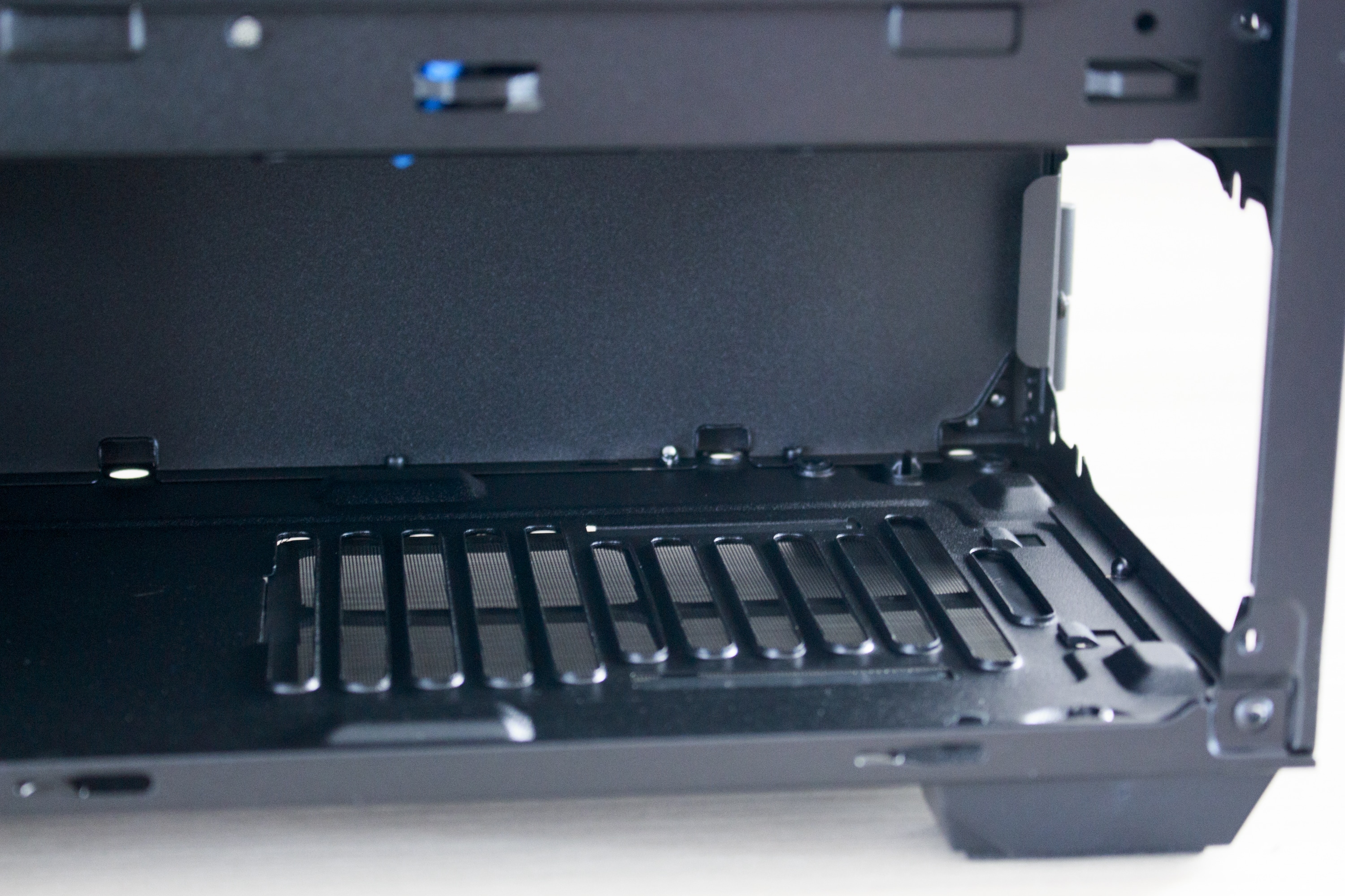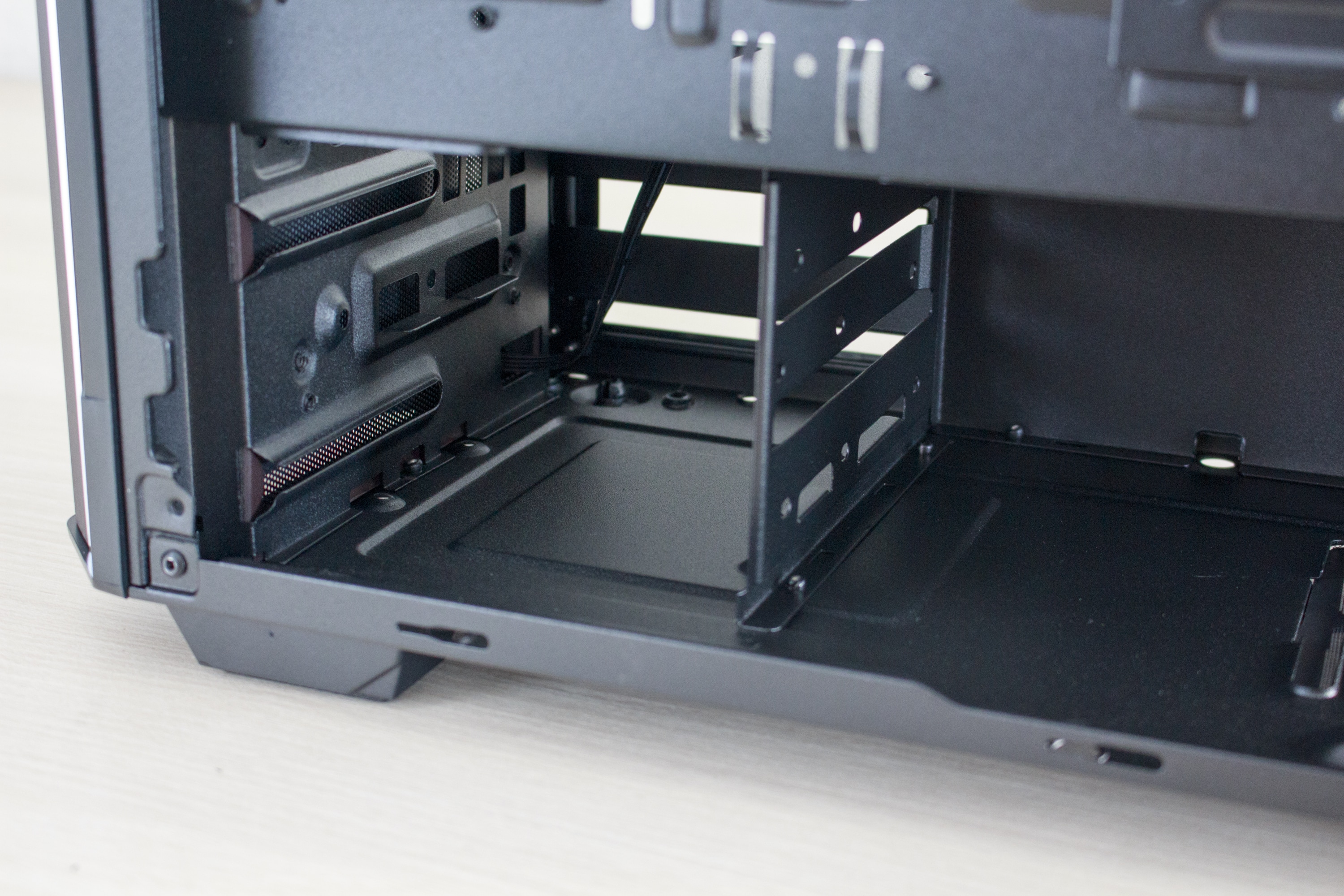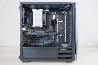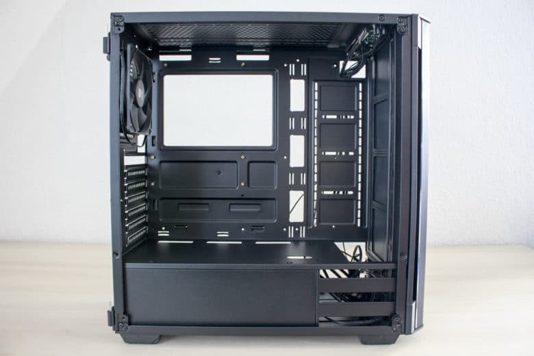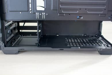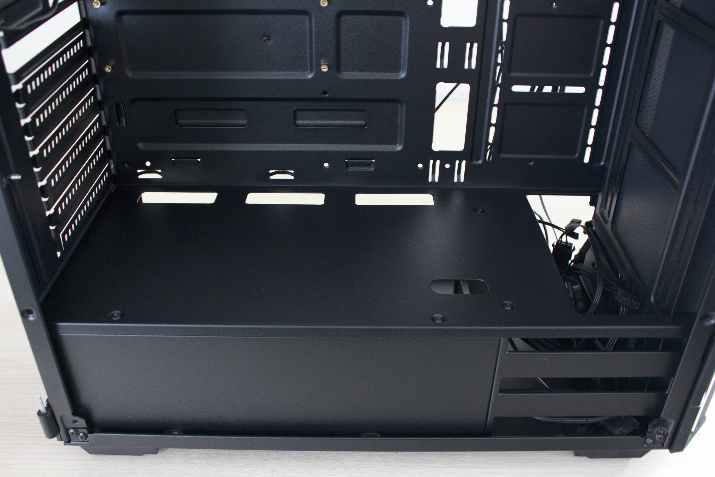 Im oberen Bereich werden das Mainboard, Grafikkarten und Luftkühler bzw. Wasserkühlungen platziert. Um einen optimalen Airflow gewährleisten zu können, befinden sich hinter den optionalen Frontlüftern keine Laufwerksschächte oder sonstige störende Elemente. Rund um das Mainboard sind passend dimensionierte Kabelmanagement-Öffnungen im Mainboard-Tray vorhanden. Der untere Bereich wird komplett durch eine Netzteilabdeckung verdeckt. Auch diese wurde mit Kabelmanagement-Öffnungen ausgestattet.