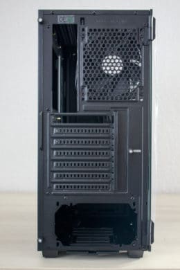 Das gleiche gilt für die Rückseite. Hier ist alles vorhanden was man von einem normal großen Midi-Tower erwarten dürfte. Das Netzteil wird unten montiert. Darüber befinden sich sieben PCI-Slotblenden. Typisch für Kolink-Gehäuse sind diese Blenden leider nicht wiederverwendbar und müssen vor dem Einbau des Mainboards herausgebrochen werden. Zuletzt sei an dieser Stelle noch der einzige vorinstallierte Lüfter mit einer Rahmenbreite von 120 Millimetern erwähnt.