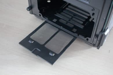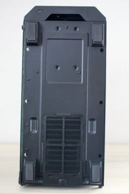 Der Midi-Tower steht auf vier soliden Füßen aus Kunststoff. Zum Schutz von empfindlichen Flächen und zur Entkopplung wurden diese Standfüße zusätzlich mit einem Gummistreifen versehen. Das am Boden zu positionierende Netzteil wird durch einen feinen und einfach zu entfernenden Gewebefilter geschützt. Ansonsten gibt es an der Unterseite keine weiteren Eigenschaften die nennenswert sind.