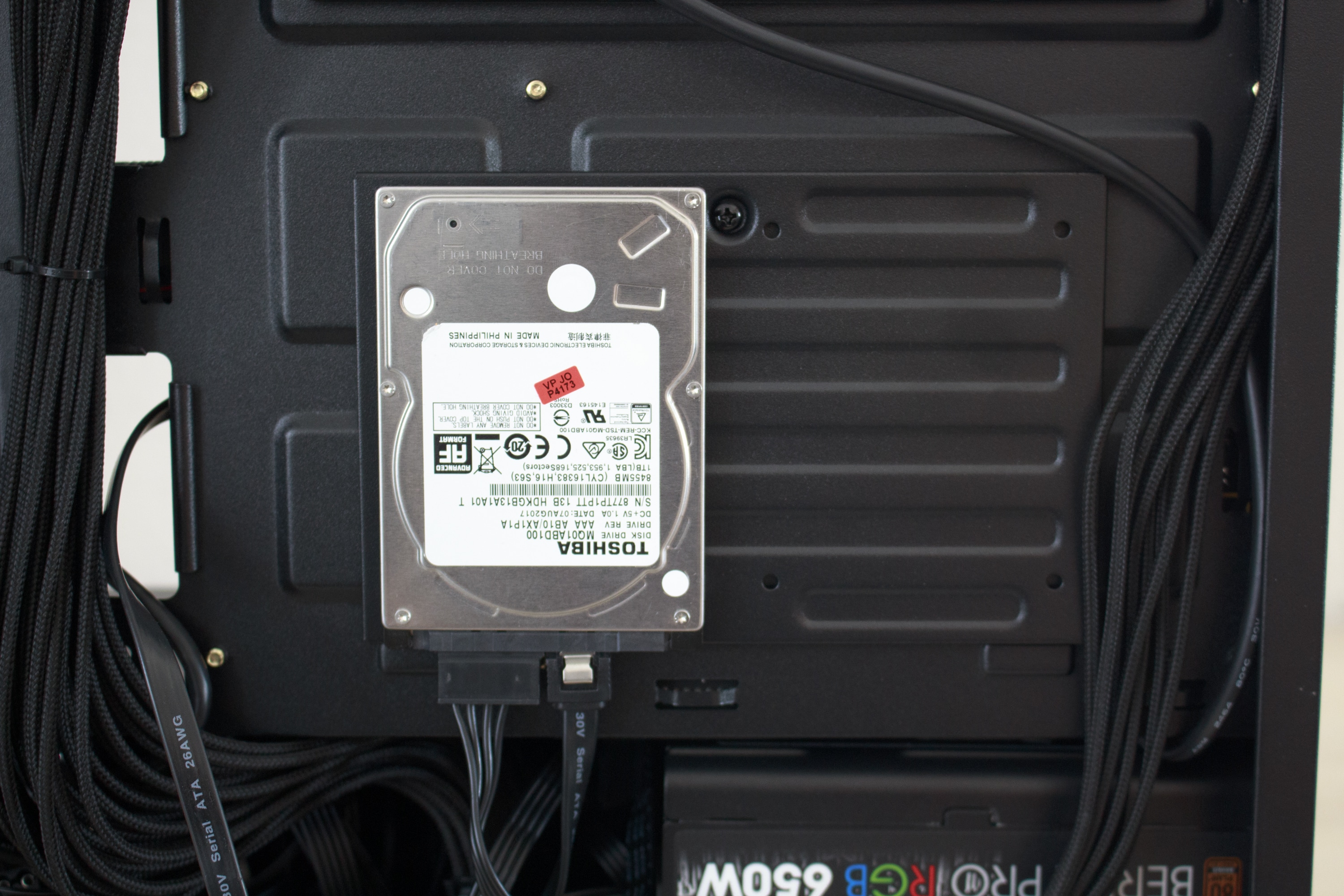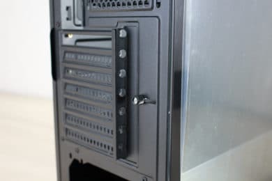 Die Montage der Datenträger erfordert in allen Fällen die Verwendung eines Schraubendrehers. Große 3,5″-Festplatten kommen im HDD-Käfig im vorderen Bereich des Gehäuses unter. Zur Befestigung wird die HDD auf der linken Seite zuerst mit zwei speziellen Schienenschrauben ausgestattet und anschließend in den Schacht geschoben. Danach wird die Datenträger mit einer Rändelschraube auf der rechten Seite fixiert. Zwei SSDs können hinter dem Mainboards-Tray mit jeweils vier normalen Schrauben an einer Stahlplatte angebracht werden. Eine Entkopplung gibt es leider in keinem Fall.
