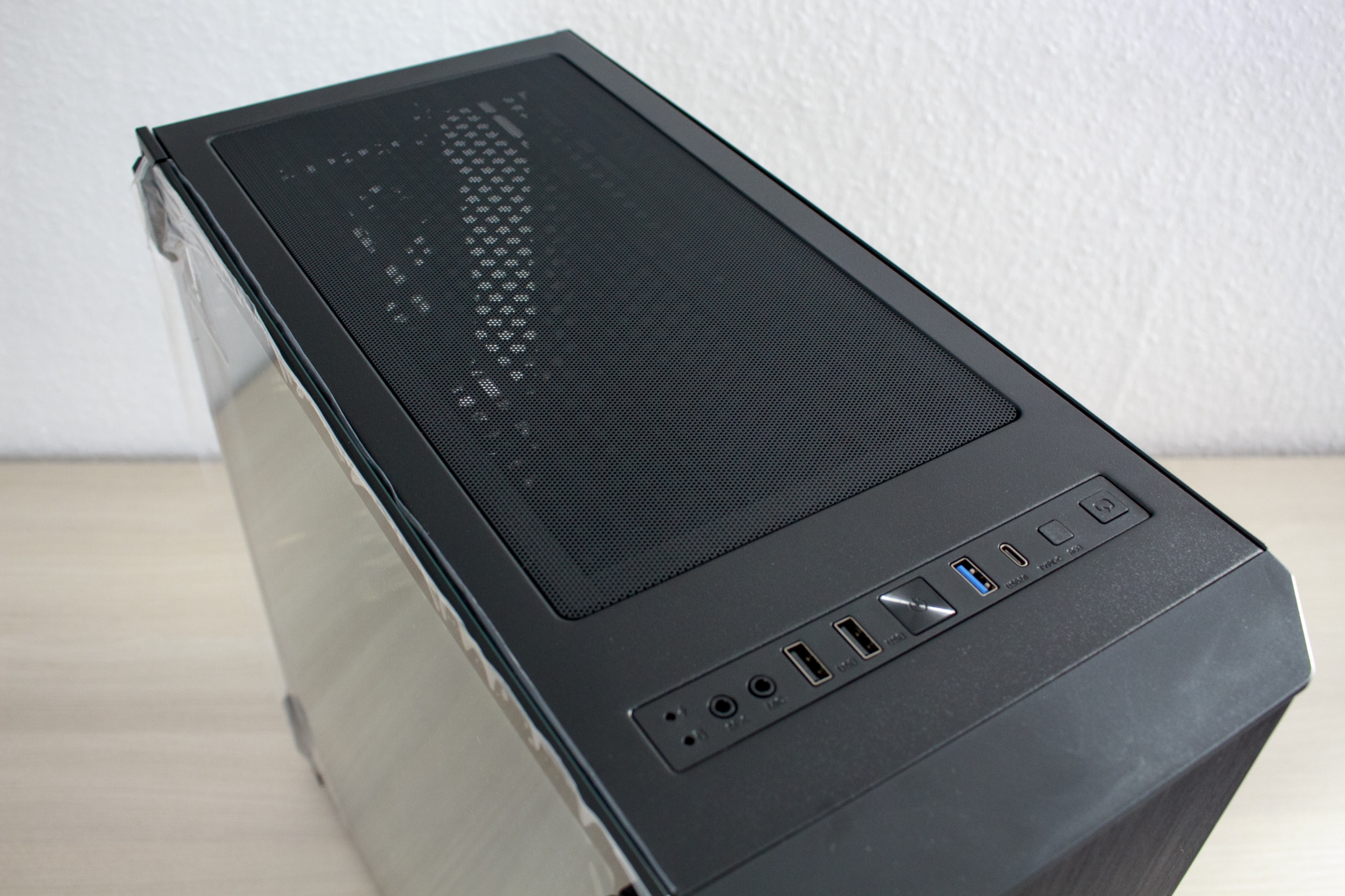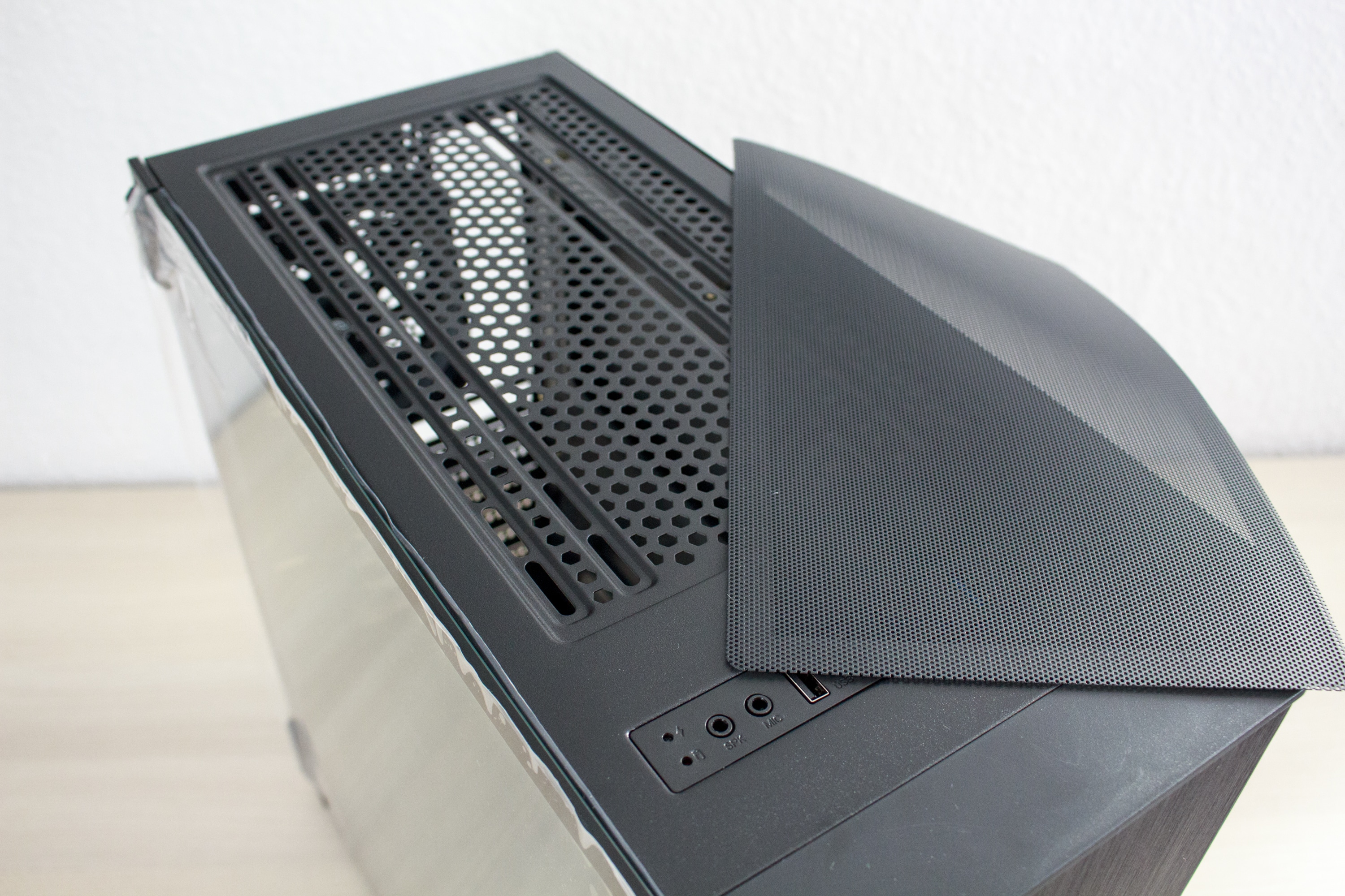 Hebt man den Blick und betrachtet die Deckelpartie, kann man auch hier eine große Lüfteröffnung und einen magnetischen Mesh-Staubfilter erkennen. Vor der Lüfteröffnung hat der Hersteller das I/O-Panel fixiert. Auch hier gibt es für den angestrebten Preis nochmal eine kleine Besonderheit. Neben den typischen Ports wie 2x USB 2.0, 1x USB 3.0, 1x Mikrofon und 1x Headset, gibt es beim Refine sogar einen USB 3.1 Typ-C Anschluss. Bei der Kontrolle der internen Stecker kommt aber die erste Ernüchterung. Der USB Typ-C-Anschluss verfügt auch nur über einen internen USB-3.0-Header. Besitzt man also kein Mainboard mit zwei internen USB 3.0-Headern, kann man also nicht alle Front-I/O-Ports anschließen.