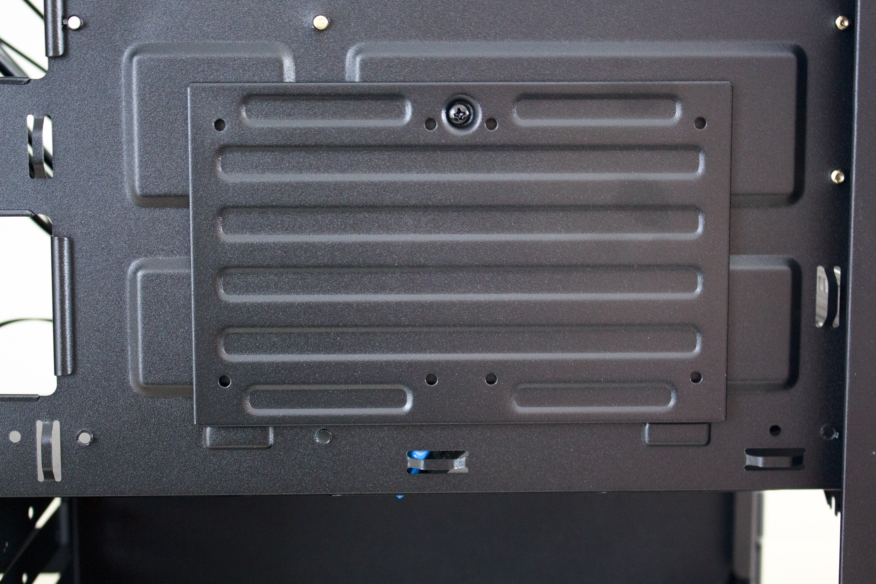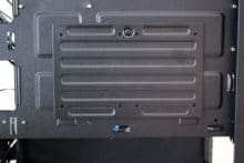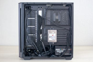 Wenden wir uns nun der Rückseite des Innenraums zu. Unterhalb der Netzteilabdeckung verbergen sich ein Festplattenkäfig für zwei 3,5″-HDDs und natürlich der Montageplatz für das Netzteil. Der Festplattenkäfig verfügt leider über keine Entkopplungmechanismen und ist auch nicht entfernbar. Auch die Stand-Offs für das Netzteil bestehen nur aus Stahl und besitzen keine Gummistreifen. SSDs können im Refine nur direkt am Mainboard-Tray angebracht werden. Hier erfolgt die Anbringung über eine große Stahlplatte.