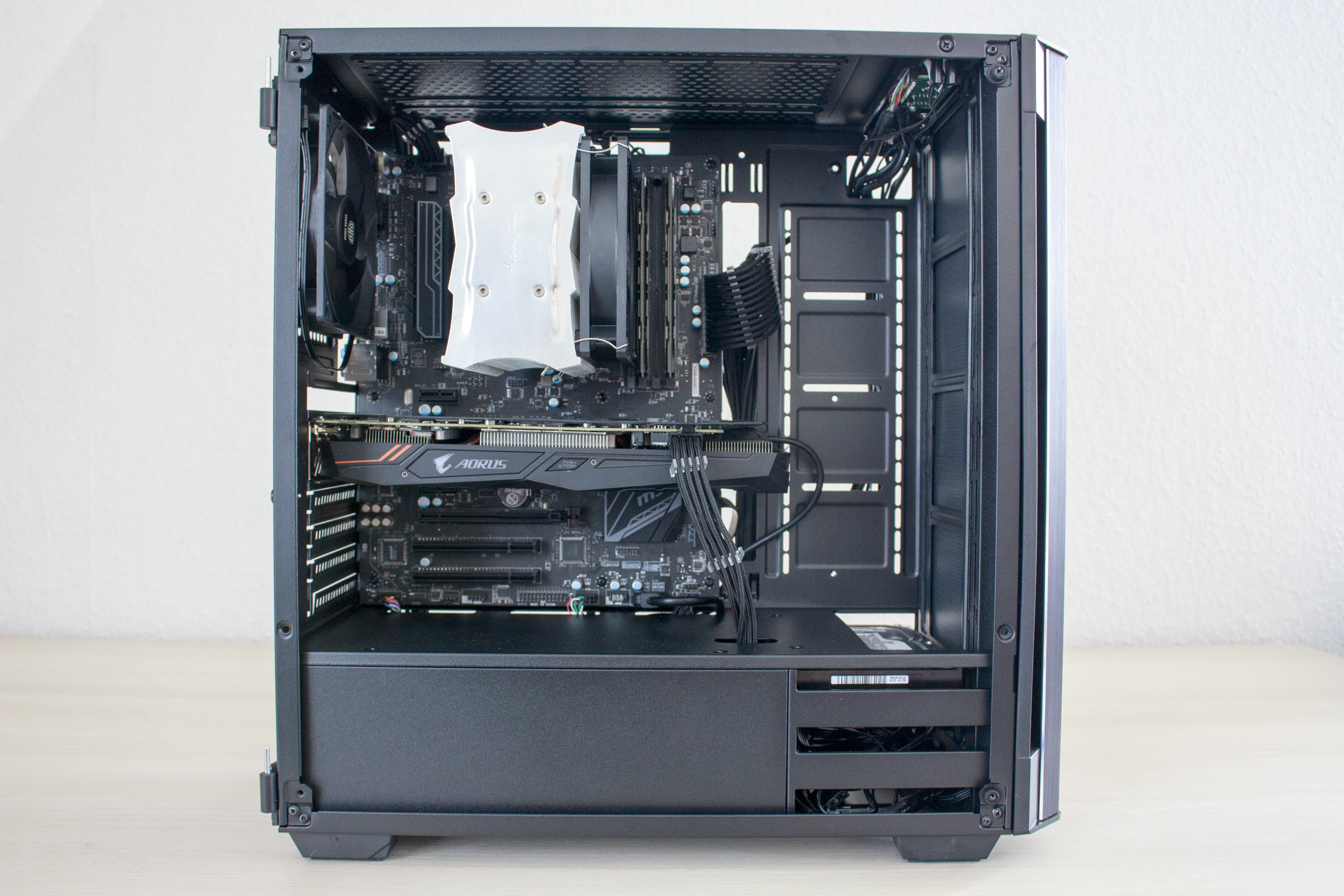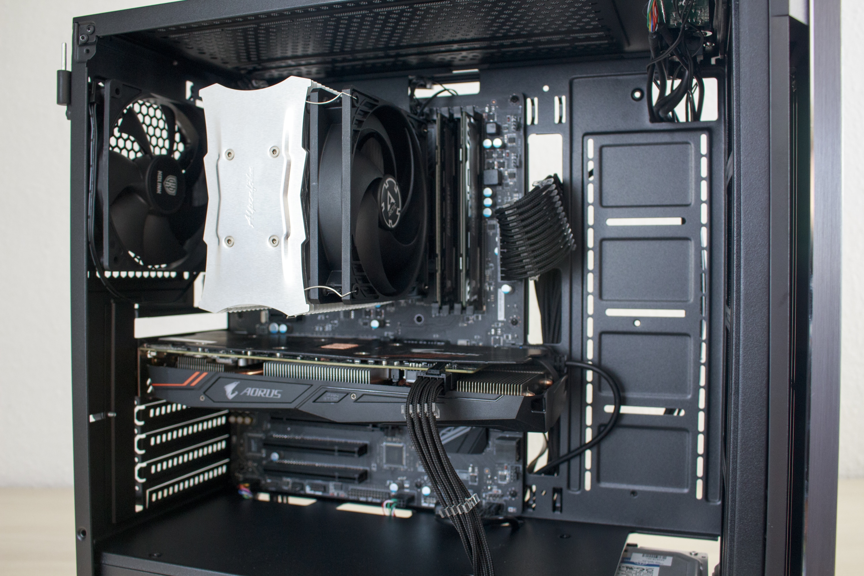 Nun kommen wir zum Systemeinbau. Als Hardware verwenden wir einen AMD Ryzen 5 1400 auf einem MSI B350 PC Mate mit 16GB Crucial Ballistix Sport LT grau DDR4-2666. Der Ryzen wird von einem EKL Alpenföhn Matterhorn Pure gekühlt. Für die Bildausgabe ist eine GTX 1060 6GB von Gigabte AORUS zuständig. Die Stromversorgung erledigt das nichtmodulare Berlin Pro RGB 650W mit RGB-Lüfter. Um die Verkabelung optisch noch etwas aufzuwerten, wurden zudem einzeln gesleevte Kabelverlängerungen von Phanteks verwendet.