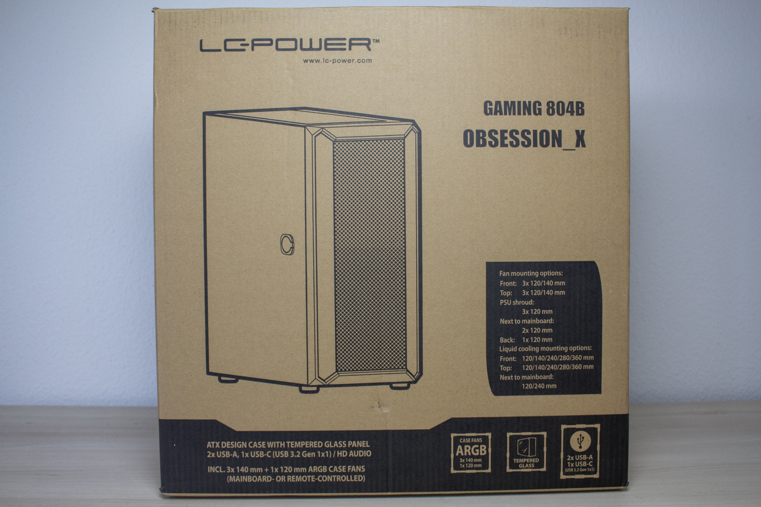 LC-Power verpackt das Gaming 804B Obsession_X in einem braunen Karton aus Pappe. Neben einigen schematischen Produktbildern und dem Gehäusenamen, wurden auf die Kartonage alle technischen Daten sowie die wichtigsten Features aufgedruckt. Im Inneren der Verpackung wurde der Midi-Tower von einer Folie aus Kunststoff und zwei Blöcken aus harten Styropor umhüllt, welche für das Gesamtgewicht des Midi-Towers leider grenzwertig dünn ausgefallen sind. Zum zusätzlichen Schutz für das Seitenfenster aus Hartglas, wurde dieses zusätzlich mit einer Schutzfolie beklebt.