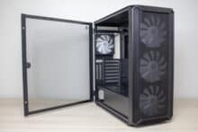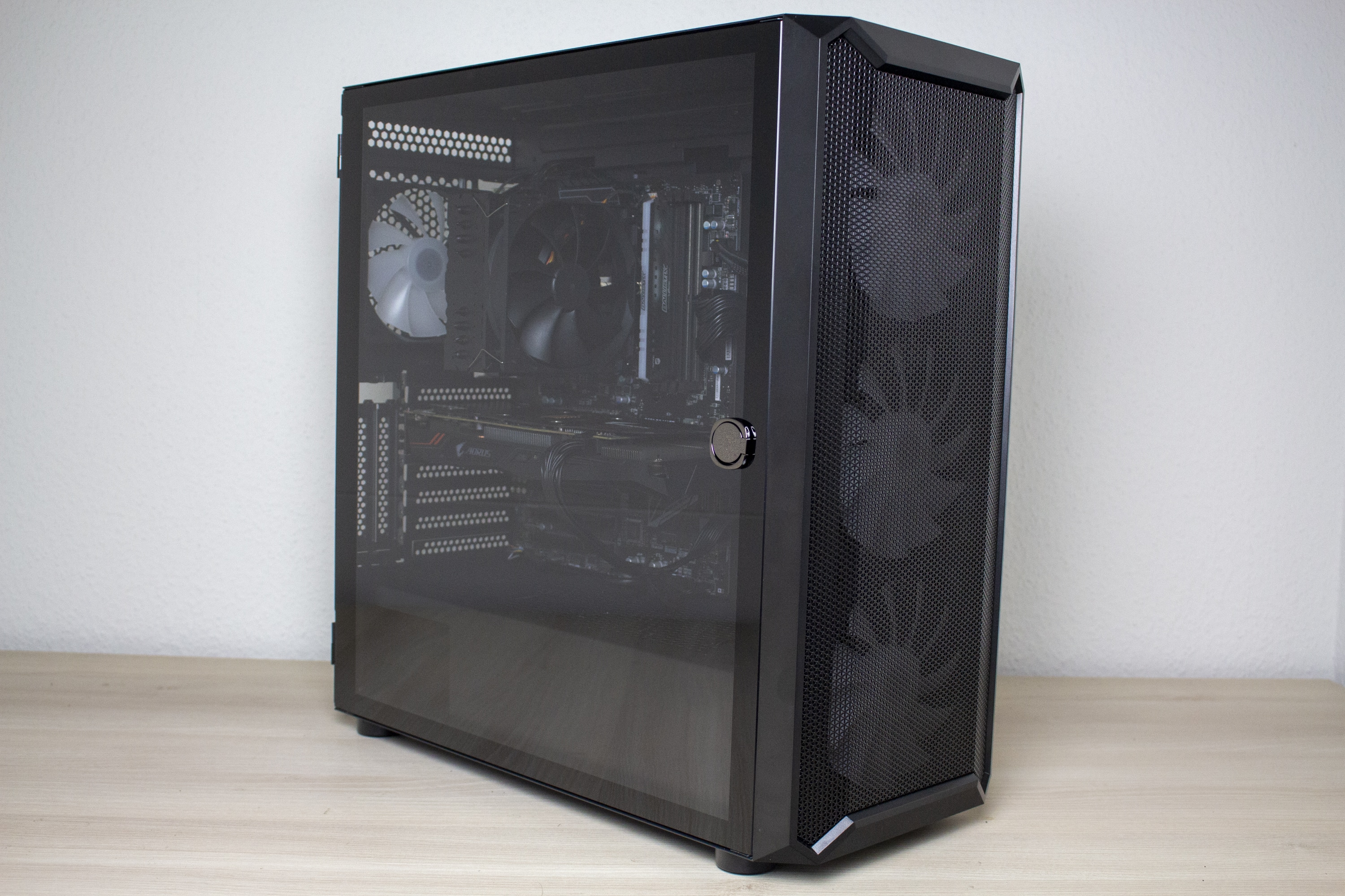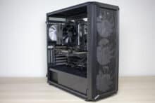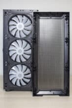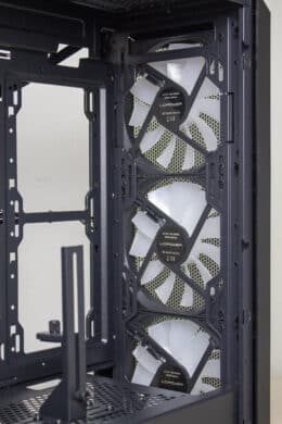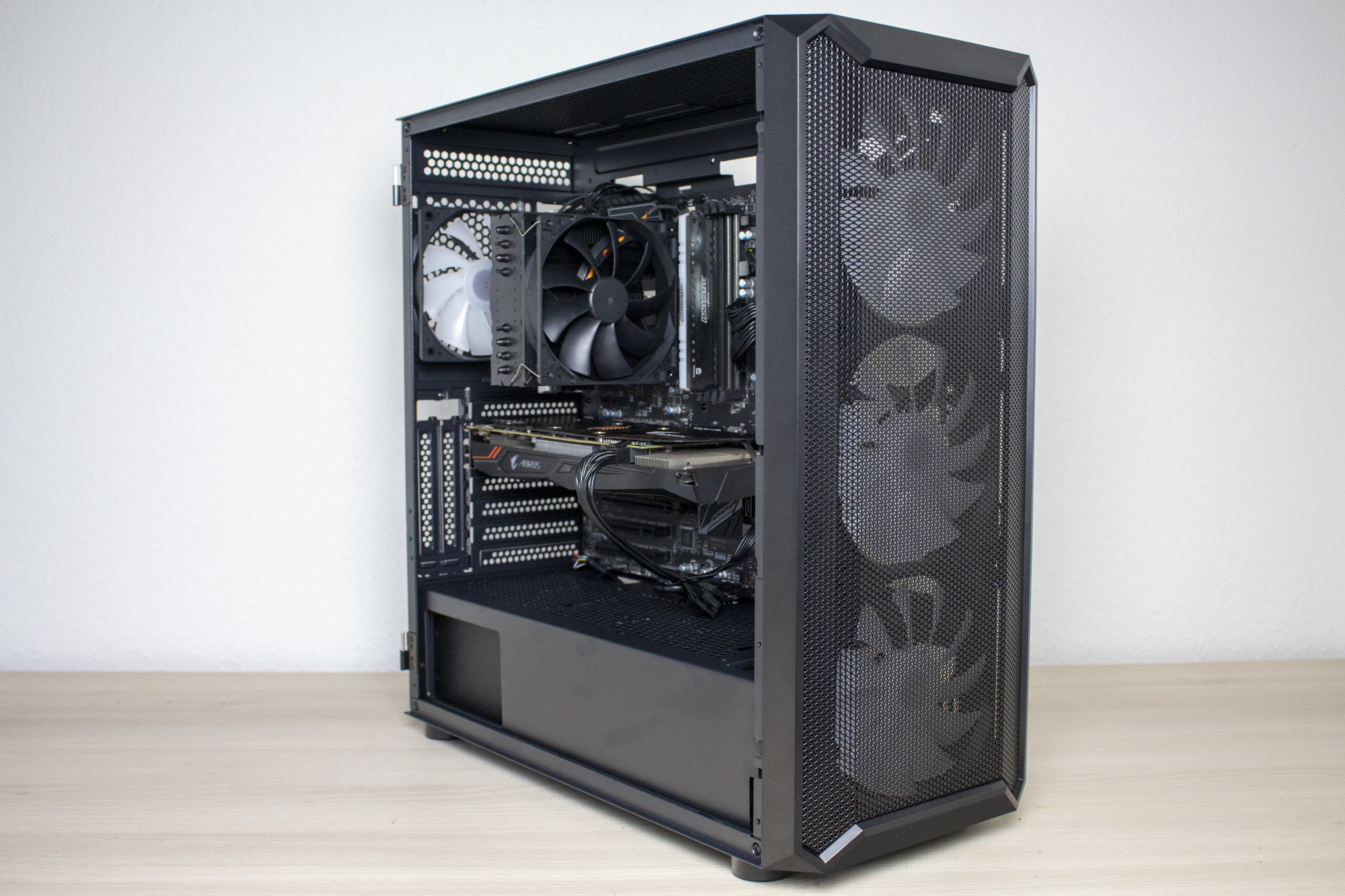 Leider gibt es aber auch ein paar negative Aspekte. Besonders auffällig ist dabei die Stabilität des Korpus, wenn das Front- sowie die Sidepanels nicht angebracht sind. Dann ist der Midi-Tower nicht mehr wirklich verwindungssteif und zudem recht leicht. Außerdem sind die mitgelieferten Lüfter zwar schick, in den Bereichen Fördervolumen und Nebengeräusche aber höchstens untere Mittelklasse. Zuletzt vermissen wir außerdem einen Staubfilter in der Front.