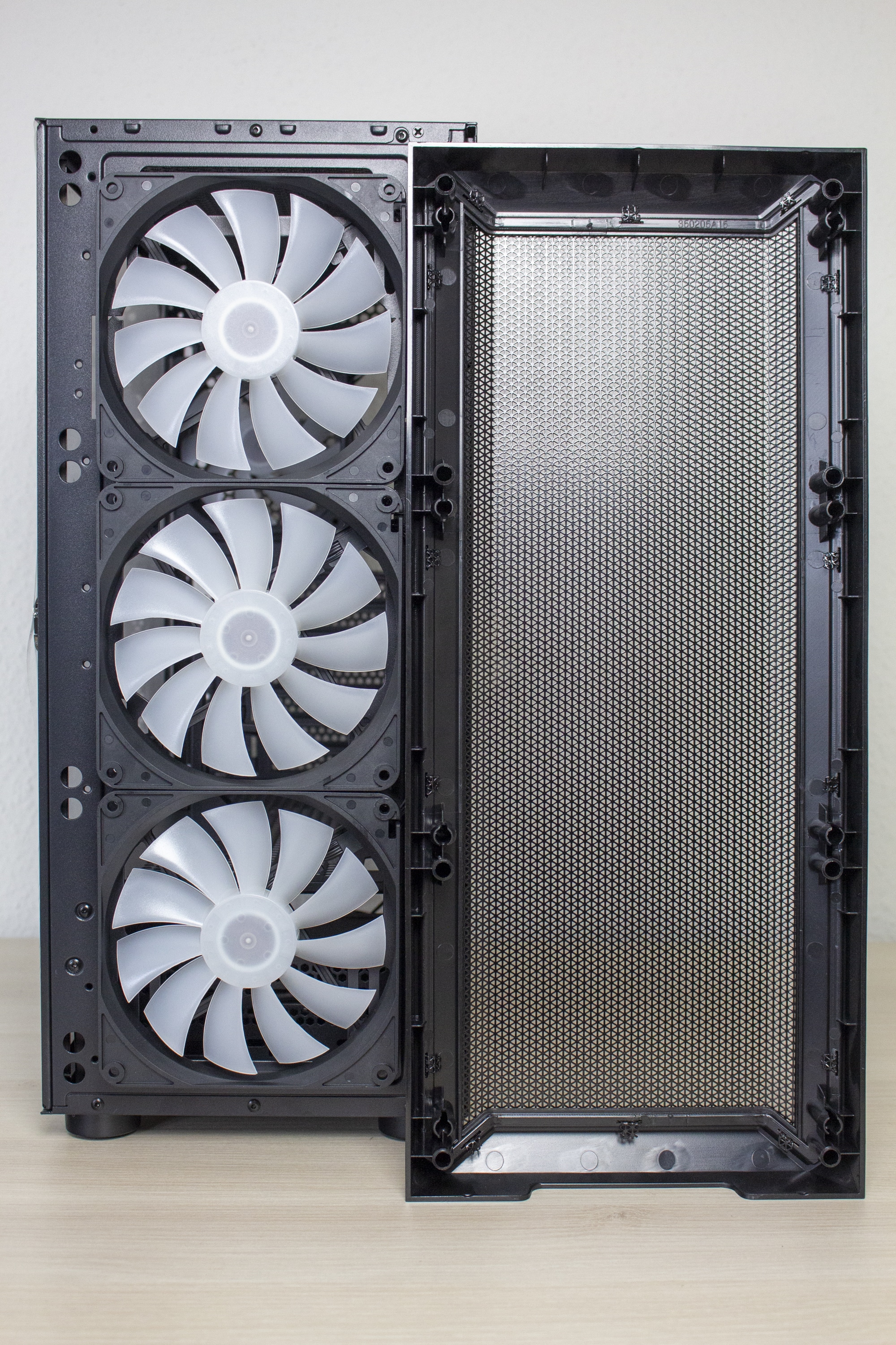 Aufgrund von Bauteilen mit hoher Verlustleistung setzen immer mehr Gehäusehersteller wieder auf luftige Gehäuse mit Mesh anstatt Glas am Frontpanel. Auch LC-Power geht diesen Weg und überspannt das Frontpanel des Gaming 804B Obsession_X mit einem Mesh-Gitter, welches sich aus kleinen Dreiecken zusammensetzt. Das Gitter ist wiederum von einem Rahmen aus schwarzem Kunststoff umrandet. Ein zusätzlicher Staubfilter wurde zu Gunsten des Airflows nicht an der Front platziert. Durch einen kräftigen Ruck lässt sich das Frontpanel entfernen und gibt den Blick auf die drei vorinstallierten 140-mm-ARGB-Lüfter frei. Alternativ können hier auch drei 120-mm-Lüfter oder entsprechende Radiatoren montiert werden.