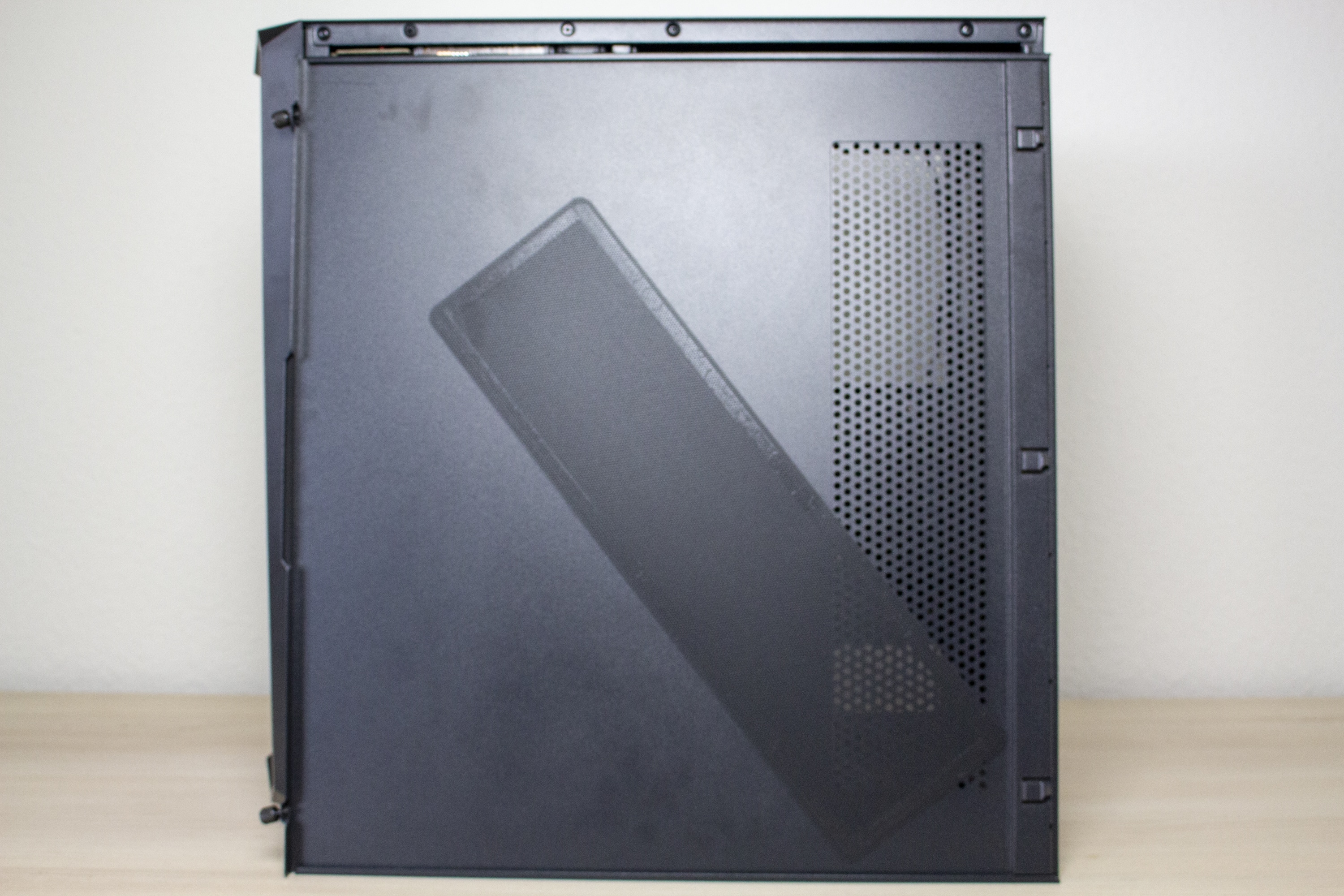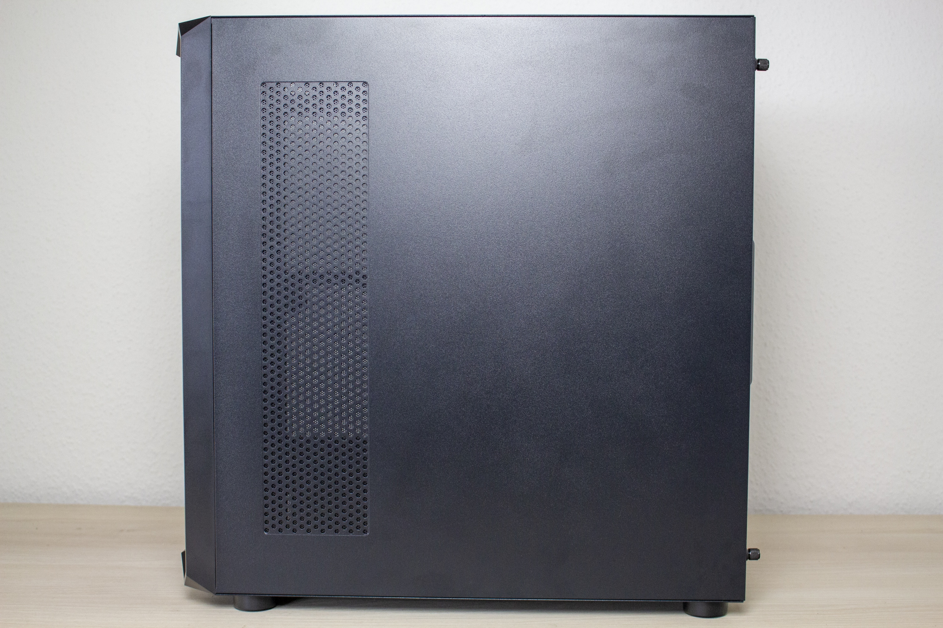 Da die RGB-Beleuchtung beim Gaming 804B Obsession_X eine große Rolle spielt, darf auf der linken Gehäuseseite natürlich das Seitenfenster aus Hartglas nicht fehlen. Dieses verfügt über einen Magnetverschluss und eine praktische Ausziehhilfe in Form eines Rings aus Metall. Darüber hinaus ist das Seitenfester auf zwei Scharnieren gelagert und kann ausgeklappt oder, bei Bedarf, komplett demontiert werden. Das rechte Seitenteil des Midi-Towers besteht aus Stahl und verfügt über eine gute Stabilität. Weiterhin kann es unverlierbare Rändelschrauben, eine Ausziehhilfe und ein weiteres Lüftergitter inklusive Staubfilter vorweisen.