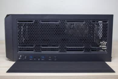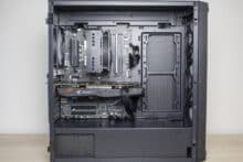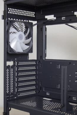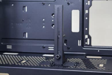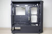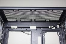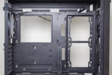 Insgesamt ist die große Kammer wenige restriktiv gestaltet. Hinter den Frontlüftern gibt es keine Festplattenkäfige oder sonstige Streben, die den Airflow stören oder für hörbare Luftverwirbelungen sorgen würden. Entsprechend luftig ist auch die Rückseite des Innenraums. Neben dem Lüfter verfügen alle Slotblenden und sonstige Bereiche über große Belüftungslöcher.