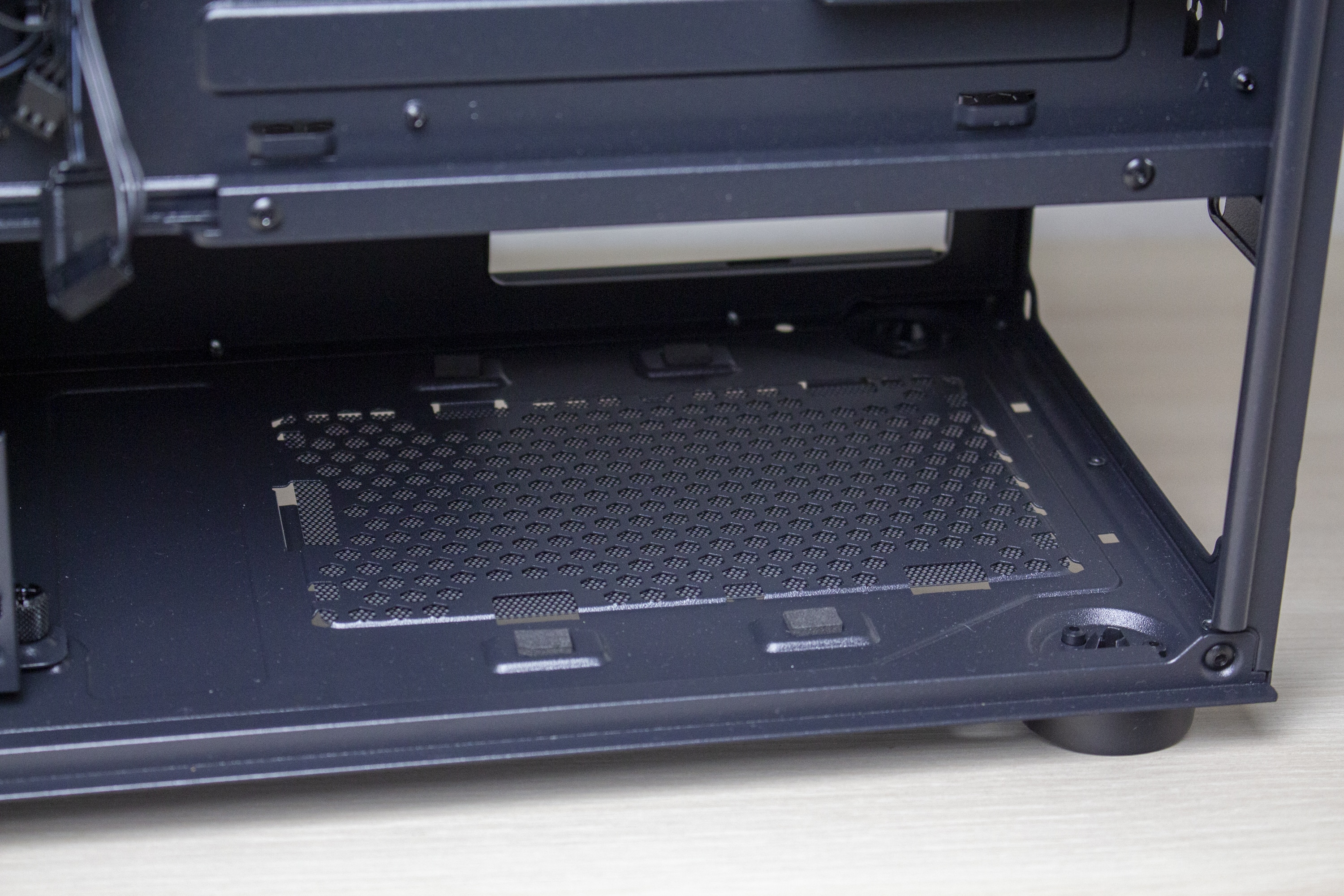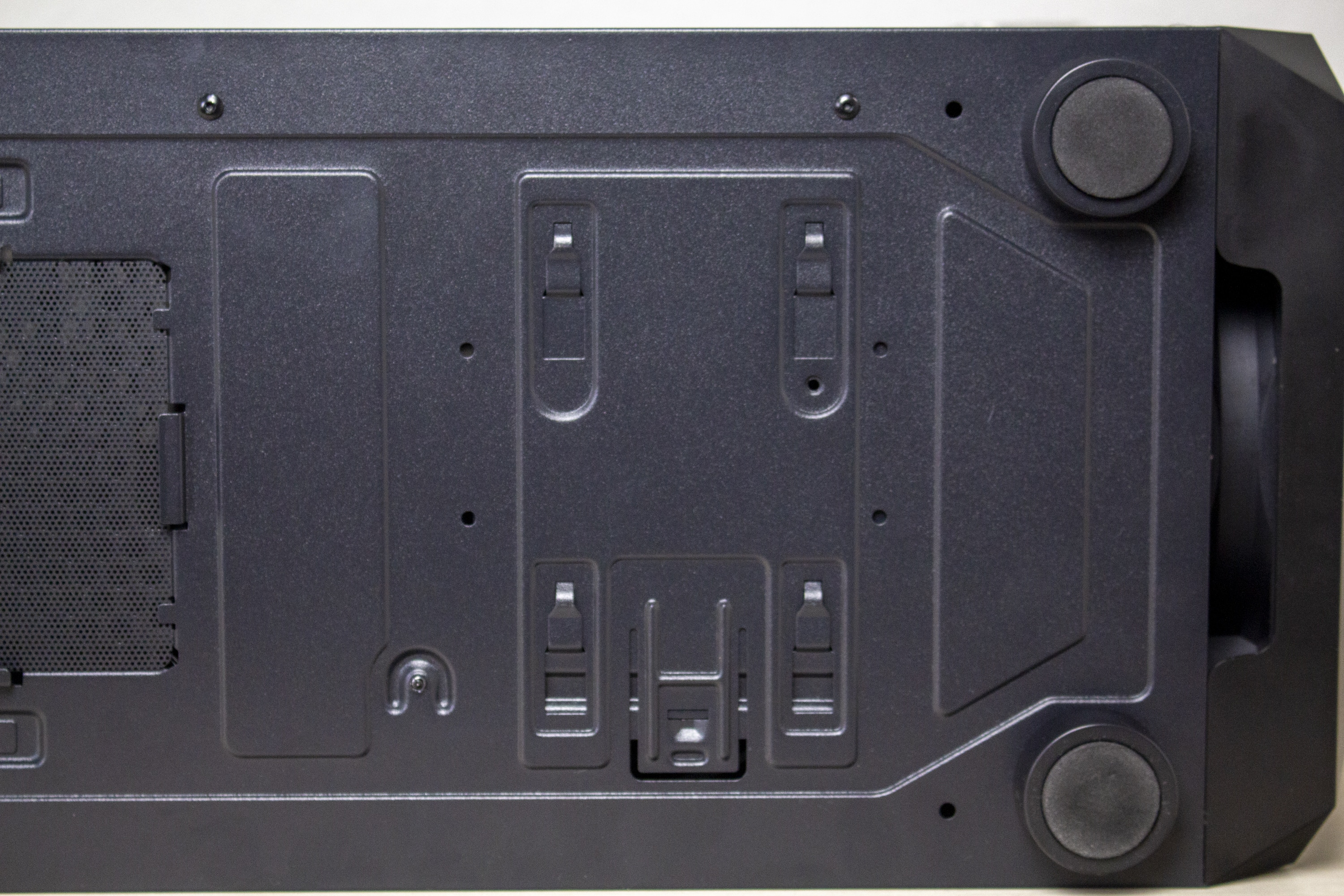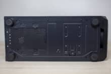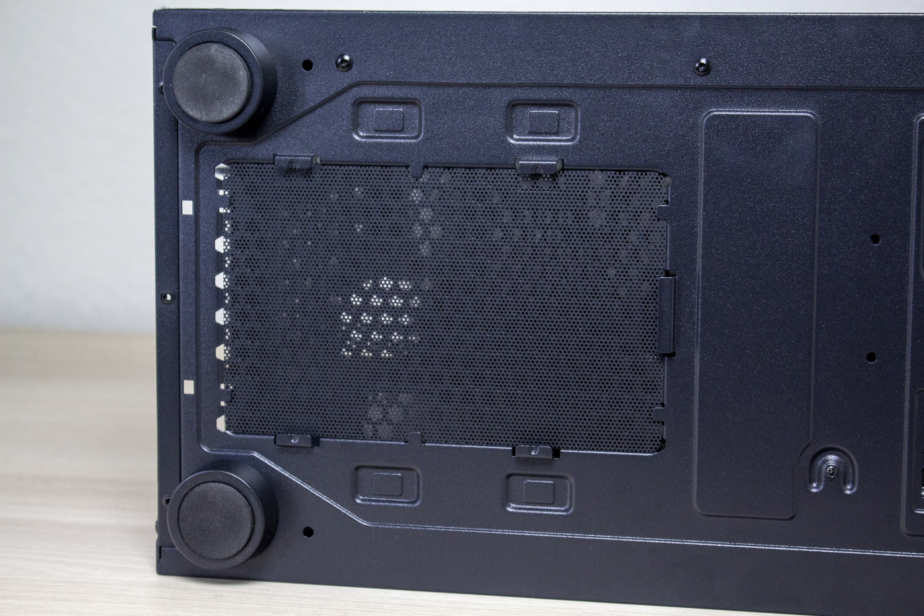 An der Unterseite des Gaming 804B Obsession_X erblickt man keine besonderen Überraschungen. Der Filter für das Netzteil besteht aus einfachem Mesh und lässt sich nur umständlich entfernen. Das Gehäuse bietet allerdings auch Stahllaschen für einen Staubfilter mit Kunststoffrahmen, der nach hinten ausgezogen werden kann. Genau den passenden Filter im Internet zu finden, dürfte sich aber als eine große Herausforderung darstellen. Einen sicheren Stand erhält der Midi-Tower über vier simple aber stabile Füße aus Kunststoff, die zusätzlich mit einer Schicht Gummi beklebt wurden.
