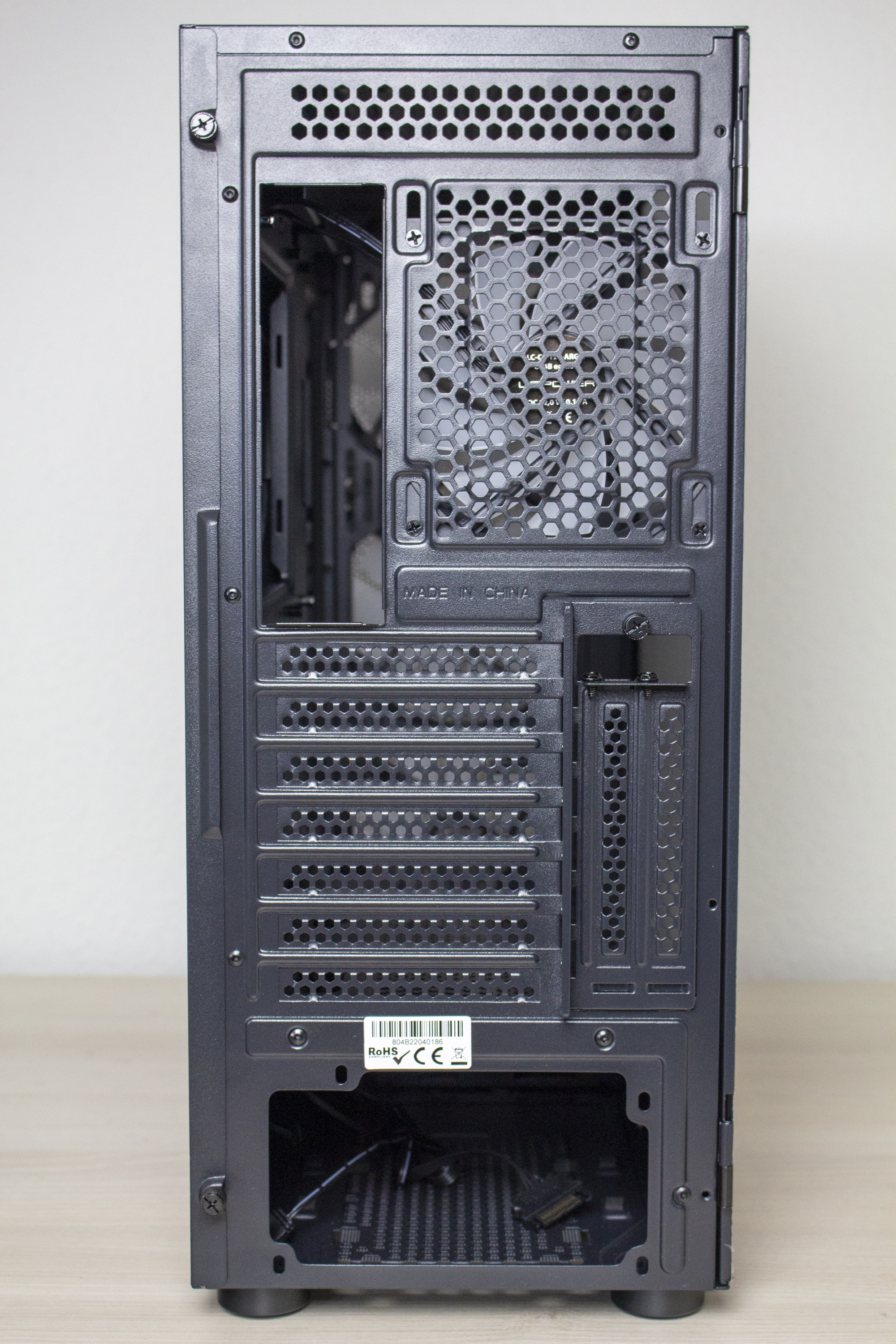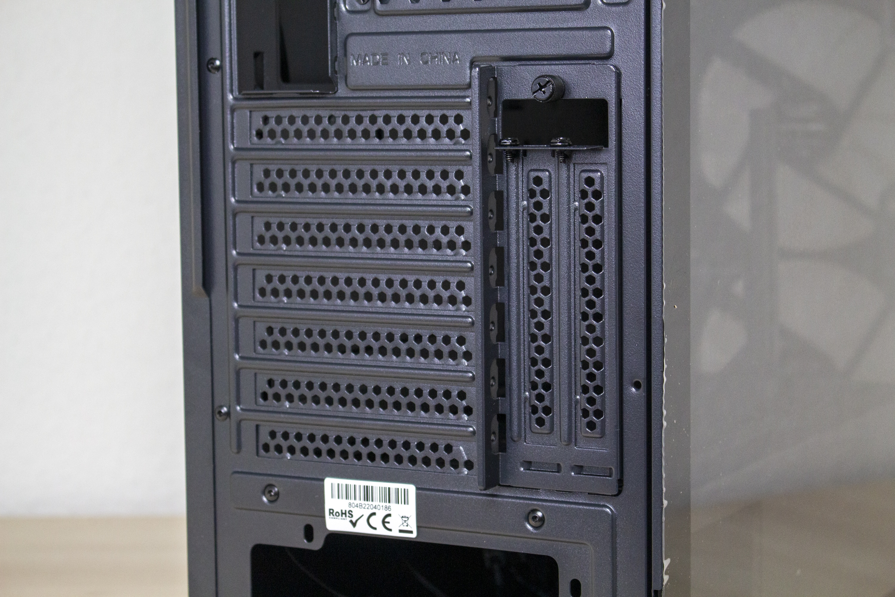 Die Rückseite des Gaming 804B Obsession_X zeigt ein aktuelles Erscheinungsbild für den typischen Midi-Tower. Das Netzteil wird unten montiert und saugt gefilterte Frischluft von unten an. Darüber finden sich sieben horizontale und zwei vertikale PCI-Slotblenden für Erweiterungskarten. Leider sind diese nicht wiederverwendbar und müssen herausgebrochen werden. Außerdem befinden sich keine Ersatzblenden im Lieferumfang. Für ein Gehäuse dieser Preisklasse ist das leider ein No-Go. Zu guter Letzt lässt sich an der Rückseite noch der vierte vorinstallierte ARGB-Lüfter mit einer Rahmenbreite von 120 Millimetern erkennen. Oberhalb des Lüfters gibt es zudem noch einige Zentimeter Platz bis zum Deckel.