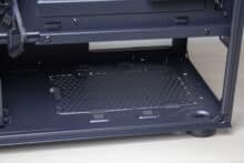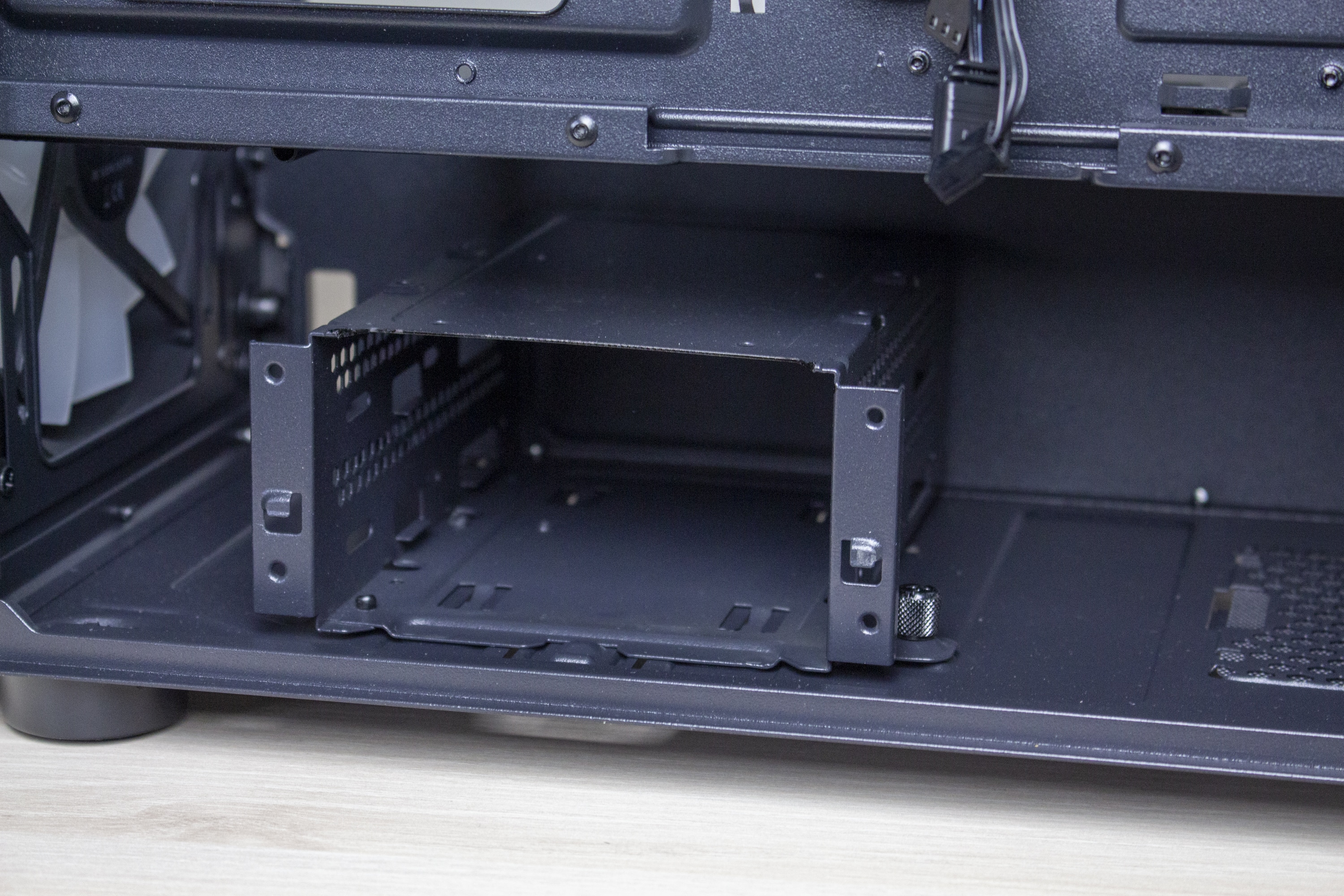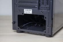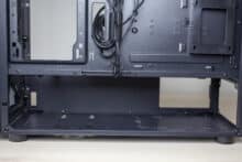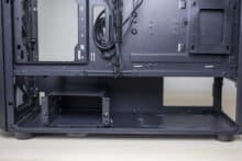 Wagen wir nun einen Blick unter die Netzteilabdeckung. Das Netzteil ruht auf vier dünnen Gummistreifen und davor wurde der modulare HDD-Käfig platziert. Dieser kann durch die Entfernung einer einzelnen Rändelschraube ausgebaut werden. Dadurch bietet die Kammer noch mehr Platz für Kabel. Ebenfalls nützlich sind die zwei großen Kabelklammern aus Kunststoff, die LC-Power zum Vorverlegen der Kabel des I/O-Panels verwendet hat. Ansonsten gibt es hinter dem Mainboard-Tray keine besonders aufregenden Features. Für weitere Kabel stehen 23 bis 36 Millimeter Platz und zahlreiche Ösen zum Verzurren der Kabelbinder zur Verfügung.