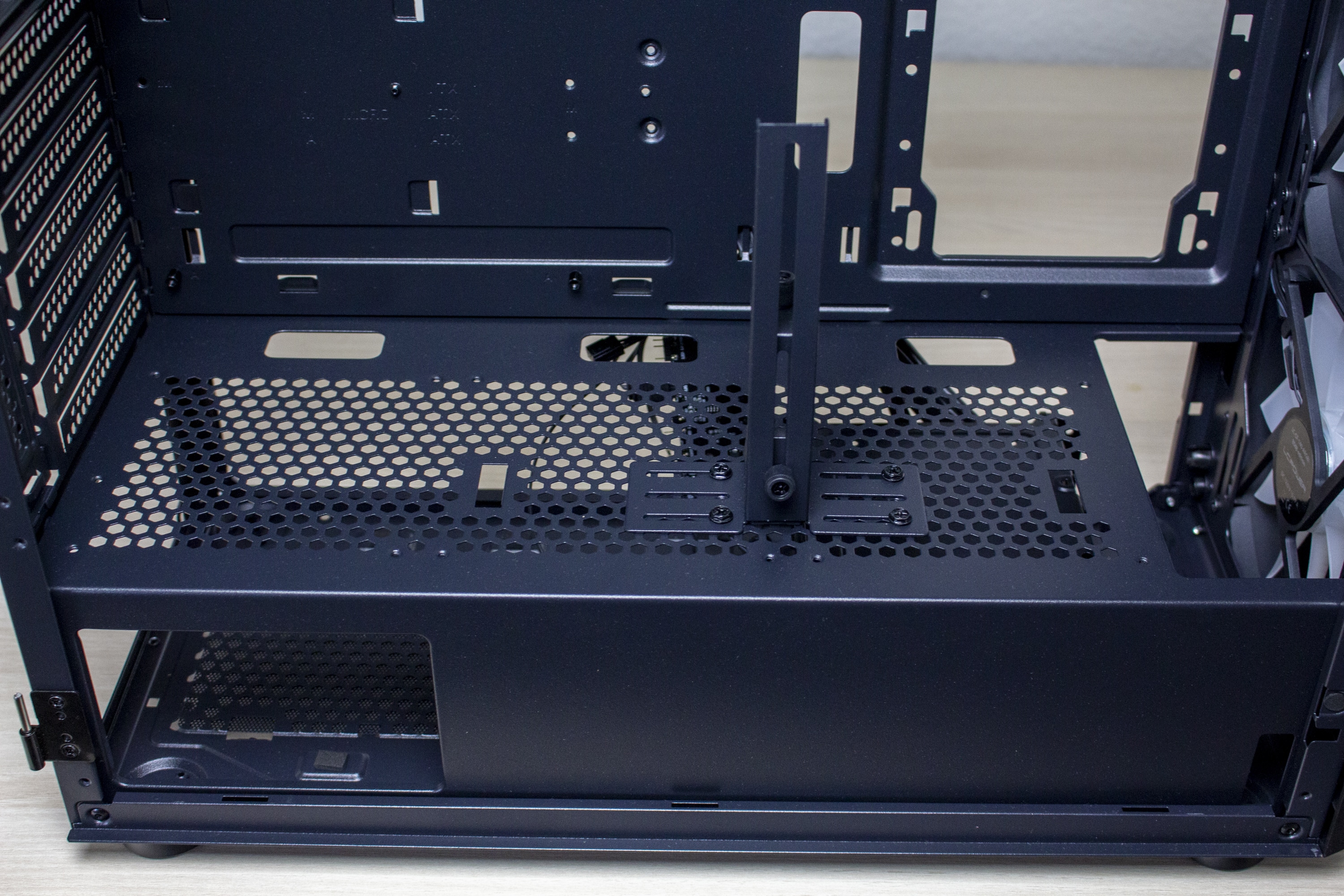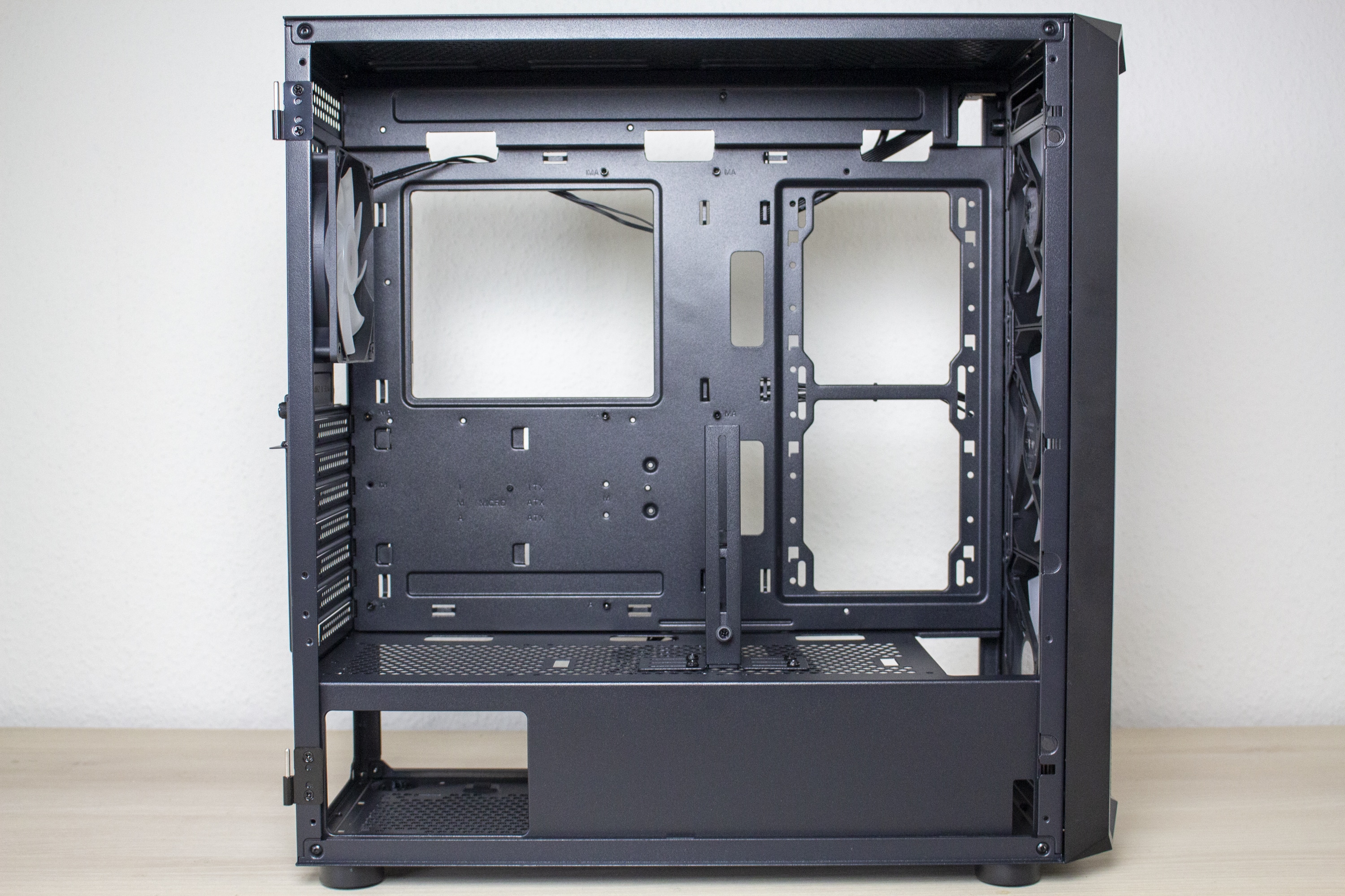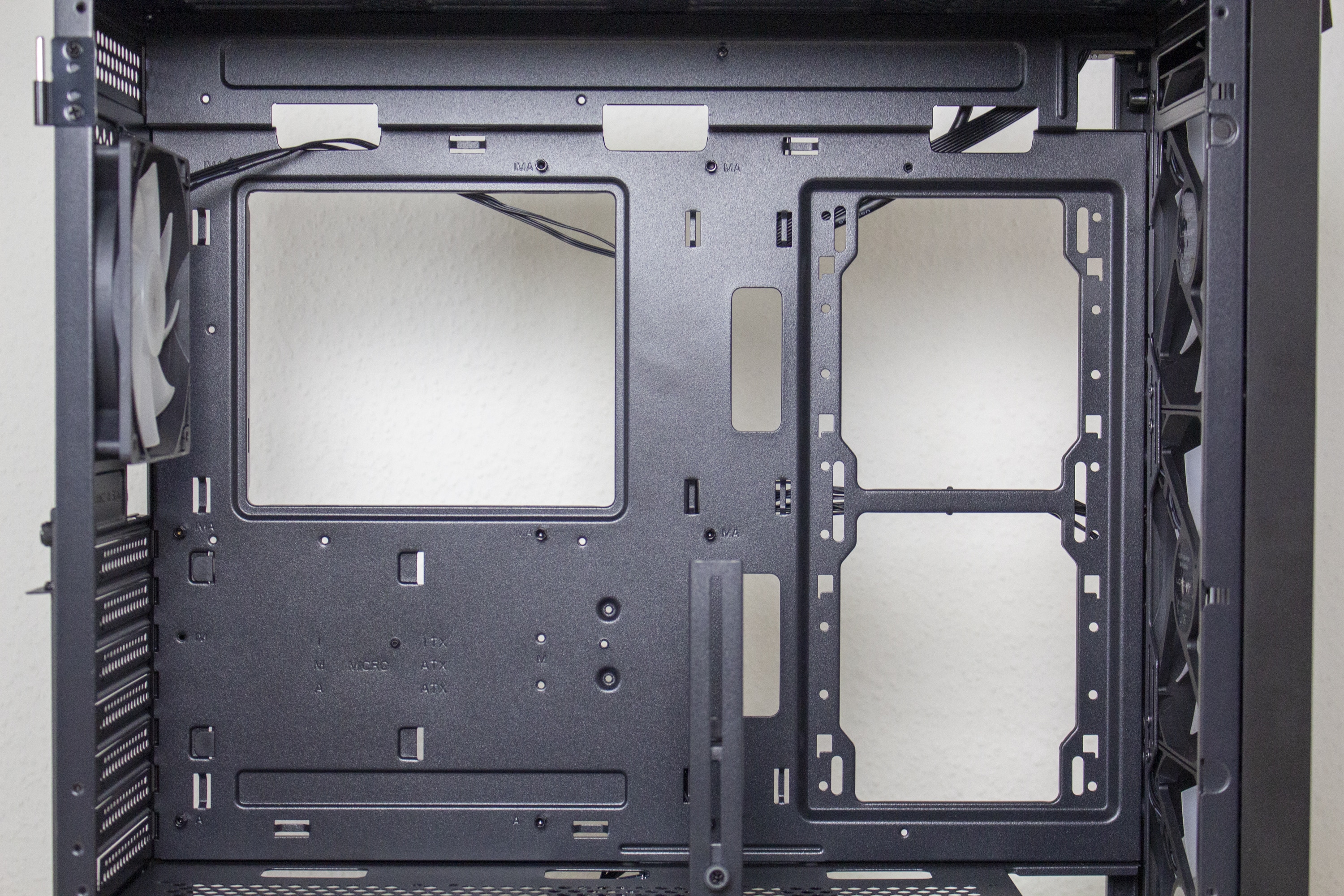 Der Innenraum ist generell in eine große und eine kleine Kammer unterteilt. Diese Unterteilung erfolgt über eine Netzteilabdeckung, auf dessen Gestaltung wir später nochmal genauer eingehen. Die große Hauptkammer verfügt über ein planes Mainboard-Tray, welches über neun vorinstallierte Abstandshalter, sechs Kabelmanagement-Öffnungen und einen Ausschnitt für die nachträgliche Montage von CPU-Kühlern mit Backplate verfügt. Darüber hinaus lässt sich auf der rechten Seiten des Trays ein Montageplatz für zwei 120-mm-Lüfter oder einen 240-mm-Radiator erkennen.