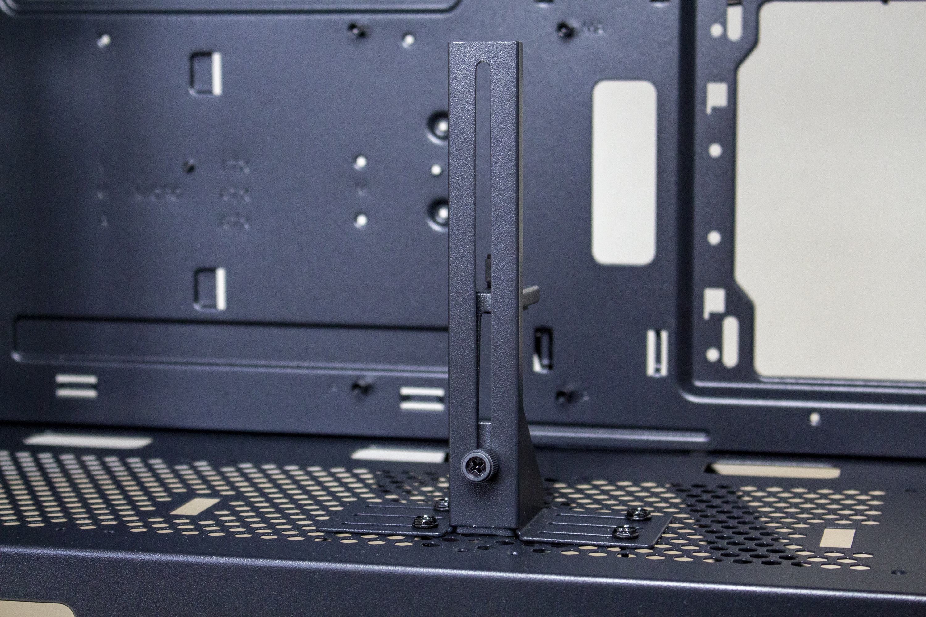 Ähnlich löchrig geht es bei der Netzteilabdeckung weiter. Diese ist oberhalb vollständig perforiert und bietet Montagepunkte für drei weitere 120-mm-Lüfter. Die notwendigen Lüfterschrauben sind aber leider nicht Teil des Montagezubehörs. Analog zum Mainboard-Tray verfügt auch die Abdeckung über diverse Öffnungen zum Verlegen vom Kabeln, zur Präsentation des Netzteils und zum Einbau eines Frontradiators. Ein letztes besonderes Feature bietet das Gaming 804B Obsession_X mit der modularen GPU-Halterung. Der Halter besteht aus Metall und kann nach links bzw. rechts sowie nach oben bzw. unten verschoben werden. Über zwei Arme mit Gummibeschichtung kann die Grafikkarte eingeklemmt werden.