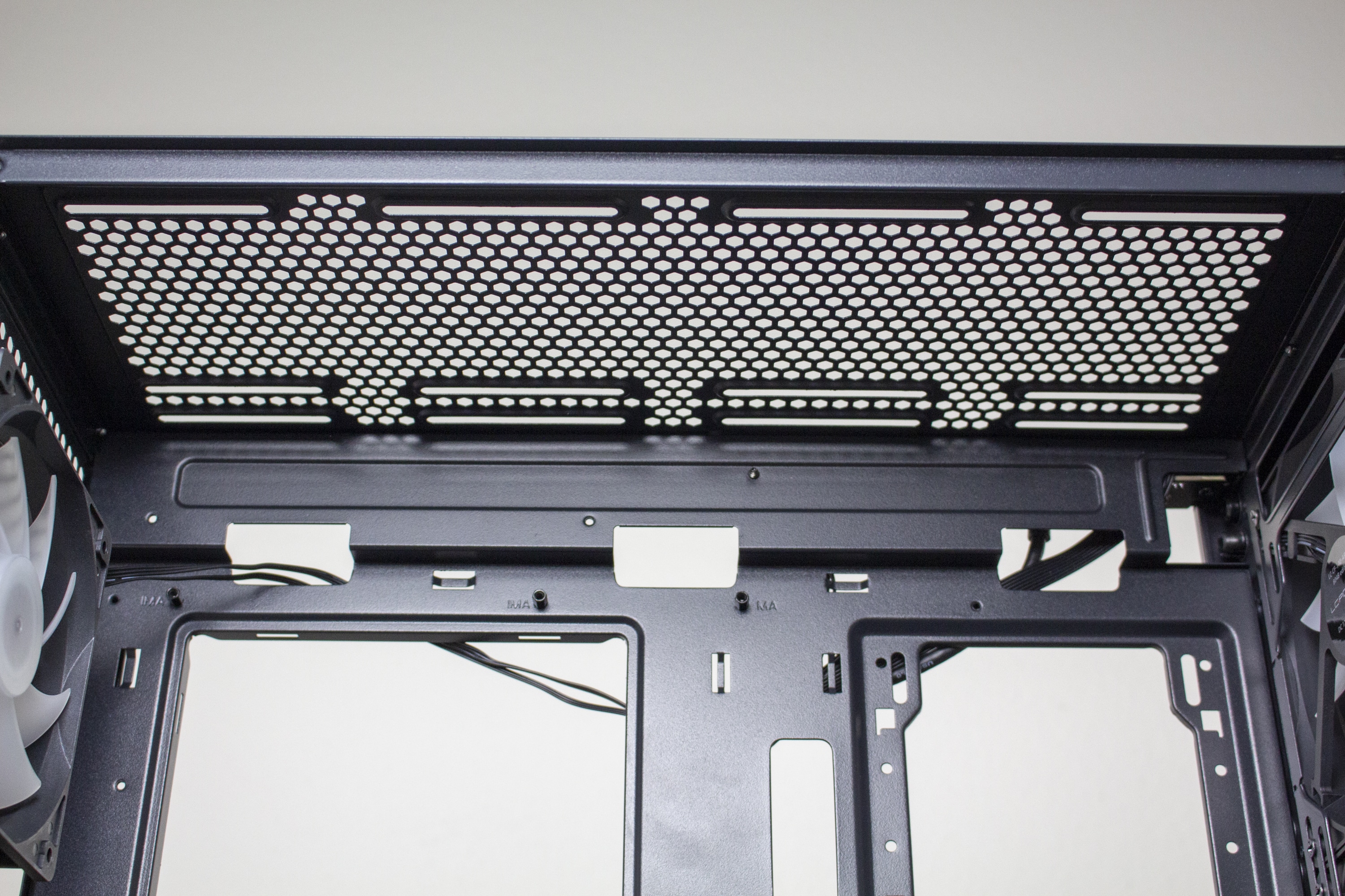 Auch im Gehäusedeckel geht es luftig weiter. So verfügt dieser über ein großes Lüftergitter, welches ebenfalls Platz für drei 120-mm- oder drei 140-mm-Lüfter bzw. entsprechende Radiatoren hat. Zum Schutz vor Staub und zur Verbesserung der Optik wurde oberhalb des Gitters zudem ein Staubfilter aus Mesh platziert. Ebenfalls im Deckel wurde das längliche I/O-Panel untergebracht. Dieses verfügt über einen USB-3.2-Typ-C- sowie zwei USB-3.0-Typ-A-Anschlüsse, zwei Buchsen für Kopfhörer bzw. Mikrofon sowie drei Taster für Power, Reset und die RGB-Steuerung.