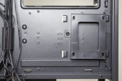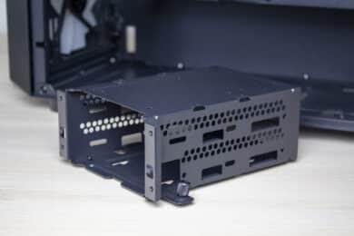 In diesem Gehäuse können ab Werk insgesamt vier Datenträger verbaut werden. Drei dieser vier Exemplare finden dazu einen Platz im modularen HDD-Käfig. Dieser bietet Raum für drei 3,5″- oder zwei 3,5″- und eine 2,5″-HDD. Wer noch mehr Speicherplatz benötigt, der kann im entsprechenden Montagerahmen hinter dem Mainboard-Tray eine weitere 2,5″-SSD verbauen. In allen Fällen benötigt man zur Montage einen Schraubendreher und eine Entkopplung gibt es nicht.