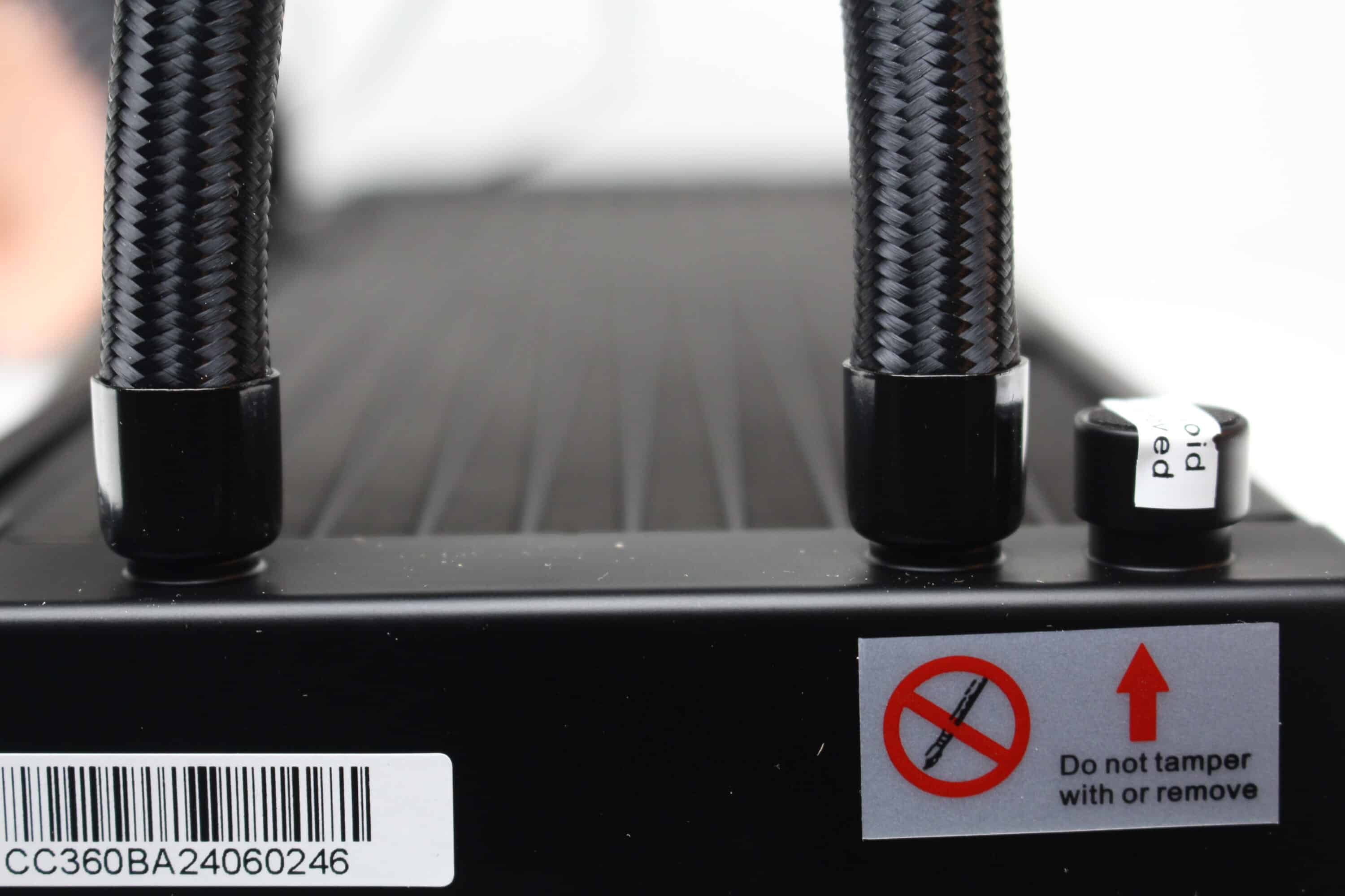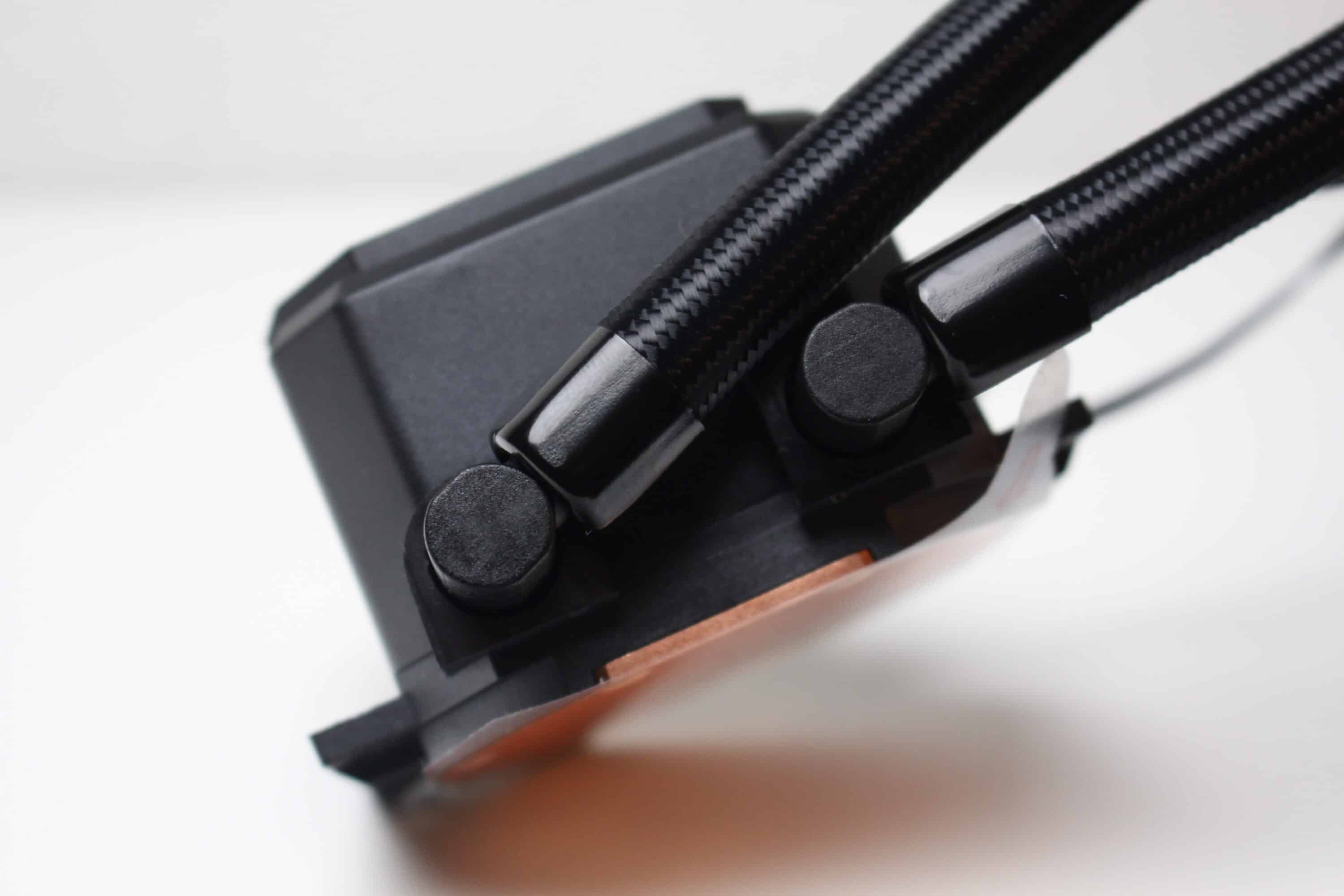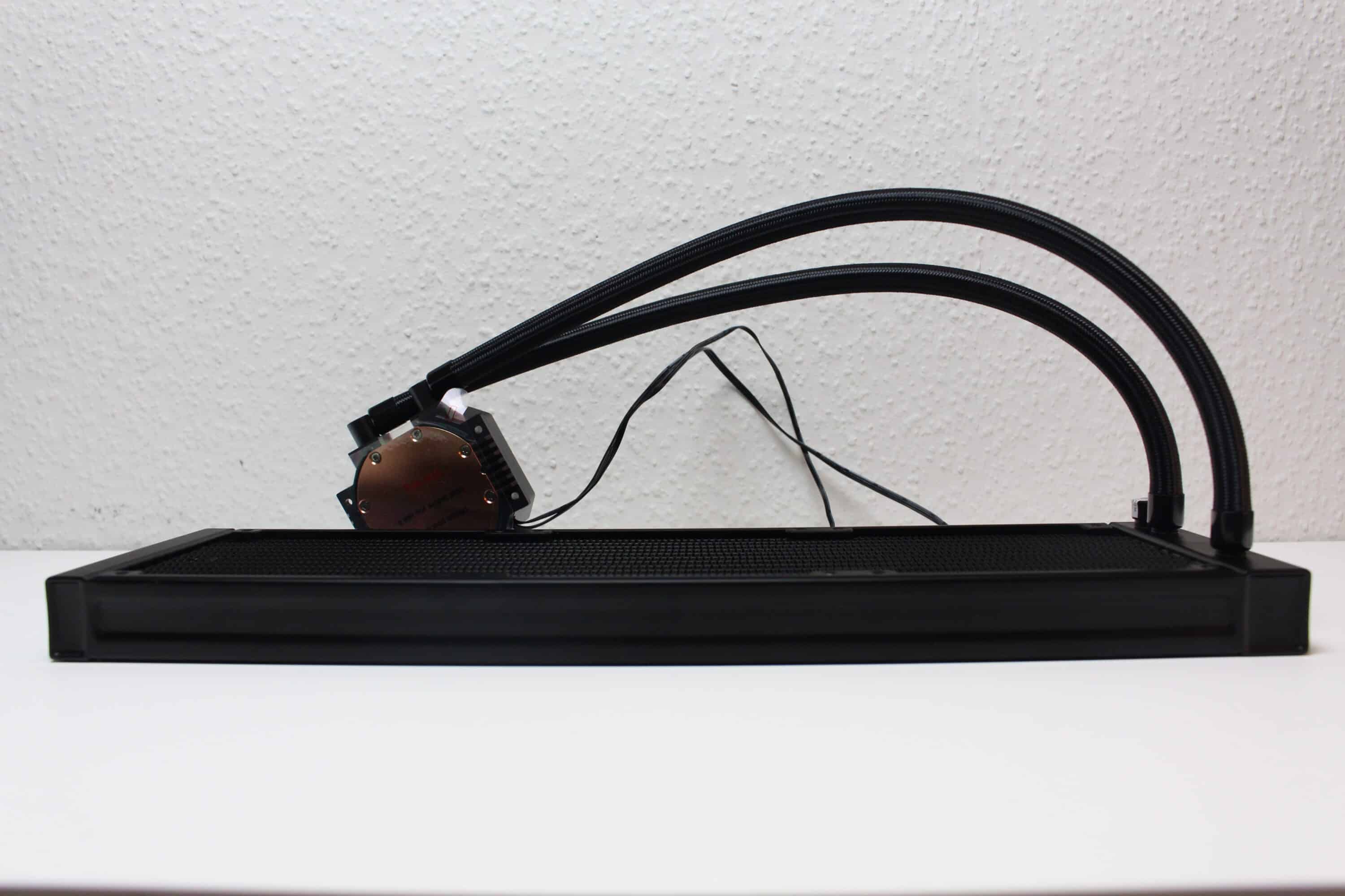 Die Verbindung zwischen Pumpe und Radiator erfolgt über zwei circa 400 Millimeter lange Schläuche, die Verbesserung der Optik mit einem engmaschigem Nylon-Sleeve ummantelt sind. Am Radiator wurden die Schläuche in feste Metallmuffen gepresst und können nicht entfernt werden. Auf der Seite des Pumpenblocks enden die Schläuche in zwei sehr beweglichen Gelenken, bei denen ebenfalls Metallmuffen zum Einsatz kommen. Eine Erweiterung oder Neubefüllung der Kompaktwasserkühlung ist somit nicht möglich.
